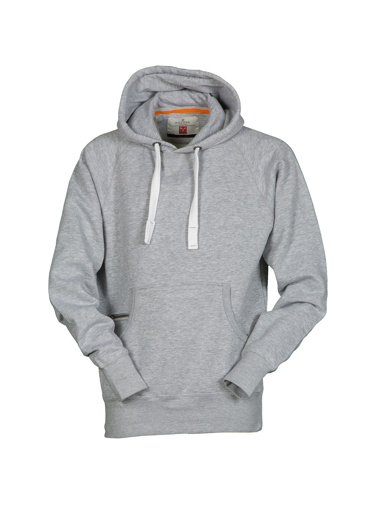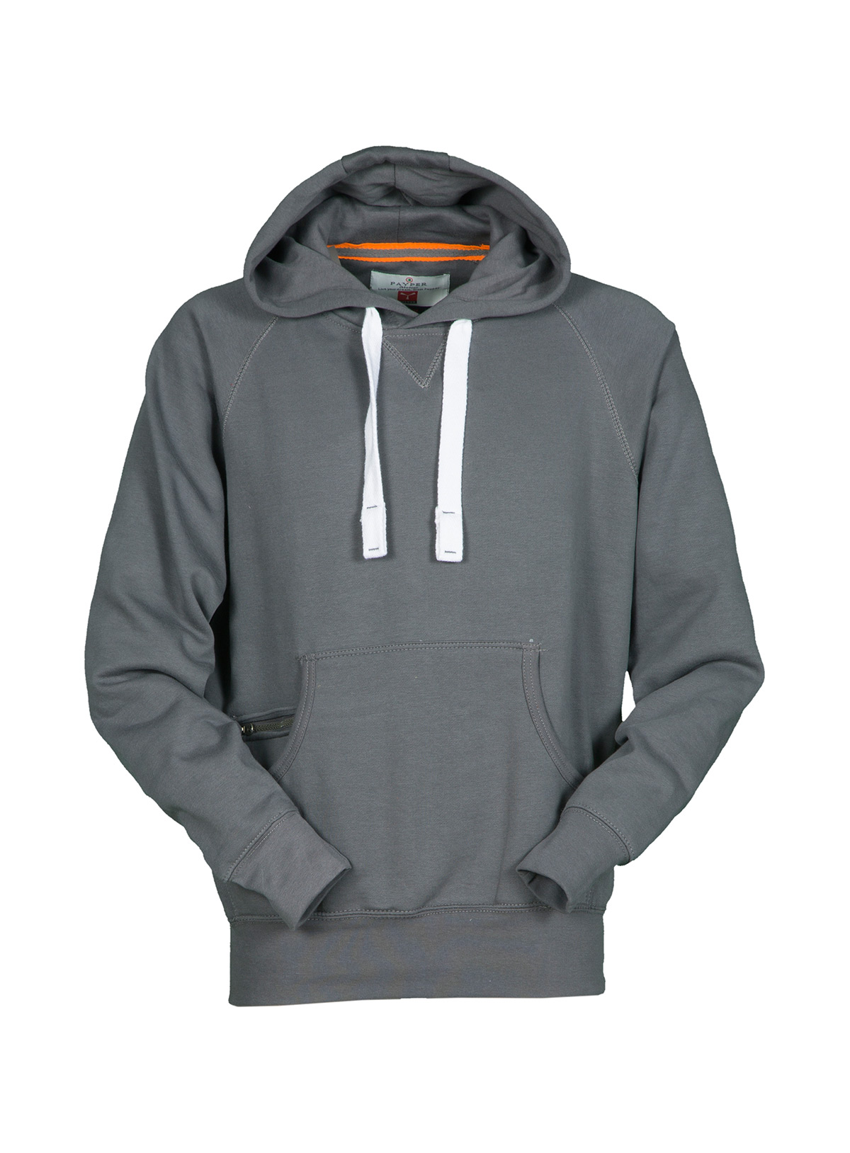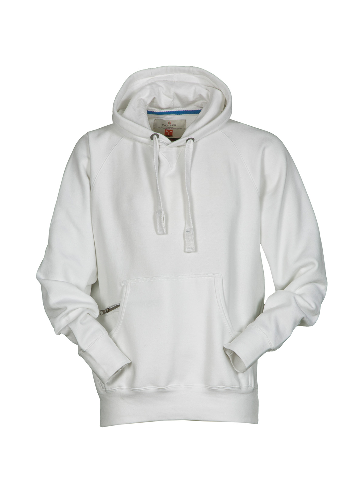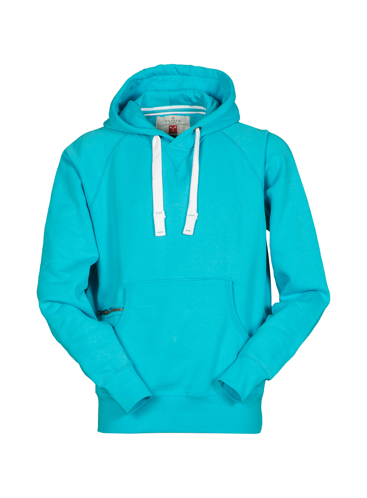 Felpa da uomo con manica raglan e cappuccio in tinta con coulisse bianca in corda con cuciture in contrasto e anelle in metallo, cucitura estetica a V al collo, tasche a marsupio, taschino con secur zip, polsini e vita in costina elasticizzata, cuciture rinforzate.