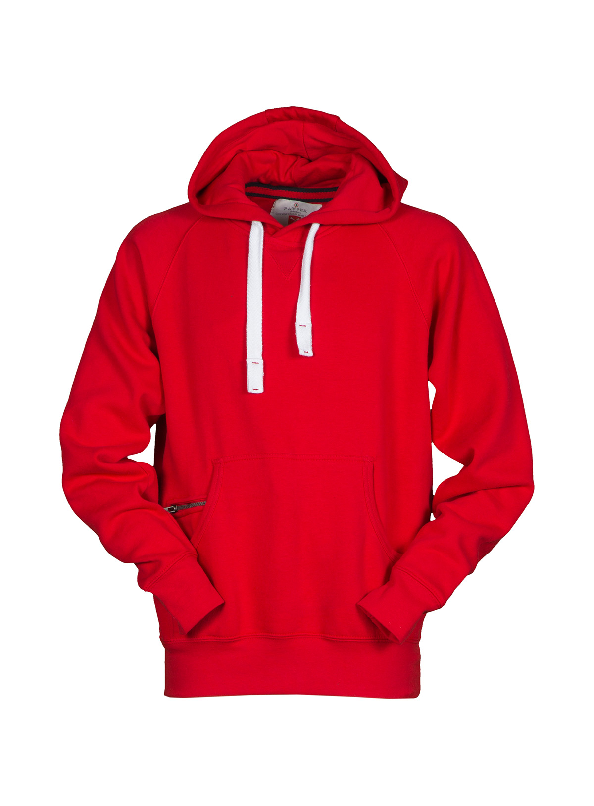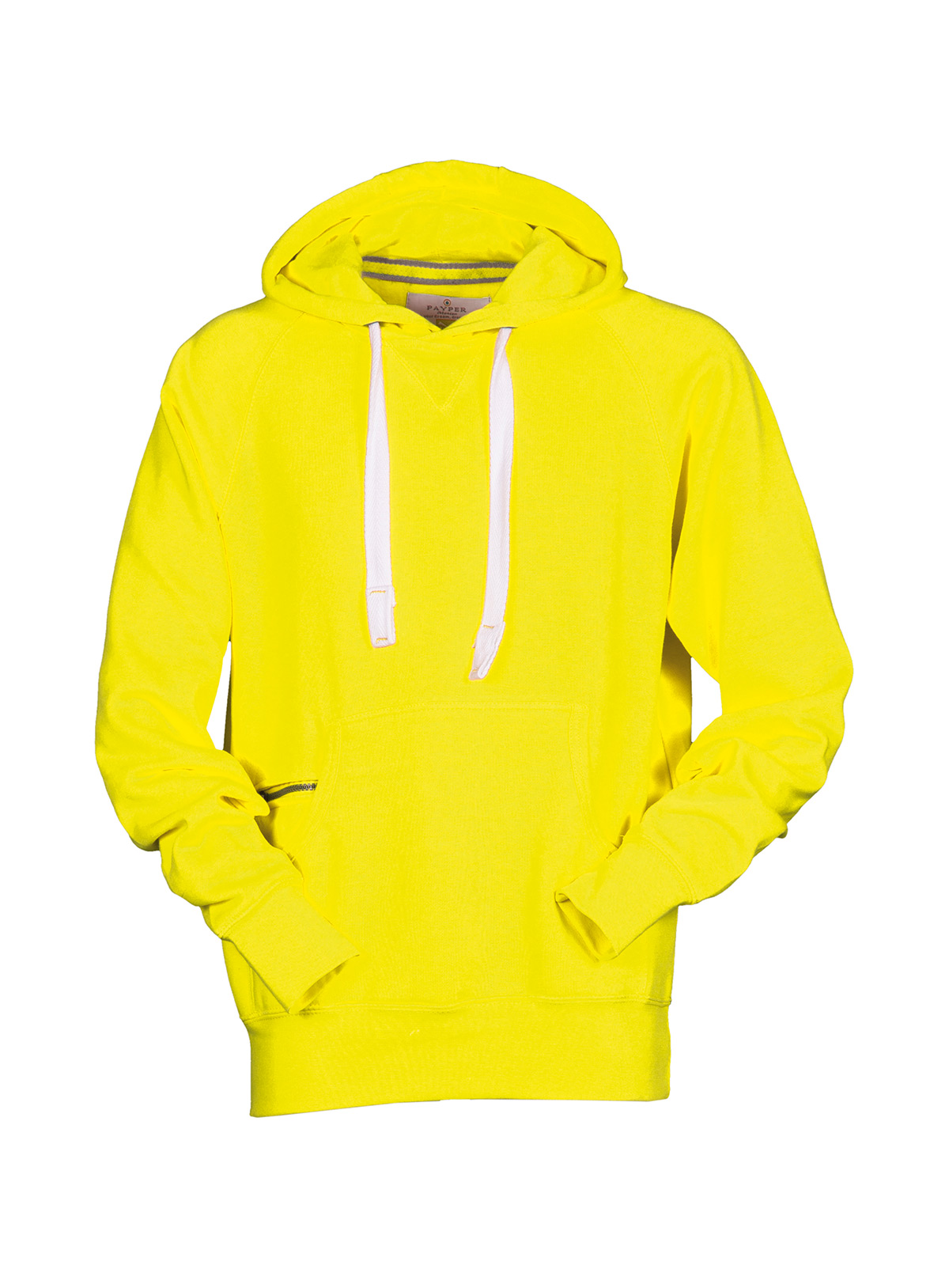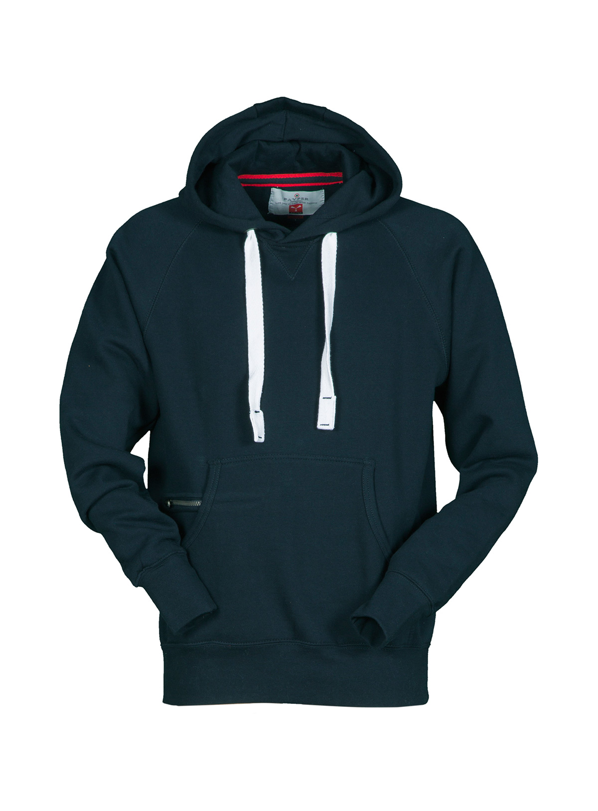 Felpa da uomo con manica raglan e cappuccio in tinta con coulisse bianca in corda con cuciture in contrasto e anelle in metallo, cucitura estetica a V al collo, tasche a marsupio, taschino con secur zip, polsini e vita in costina elasticizzata, cuciture rinforzate.