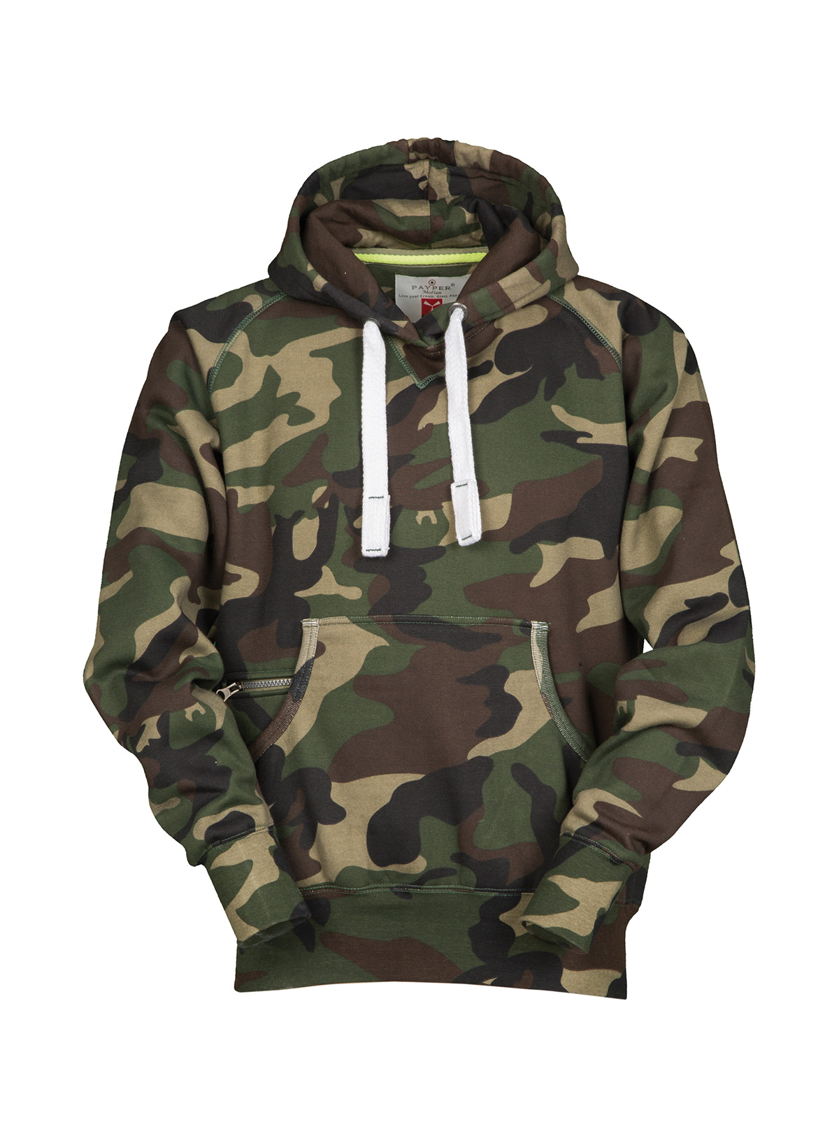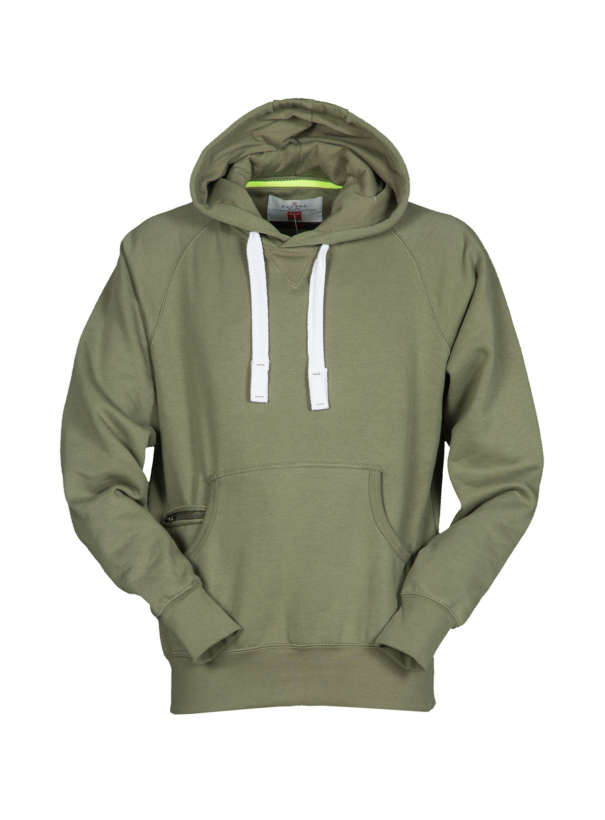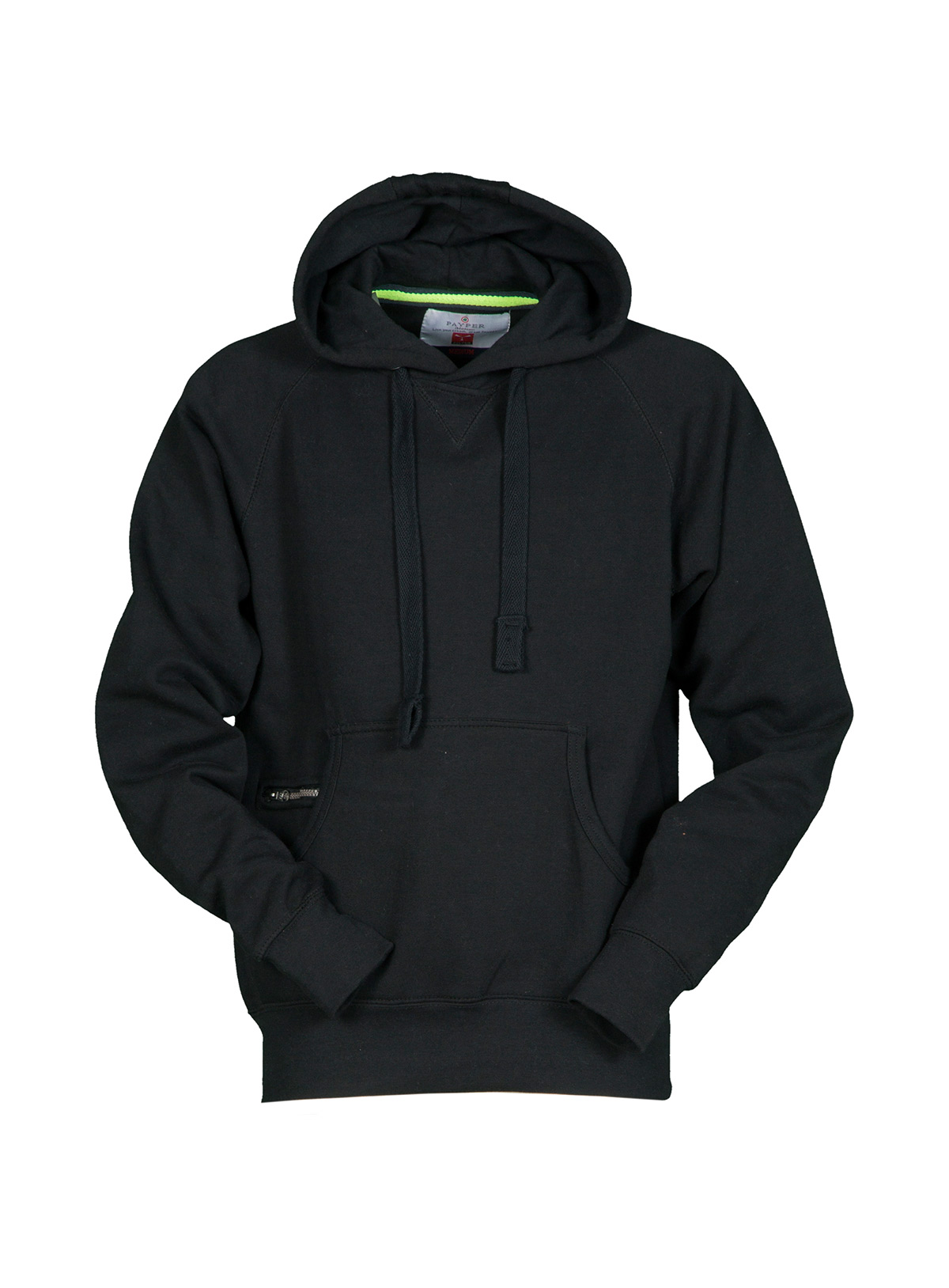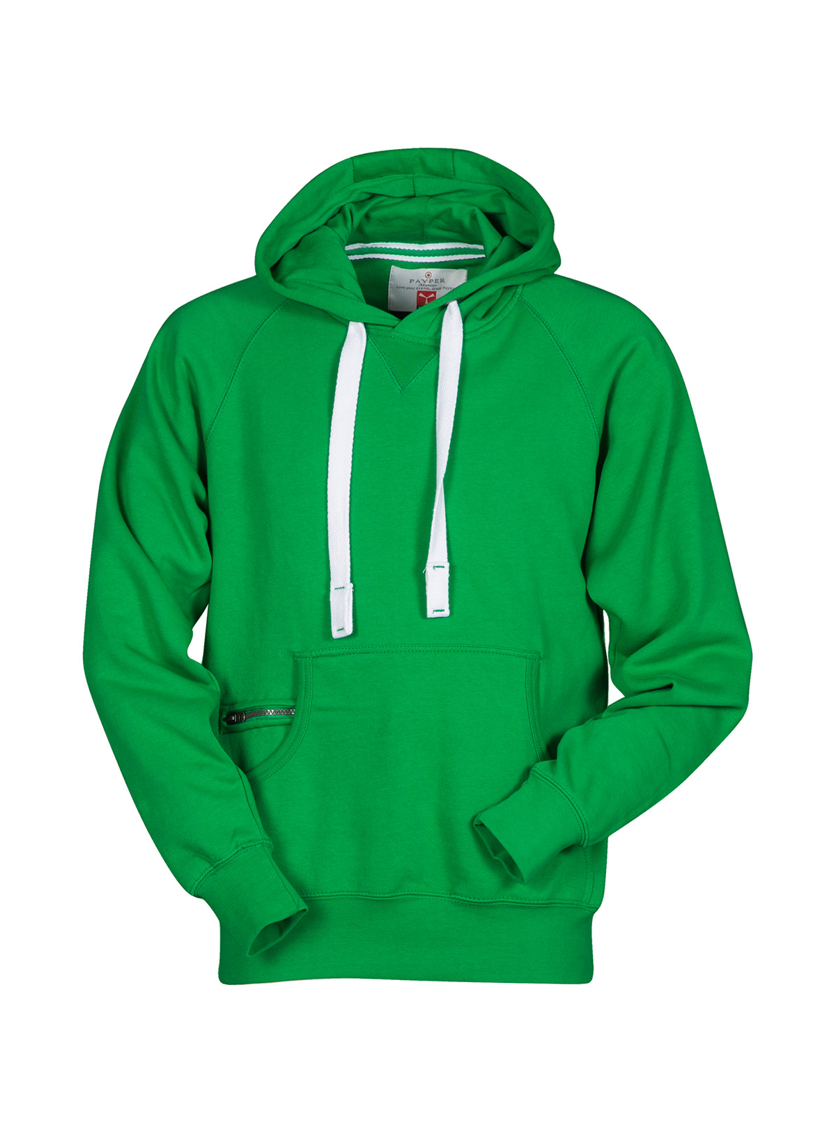 Felpa da uomo con manica raglan e cappuccio in tinta con coulisse bianca in corda con cuciture in contrasto e anelle in metallo, cucitura estetica a V al collo, tasche a marsupio, taschino con secur zip, polsini e vita in costina elasticizzata, cuciture rinforzate.