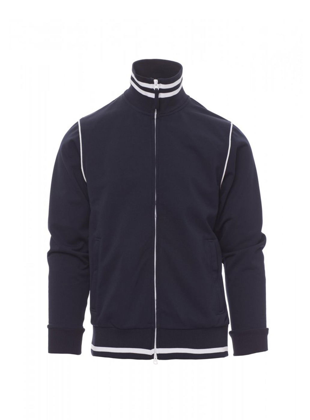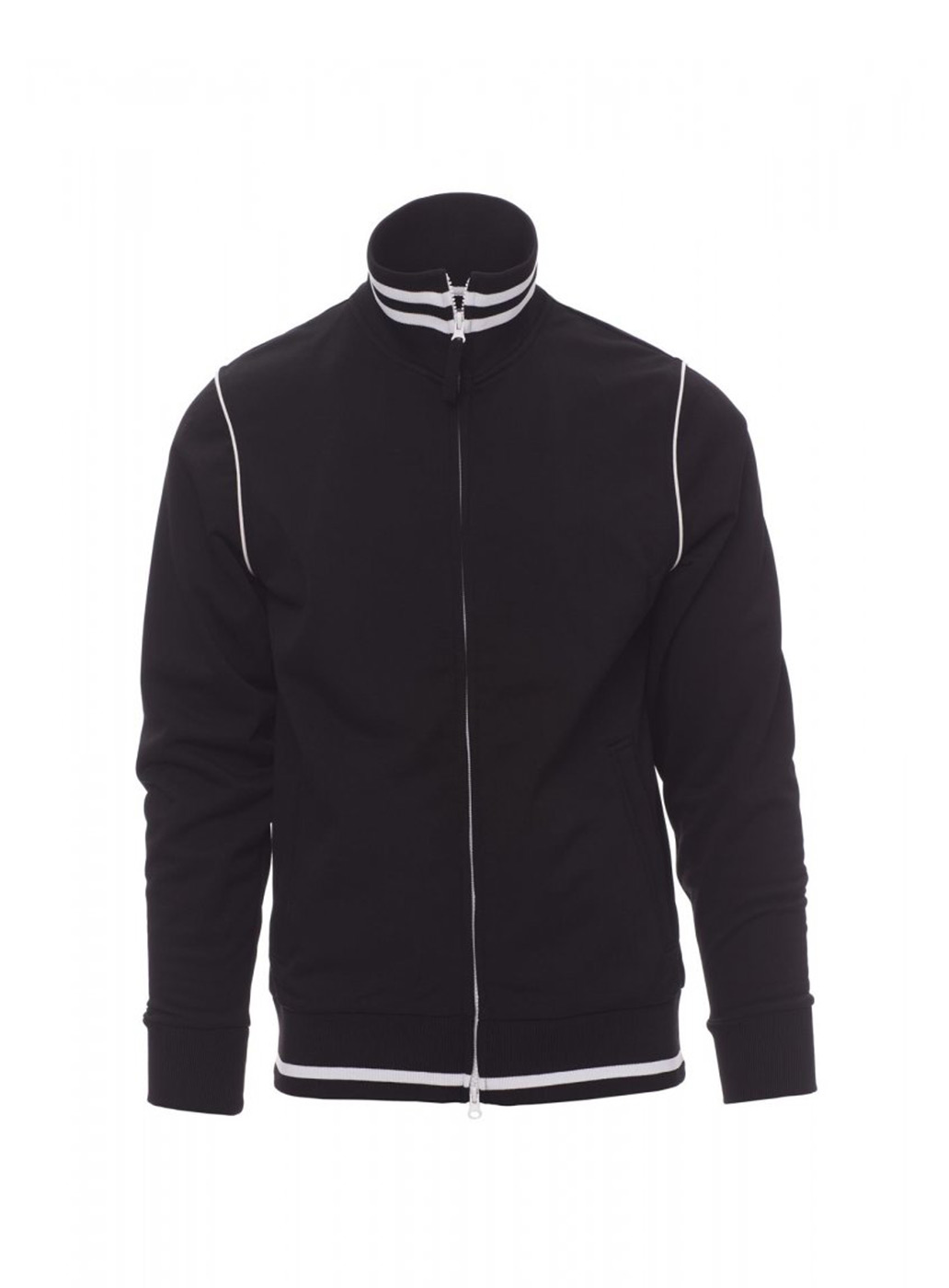 Felpa a zip intera coperta con doppio cursore; colletto e vita in rib con righe a contrasto, polsini in costina elasticizzata, piping nel giromanica, due tasche laterali con zip, cuciture rinforzate, nastratura del collo a contrasto e lavorazione esterna a piquet per una maggiore traspirabilità del tessuto.