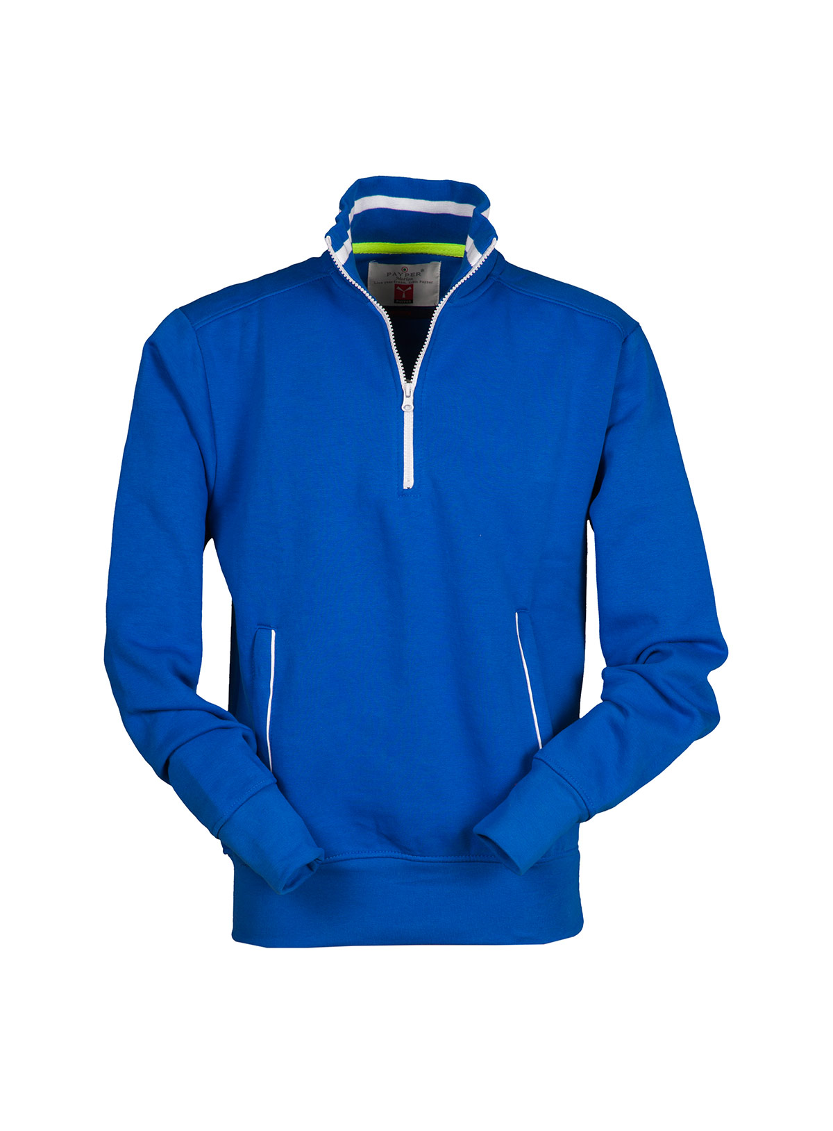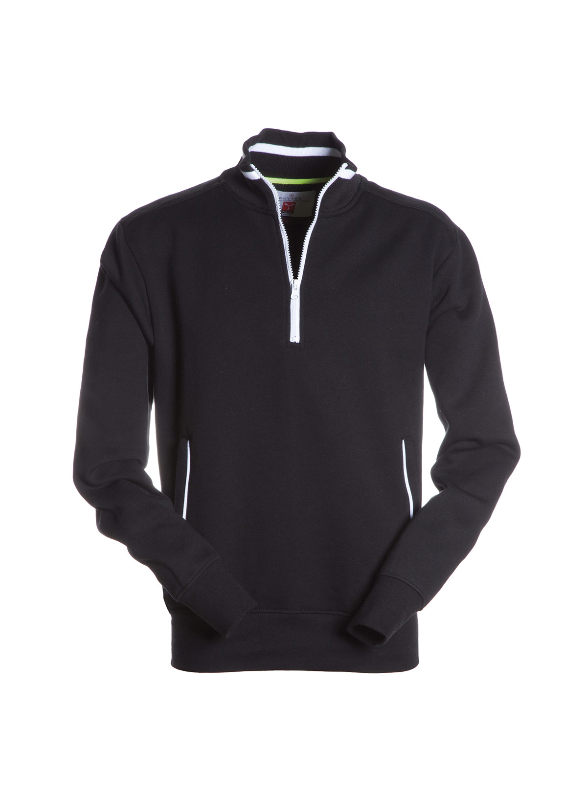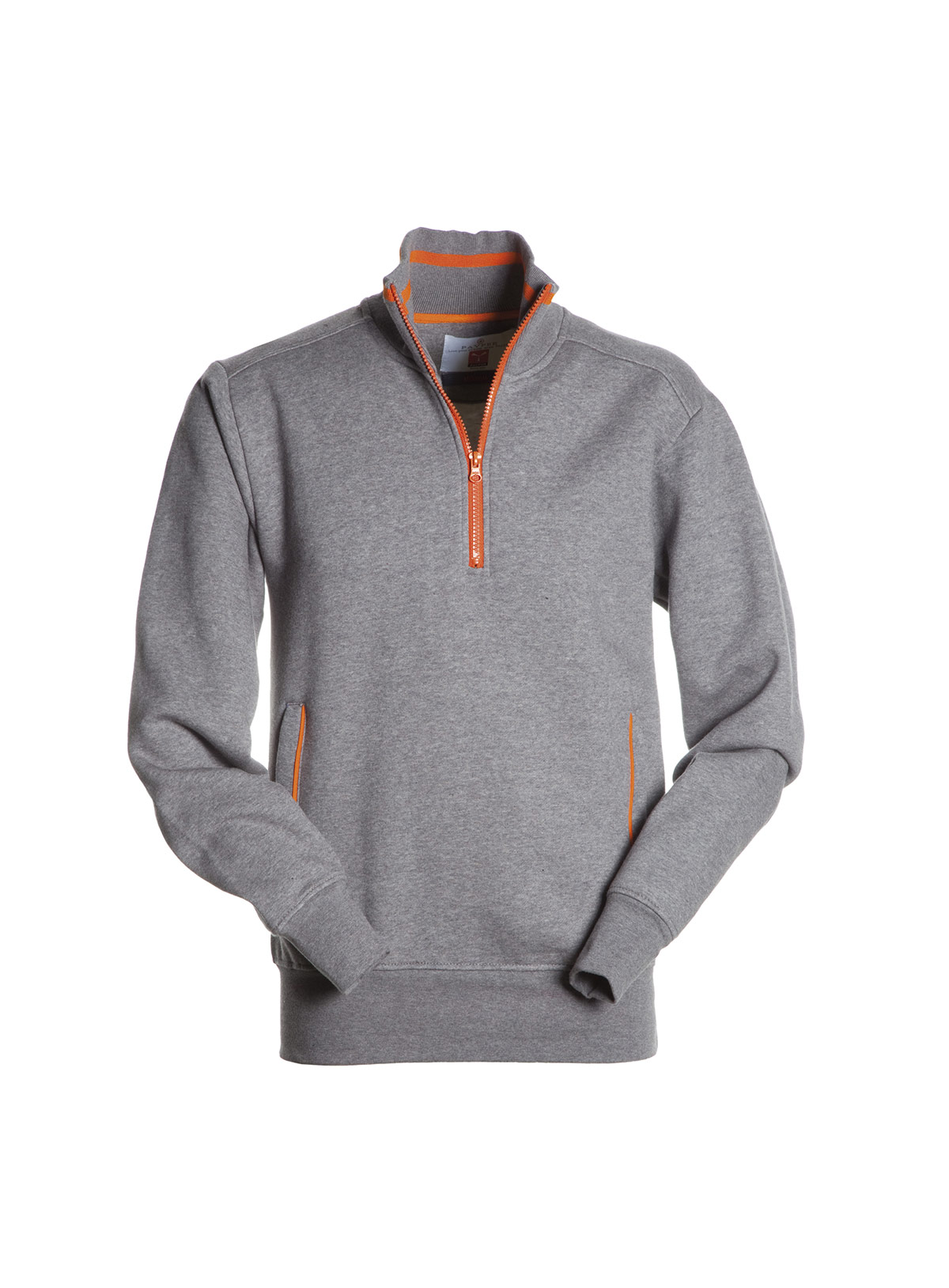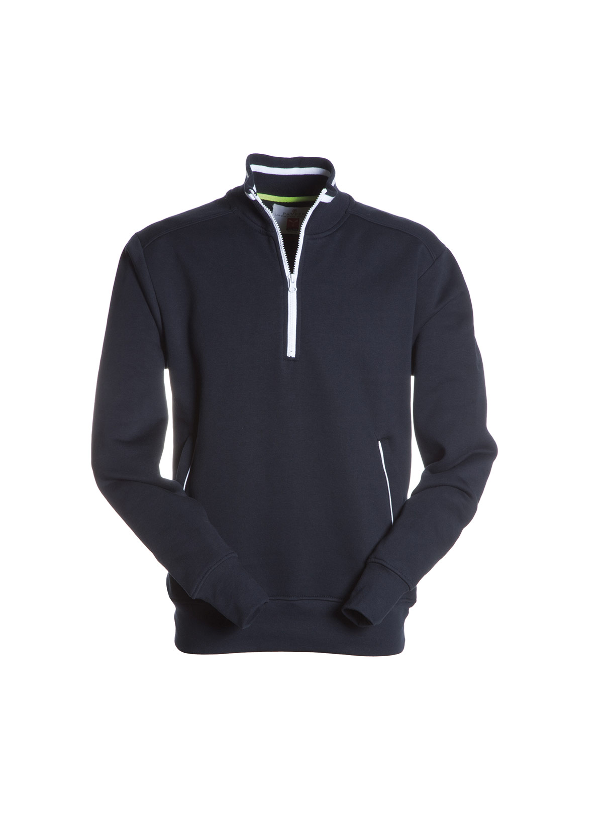 Felpa a mezza zip, colori a contrasto sulla zip, nel colletto e nelle cerniere delle tasche laterali; polsini e vita in costina elasticizzata, doppia cucitura al collo, alle maniche e in vita e nastro di rinforzo al collo.