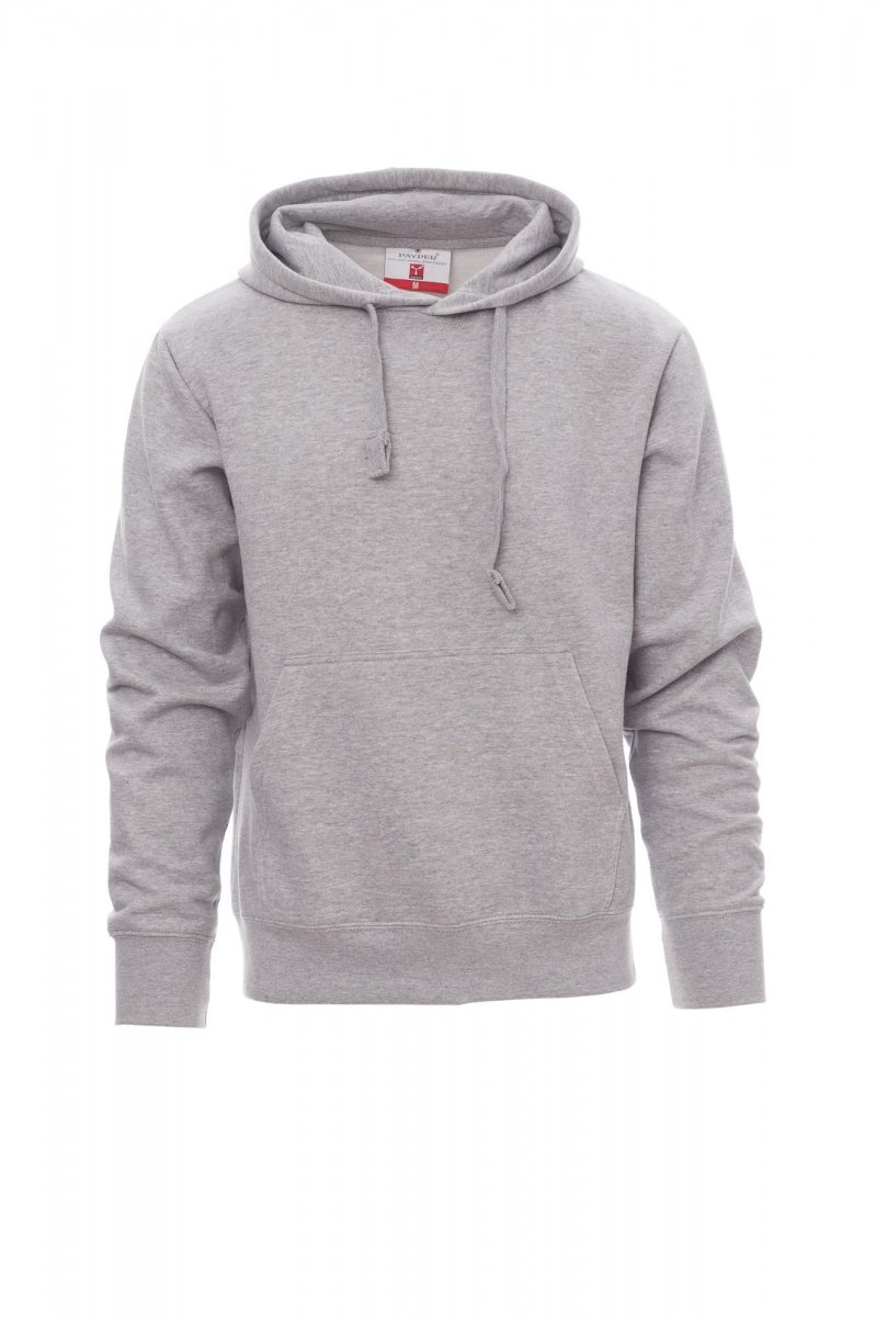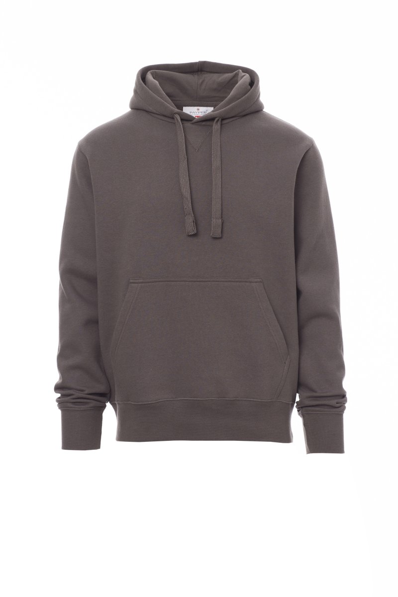 Felpa da uomo con cappuccio, cordino cappuccio in tinta, cucitura estetica a V al collo, tasche a marsupio, polsini e vita in costina elasticizzata, cuciture rinforzate. Nastro di rinforzo interno collo in tinta.