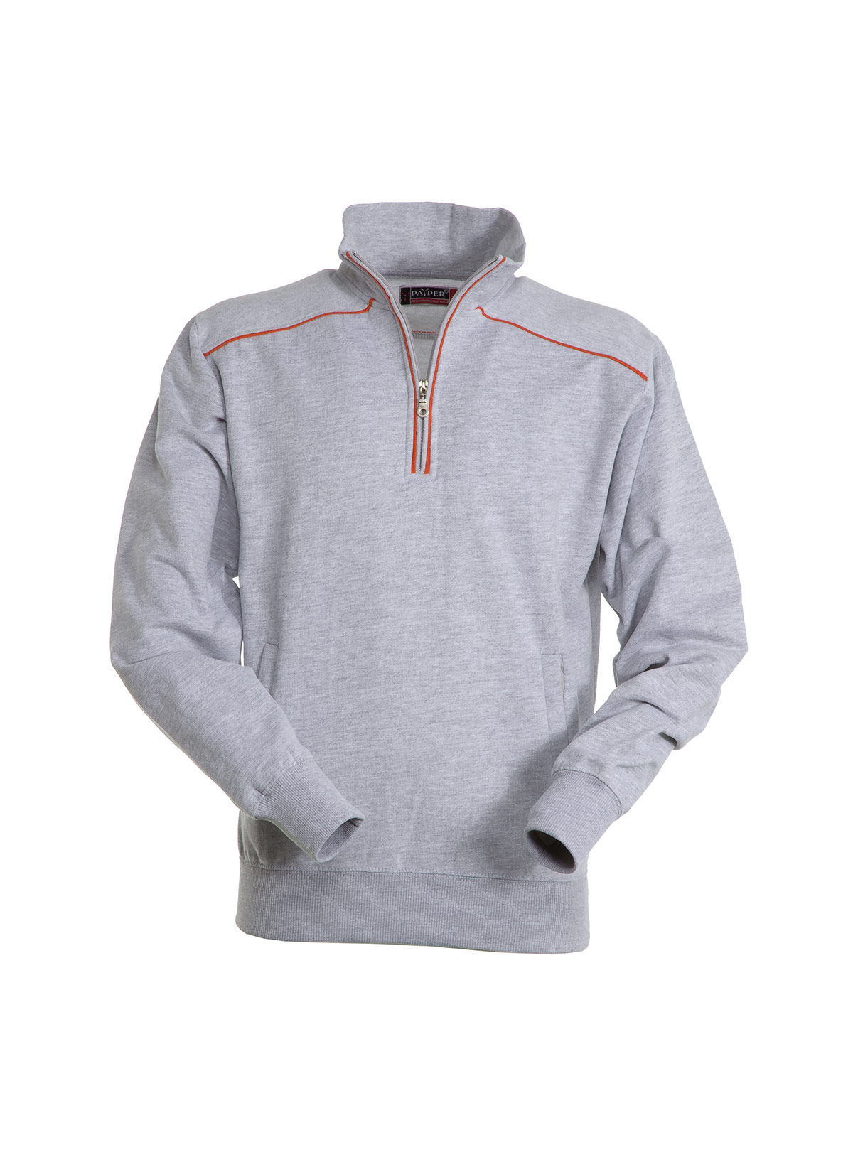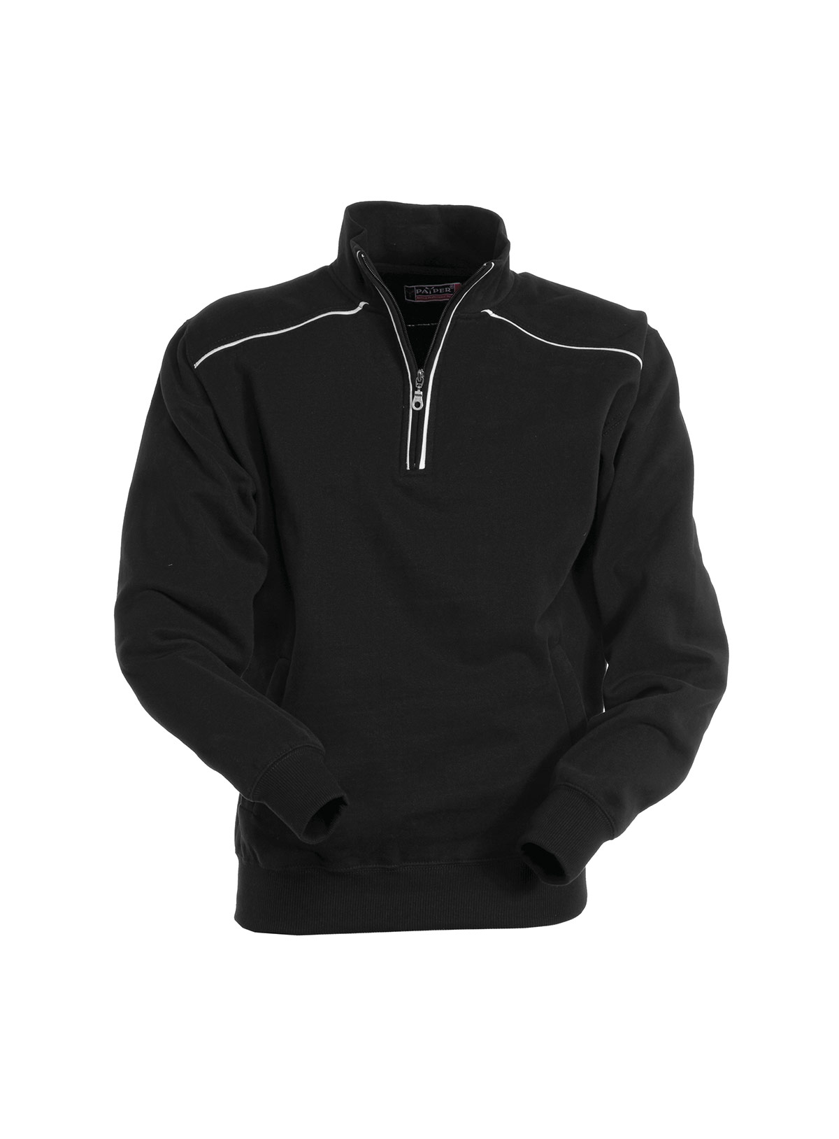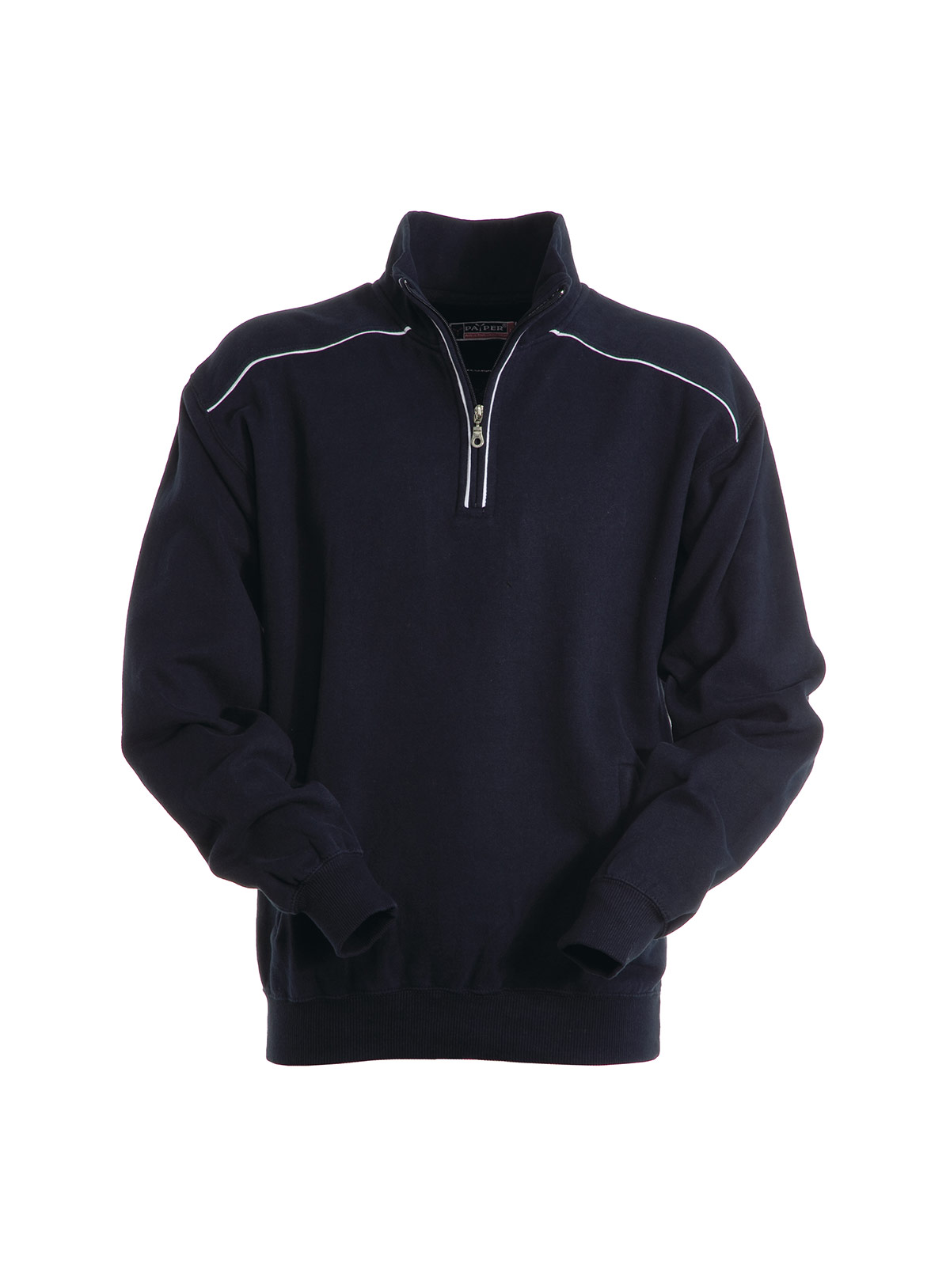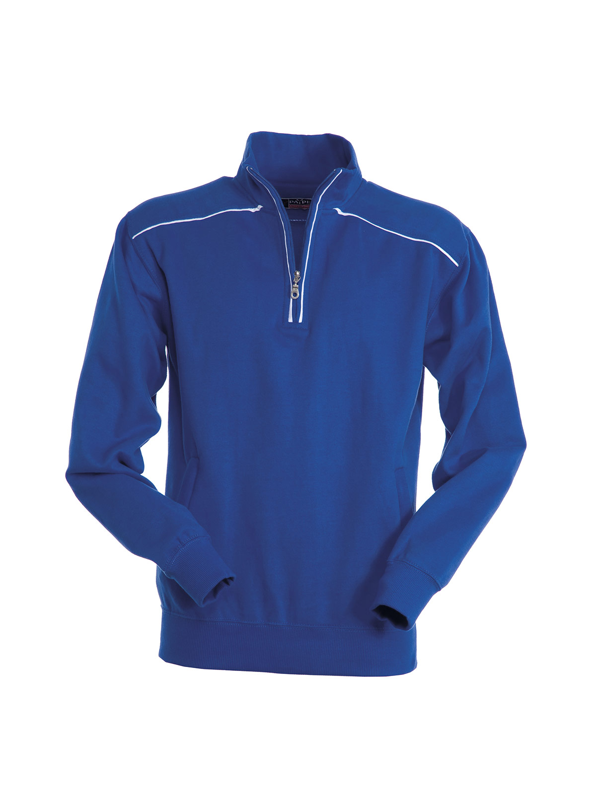 Felpa a mezza zip con profili a contrasto alle spalle e a bordo cerniera; polsini e vita in costina elasticizzata, due tasche con zip, doppia cucitura a collo, maniche e in vita e nastro di rinforzo al collo; fine lavorazione di garzatura esterna che aumenta la proprietà di isolamento termico del tessuto.