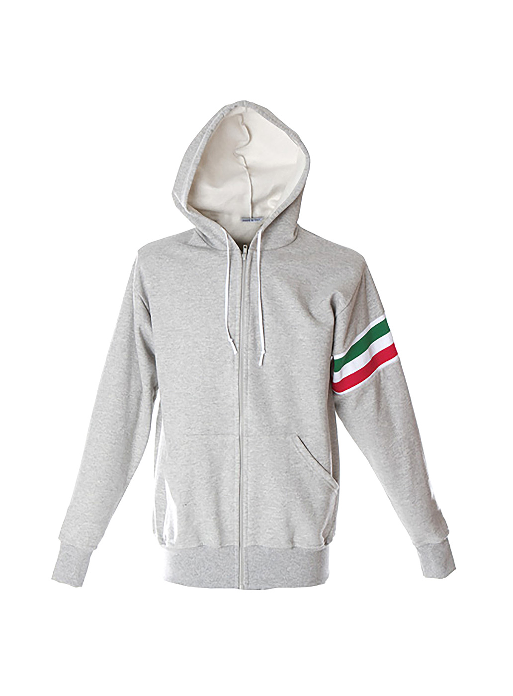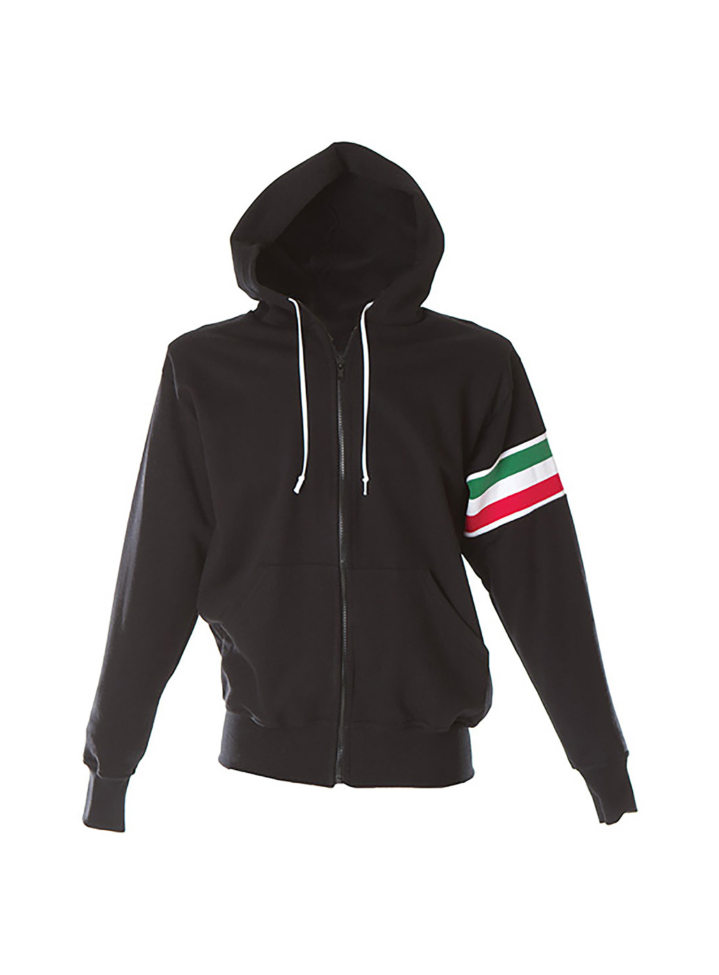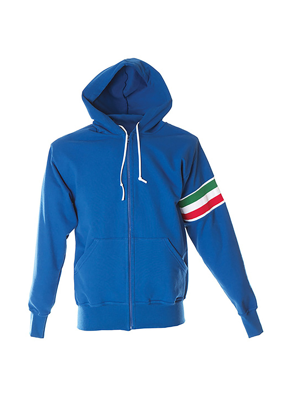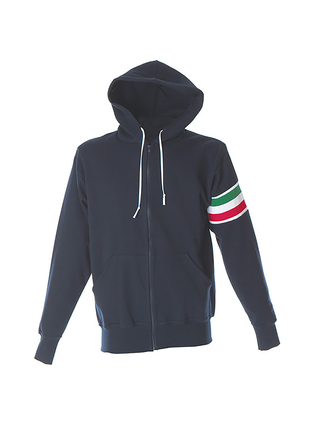 Felpa made in Italy 100% cotone Peso: 280 g/m2 – Cappuccio con cordini bianchi – Zip lunga – Fascia tricolore sul braccio – Tasche a marsupio