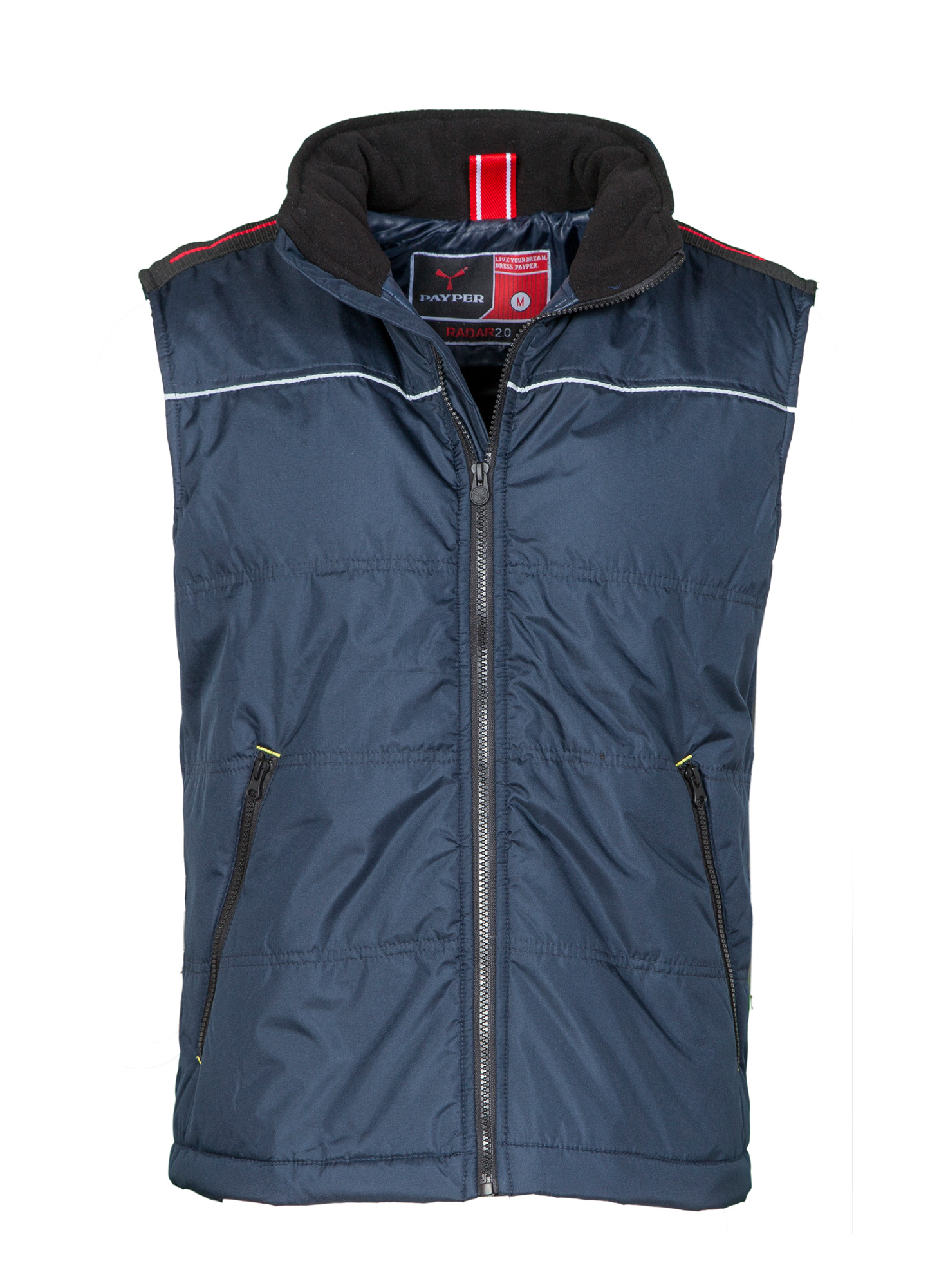 Gilet trapuntato con retro sagomato e imbottitura trapuntata e rifinita con fodera ad alta densità , interno colletto in pile. Piping reflex al petto e sulla schiena, due ampie tasche con zip sul davanti e una tasca interna.
