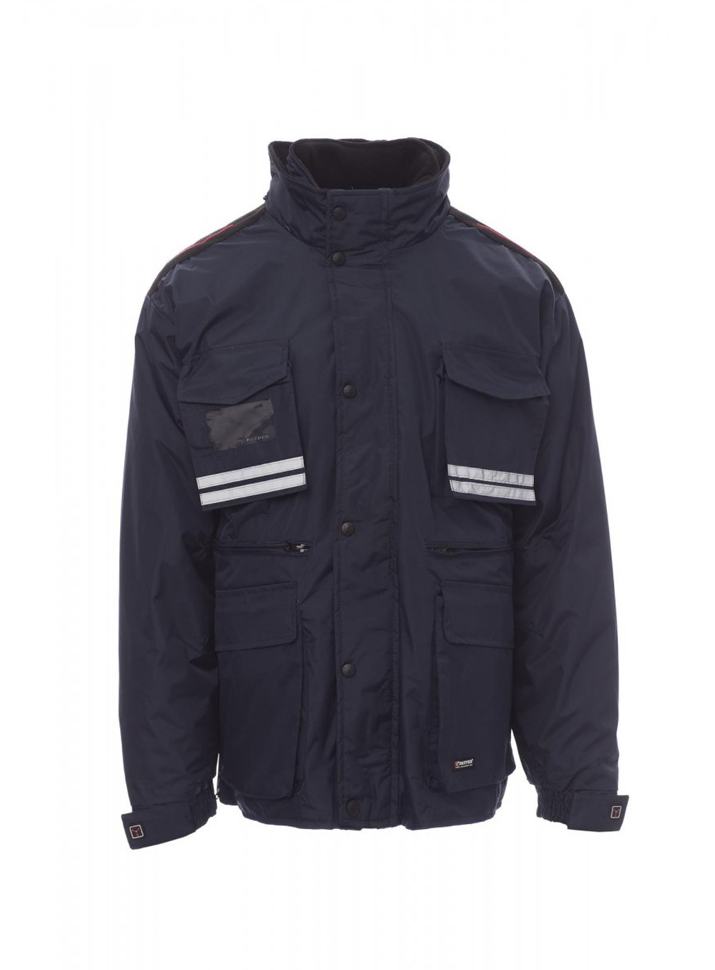 Parka quattro usi composto da: giacca esterna non imbottita, foderata in nylon, con colletto, schiena e scaldareni in micropile e inserti traspiranti sottobraccio, zip 8mm in plastica con cursore in metallo con patta e bottoni in plastica, cappuccio sagomato staccabile e/o richiudibile nel colletto, polsini regolabili, bande riflettenti grigie fronte e retro, gomiti preformanti e spacchetto laterale con soffietto e zip, nove tasche esterne di cui due LOCK SYSTEM, due con zip e interno rinforzato, una con portabadge reversibile, coulisse in vita e zip interna per agevolare stampe e ricami. Giubbotto interno, maniche staccabili, imbottito, fodera altà densità e schiena in micropile, cappuccio richiudibile nel colletto, cinque tasche, di cui una con protabadge reversibile, chiusura al collo, piping reflex alle spalle e doppia fascia reflex sulla tasca al petto e sulla schiena, interno collo in rib, una tasca interna.
