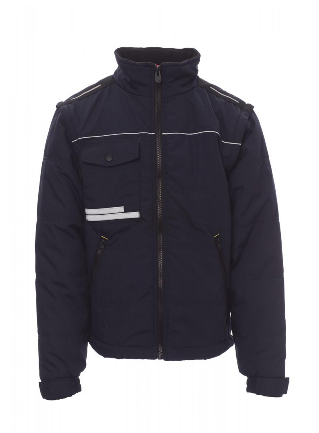 Giubbino da uomo, maniche staccabili, retro sagomato, zip da 8mm in plastica con cursore in metallo,con cappuccio a scomparsa, due ampie tasche esterne con zip, ampia tasca la petto multifunzione e porta Smart-Phone con bande riflettenti, anello porta badge. Interno: imbottitura trapuntata e rifinito con fodera ad alta densità, interno colletto in pile, una tasca.