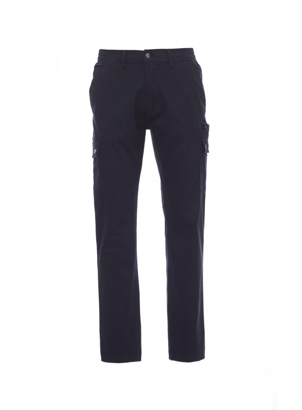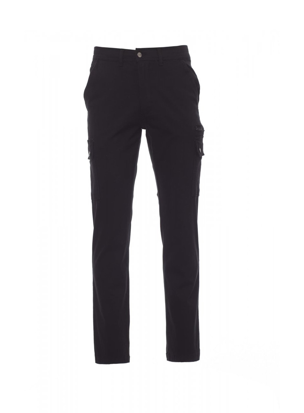 Pantalone uomo, stretch, multistagione, elastici laterali e passanti in vita, chiusura con zip e bottone in metallo, due tasche anteriori a taglio classico, due tasche laterali con patta e bottoni automatici, una tasca con zip lato sinistro, un portametro a scomparsa lato destro, due tasche posteriori a filo con asola e bottone.