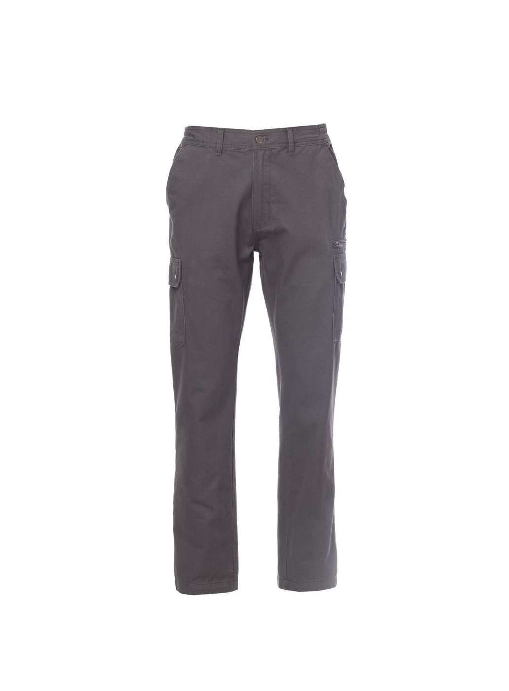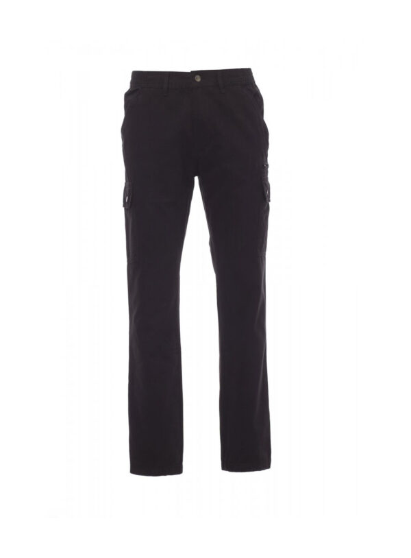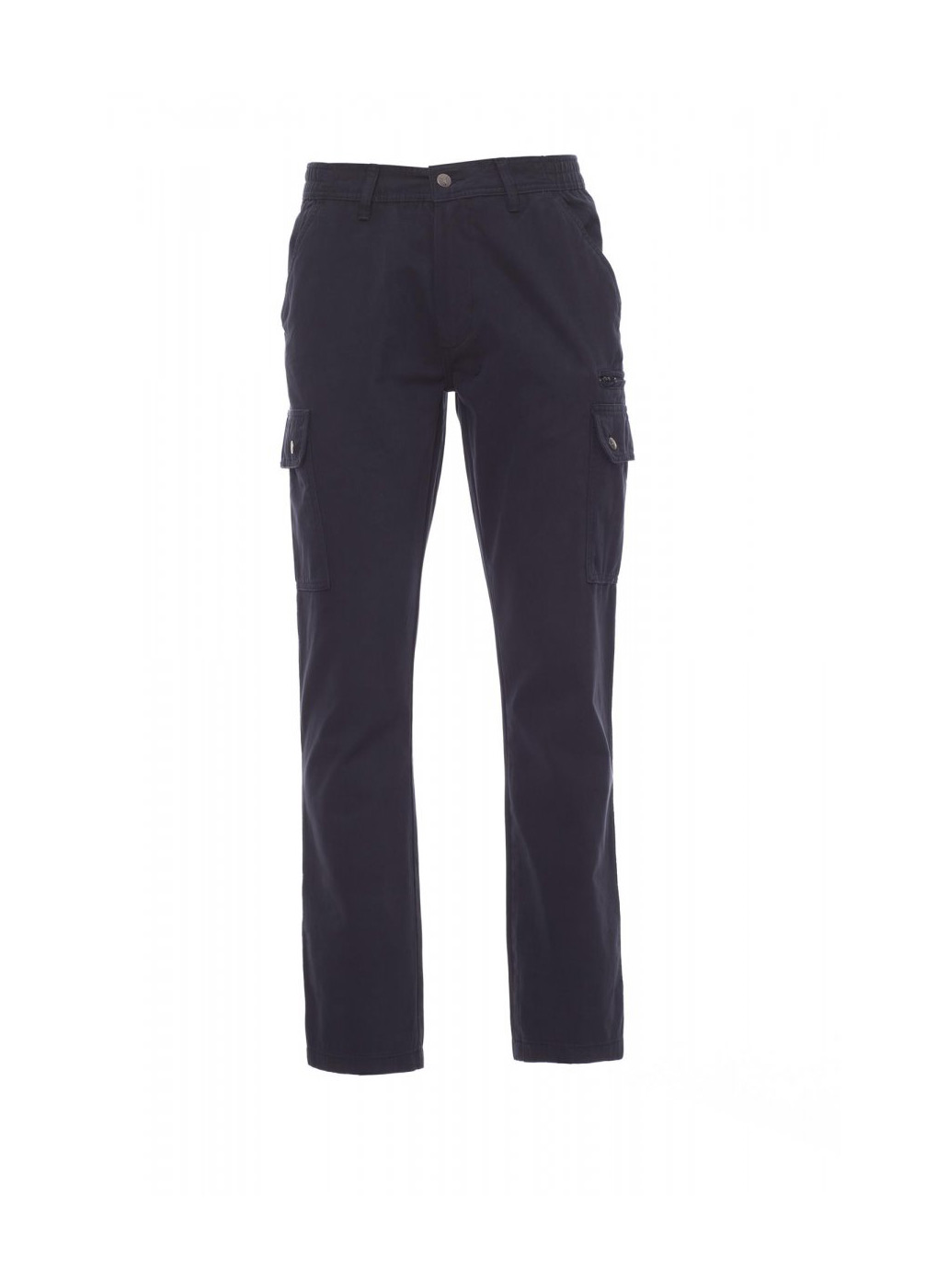 Pantalone uomo, invernale, elastici laterali e passanti in vita, chiusura con zip e bottone in metallo, due tasche anteriori a taglio classico, due tasche laterali con patta e bottoni automatici, una tasca con zip lato sinistro, un portametro a scomparsa lato destro, due tasche posteriori a filo con asola e bottone.