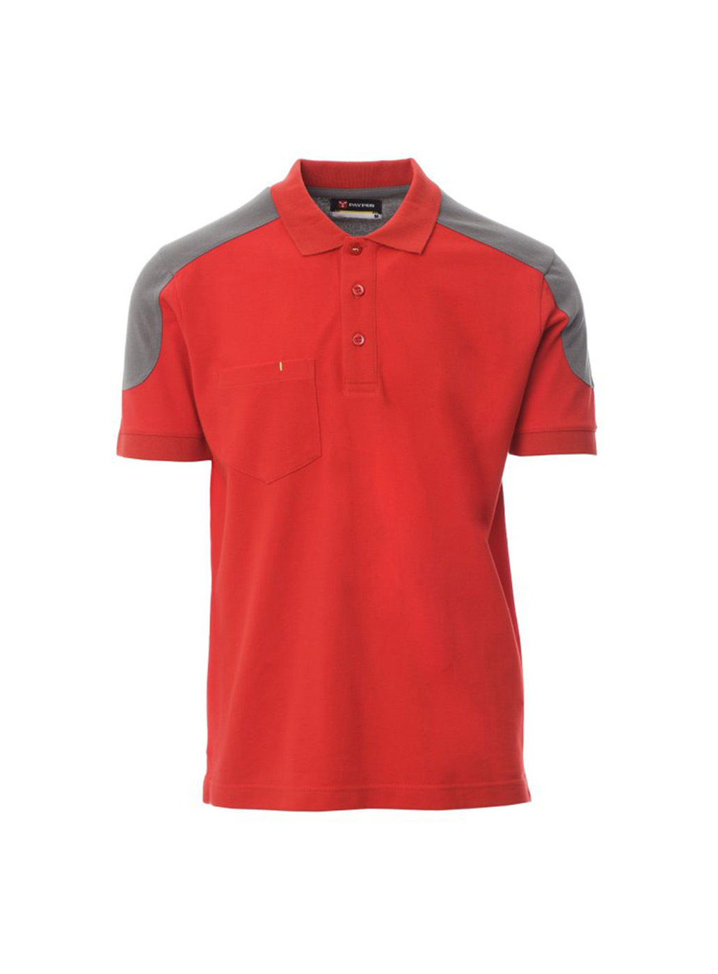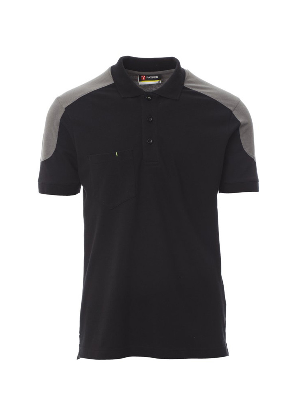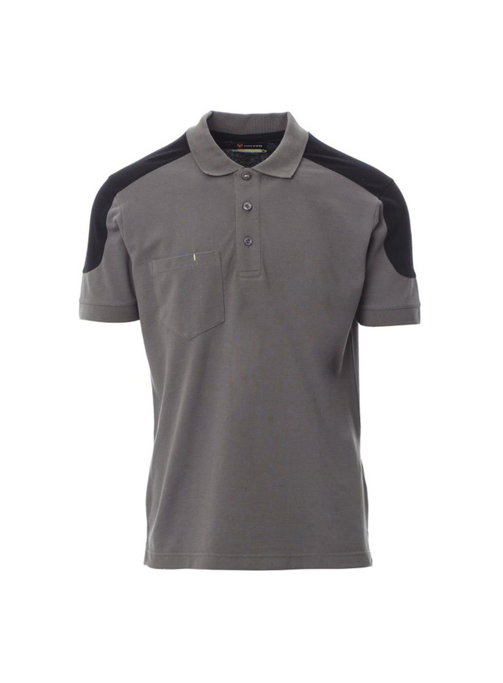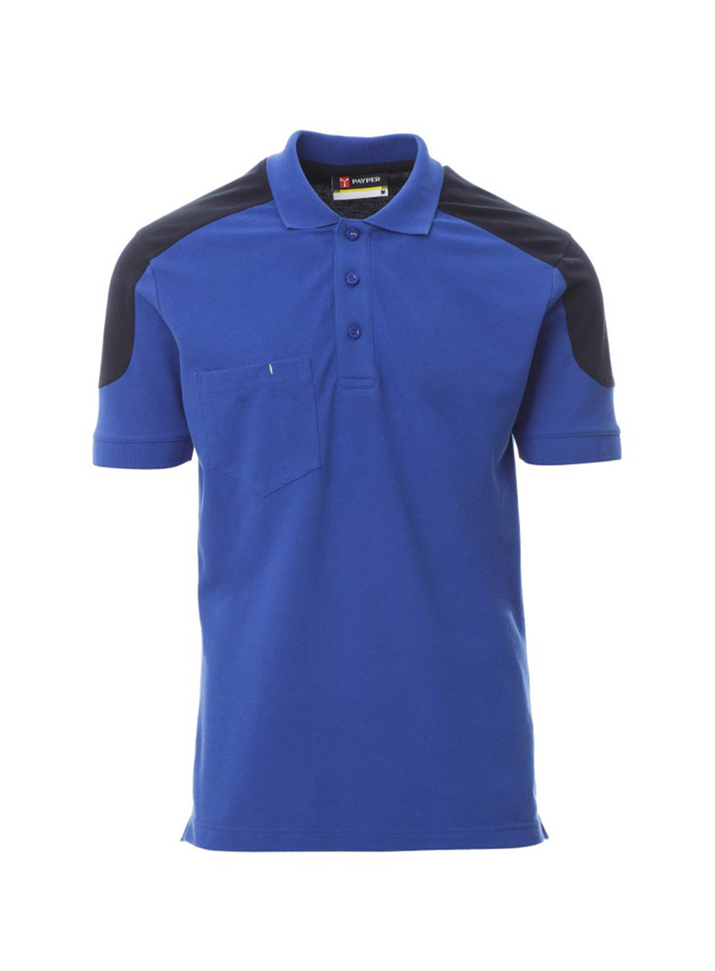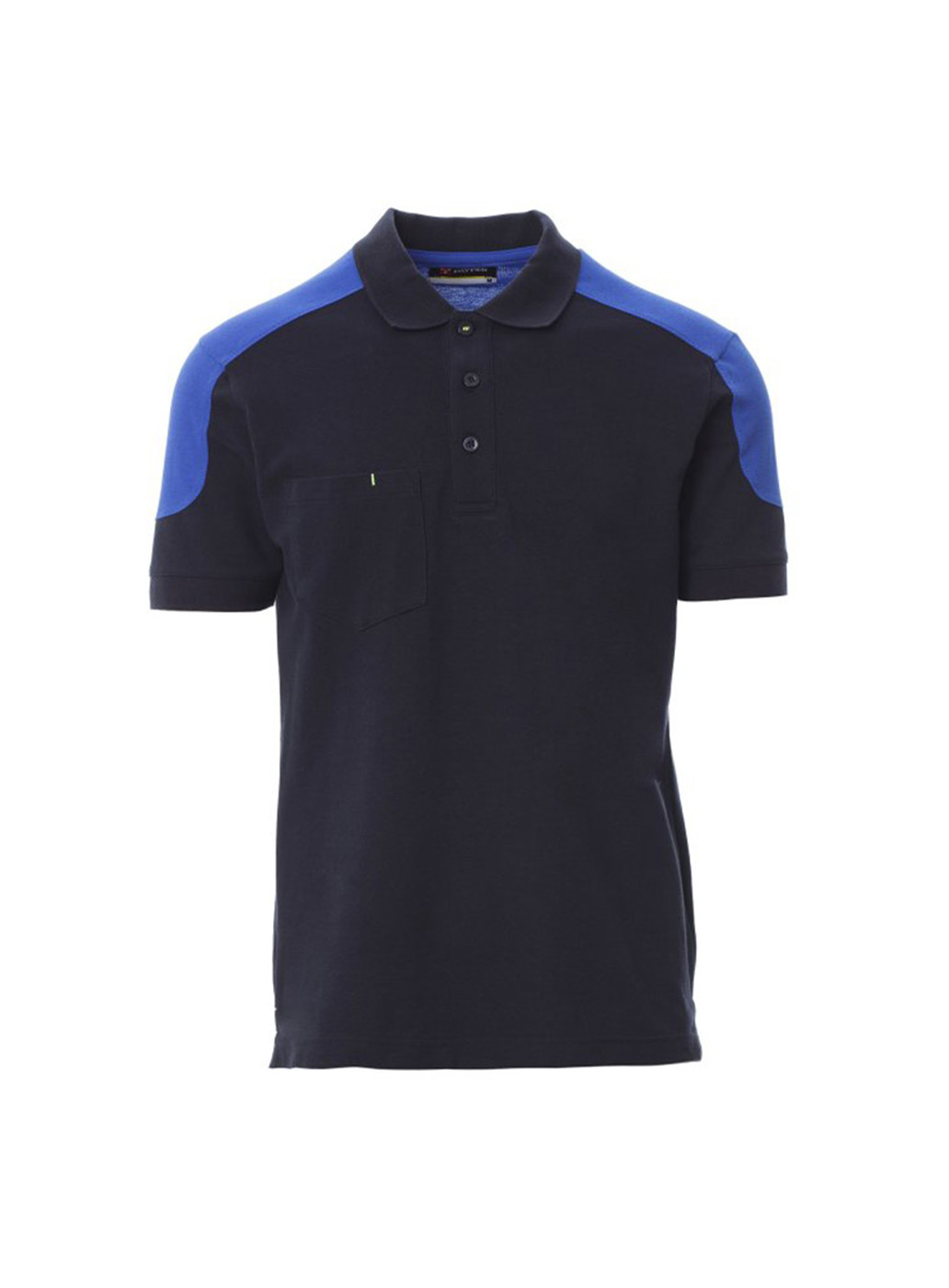 Polo bicolore a manica corta con 3 bottoni in tinta, taschino al petto con portapenna, bordo maniche a costine, spacchetti laterali, cuciture del collo coperte.