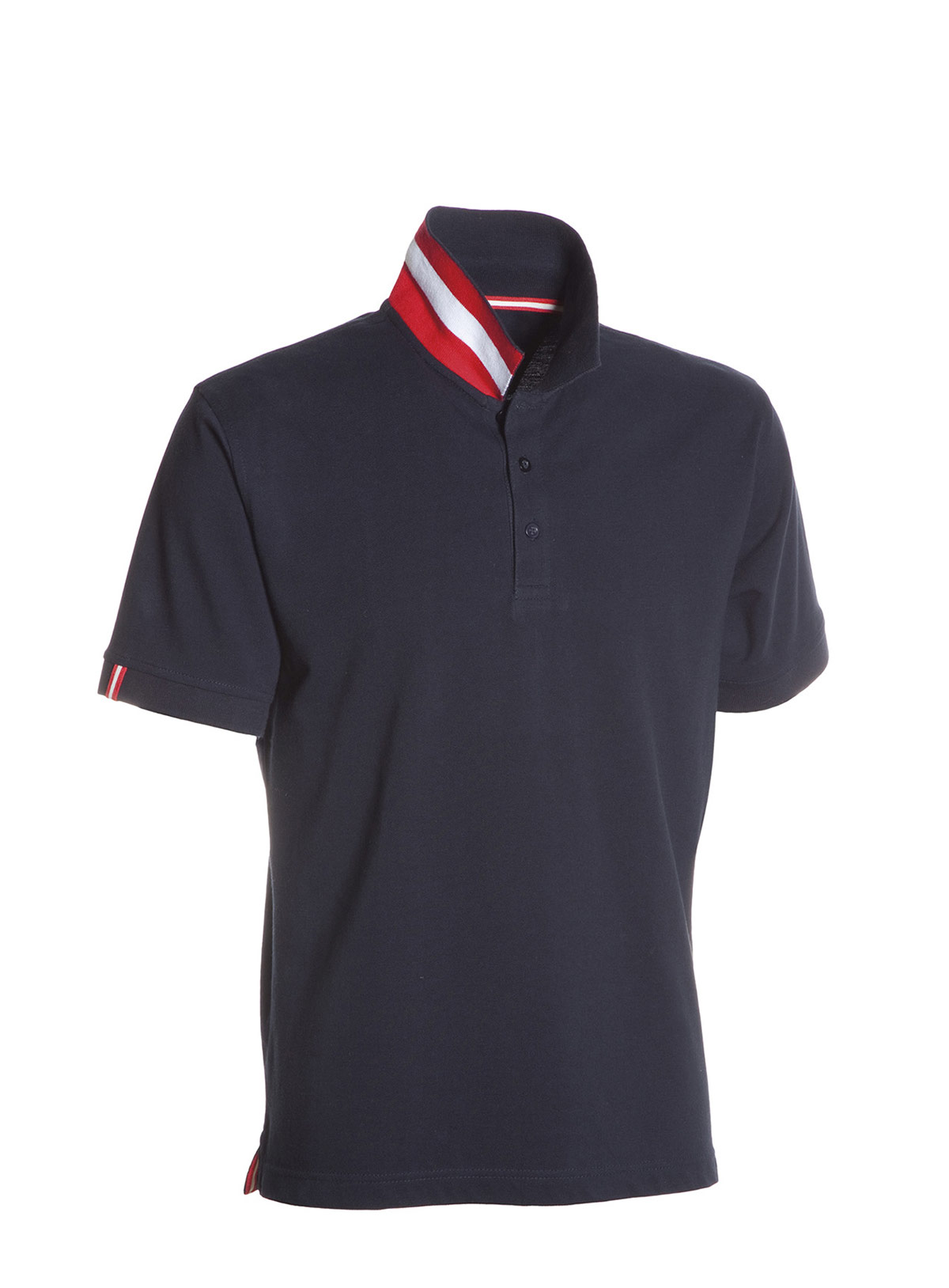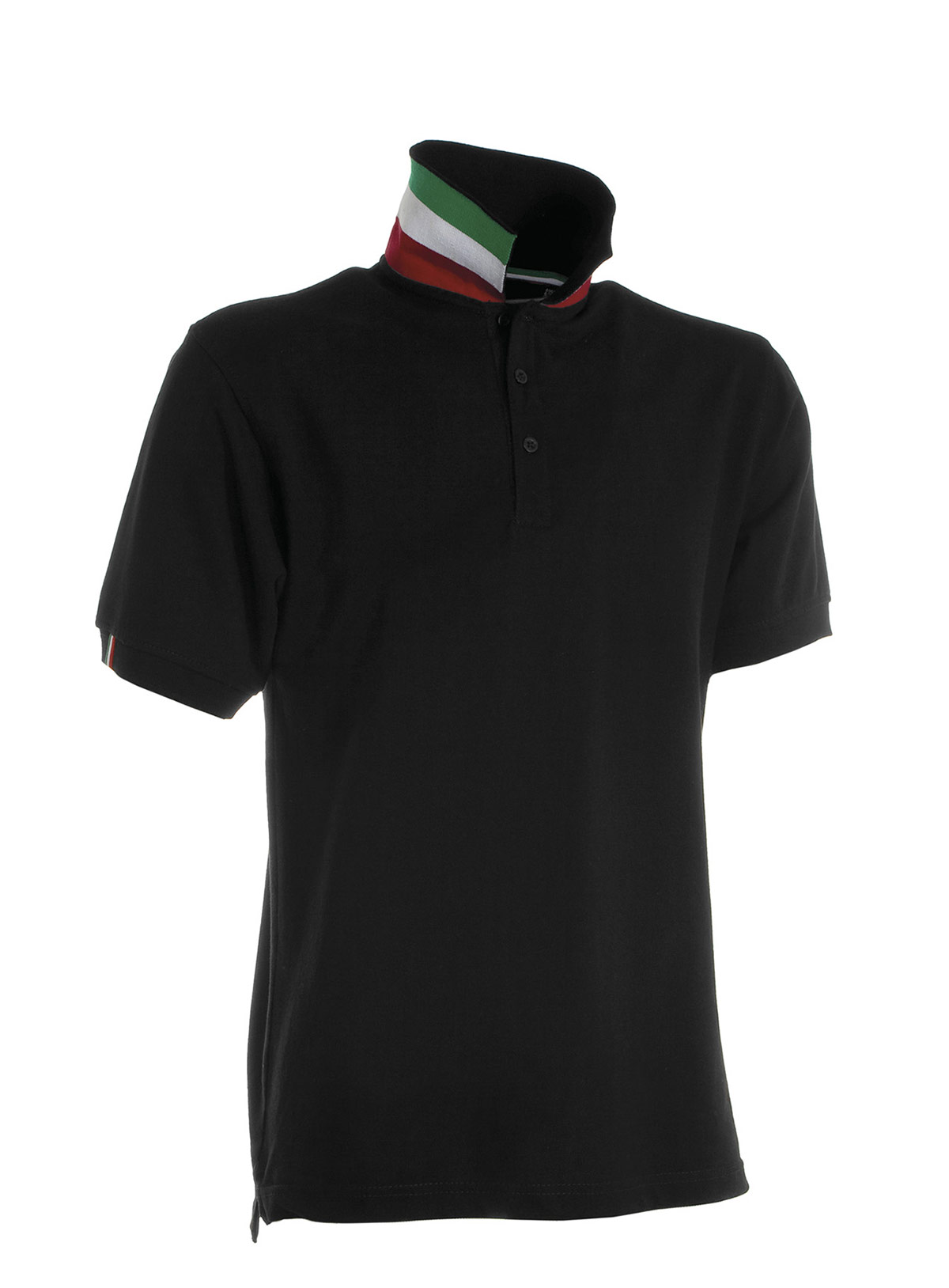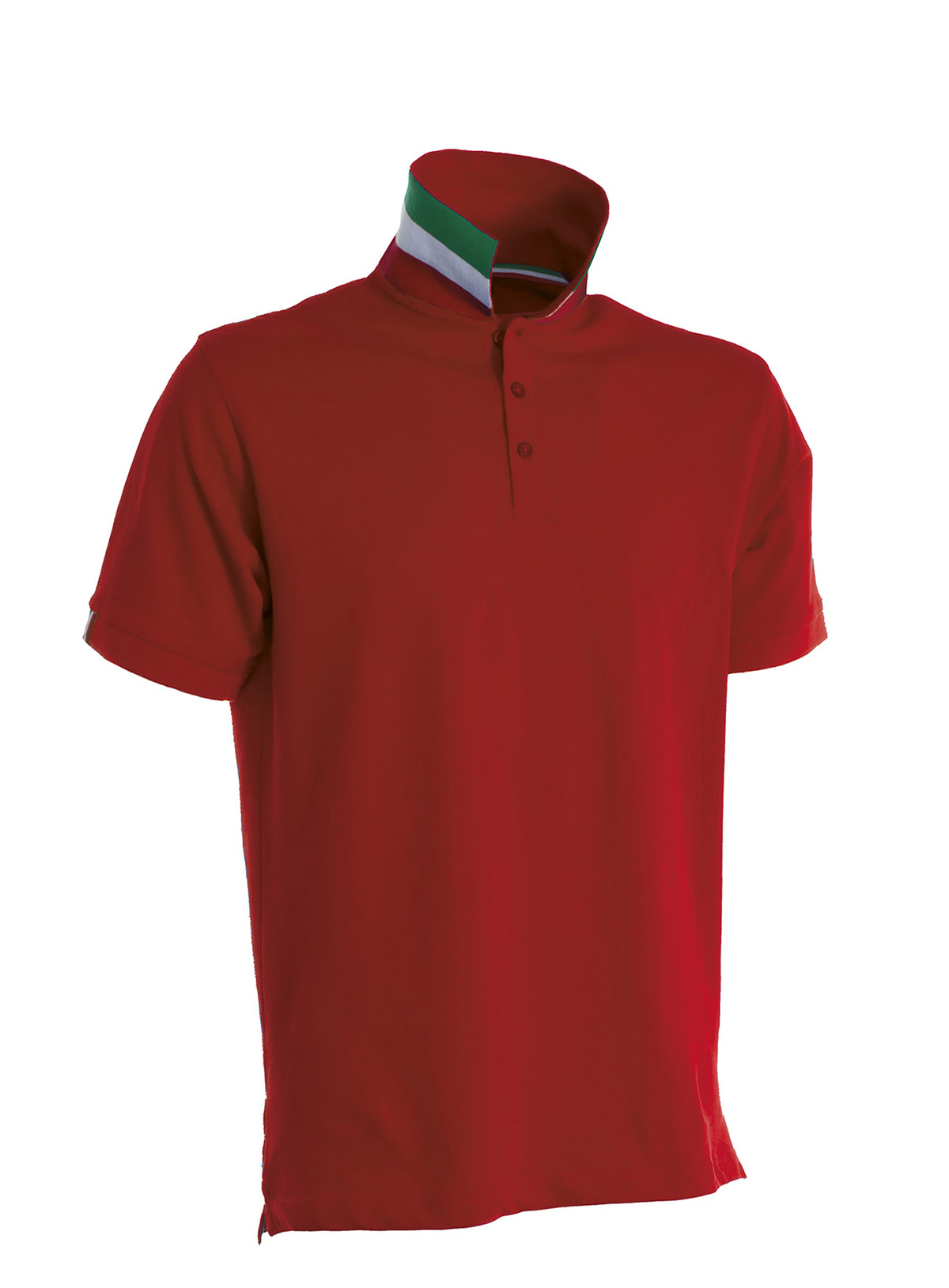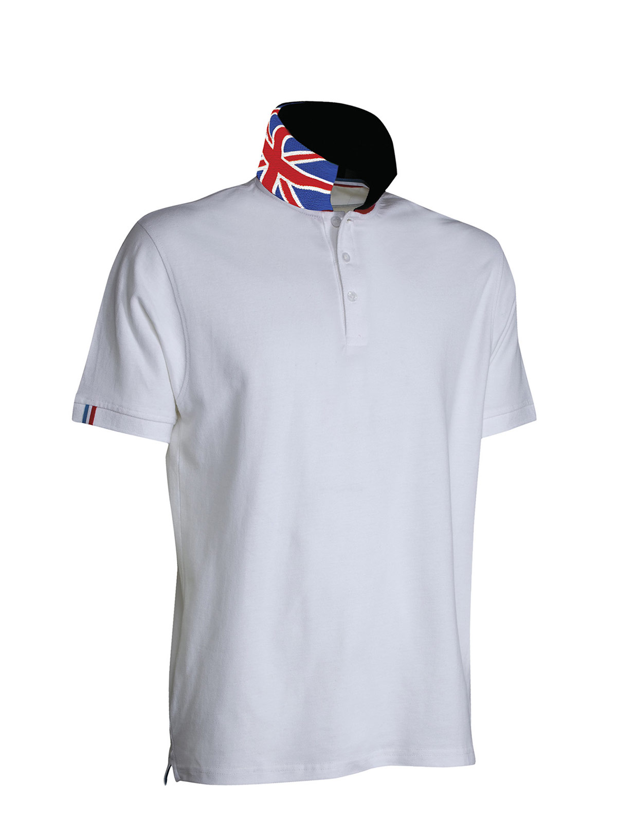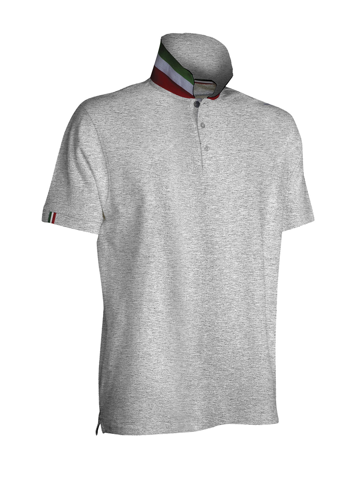 Polo a manica corta a tre bottoni in tinta ad effetto perlato, colletto da un lato in tinta, dall’altro lato a contrasto con colori bandiera visibile solo se alzato, bordo manica dx con fine inserto colore bandiera in contrasto, bordo manica a costine, spacchetti laterali con colore bandiera, cuciture del collo coperte con nastro in jersey colori bandiera, nastro di rinforzo laterale.