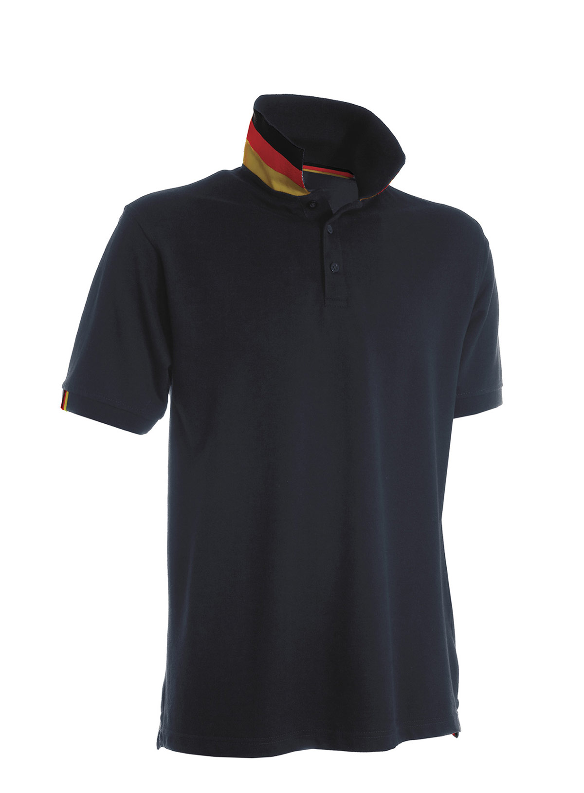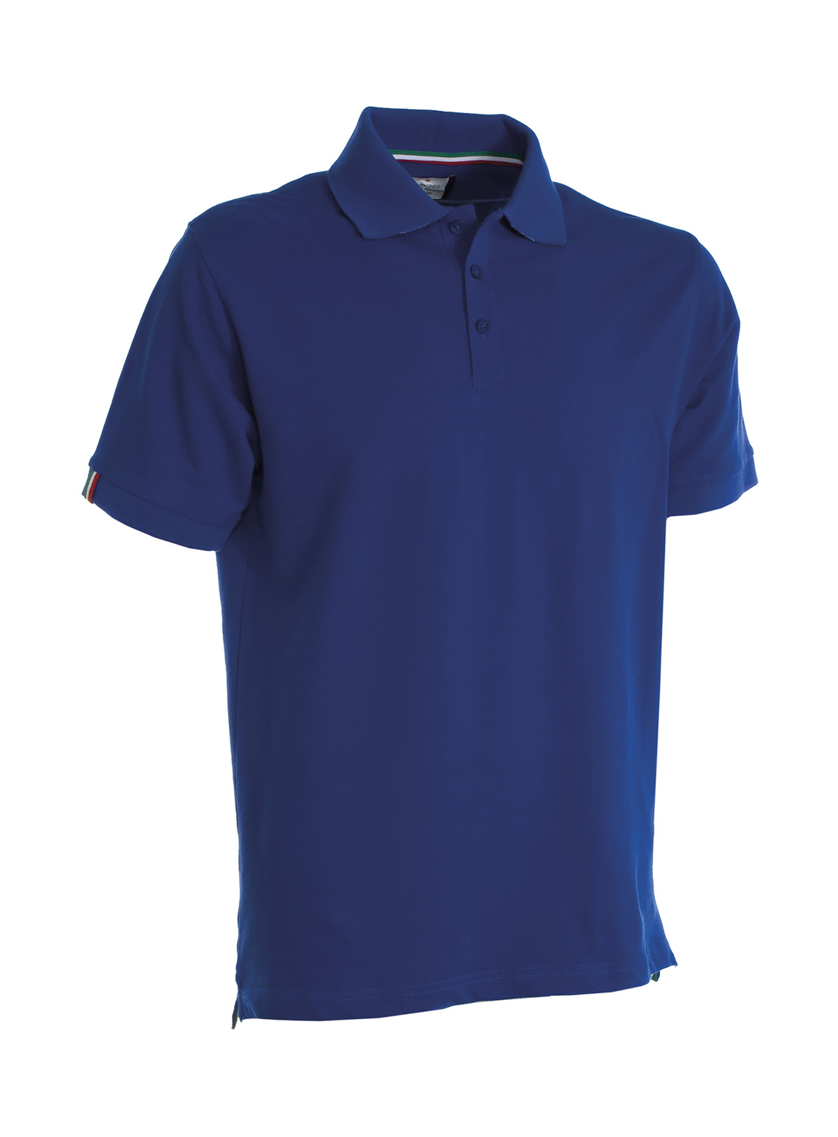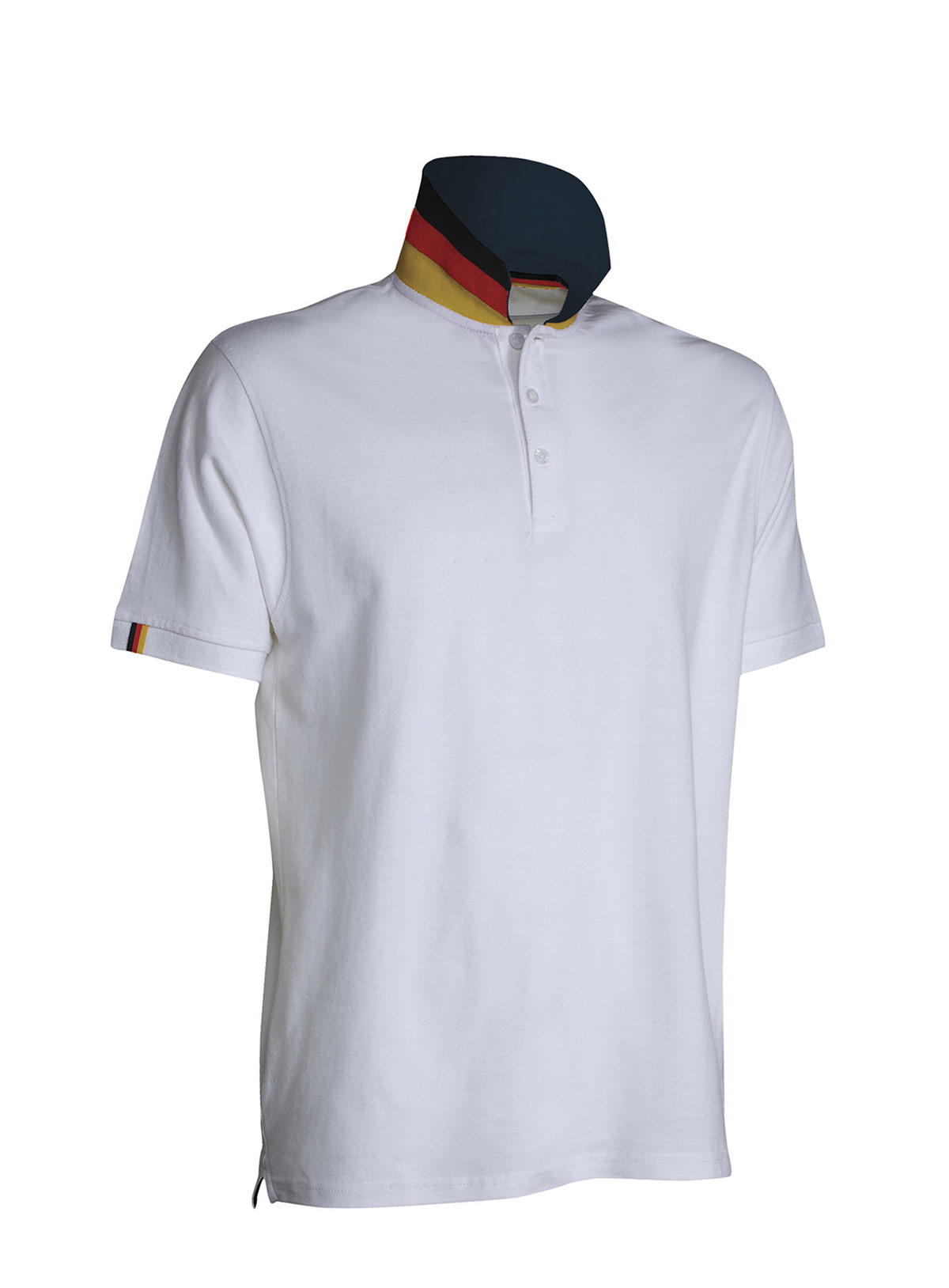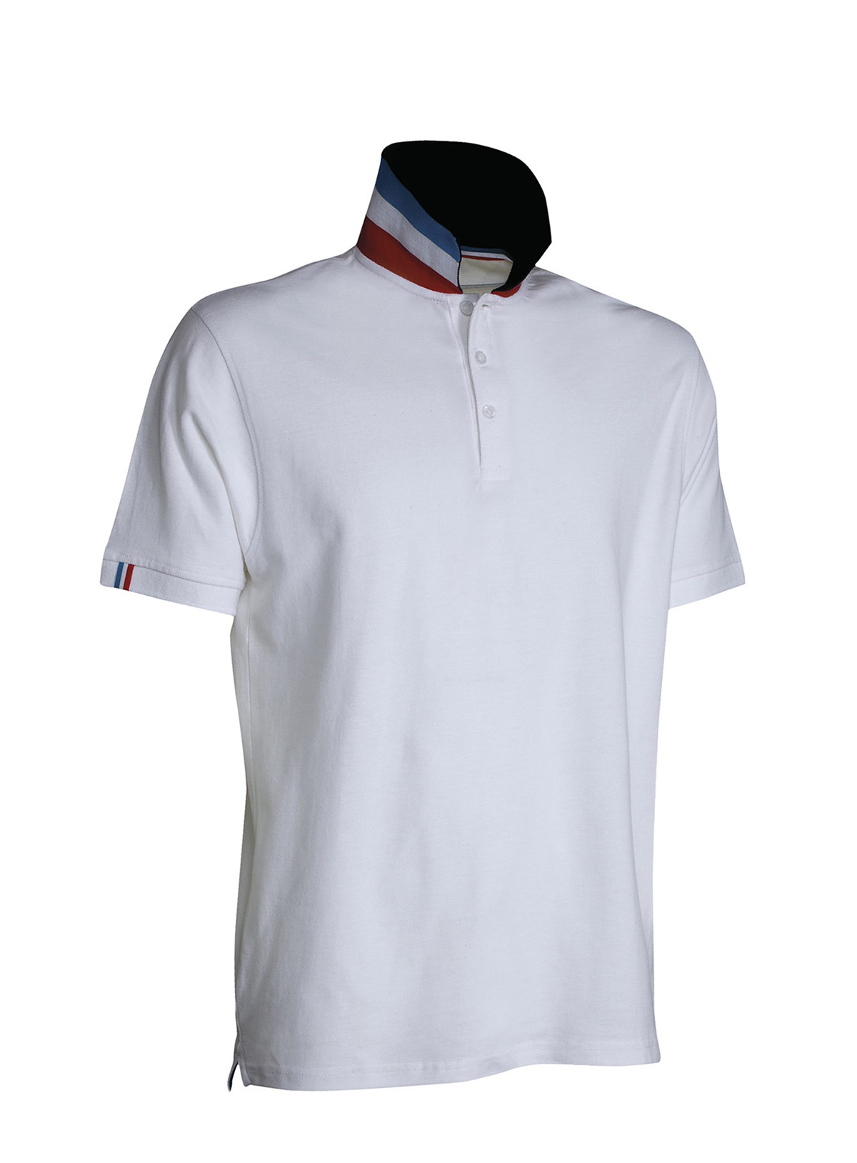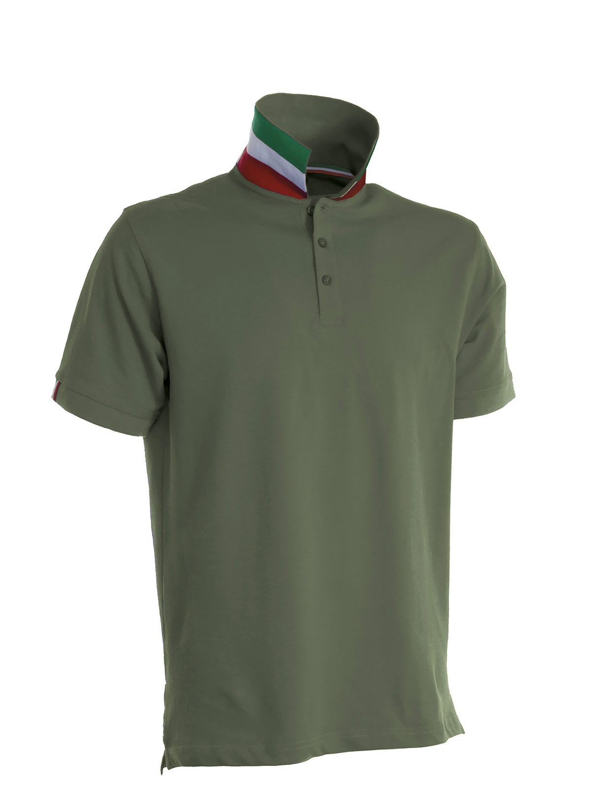Polo a manica corta a tre bottoni in tinta ad effetto perlato, colletto da un lato in tinta, dall’altro lato a contrasto con colori bandiera visibile solo se alzato, bordo manica dx con fine inserto colore bandiera in contrasto, bordo manica a costine, spacchetti laterali con colore bandiera, cuciture del collo coperte con nastro in jersey colori bandiera, nastro di rinforzo laterale.