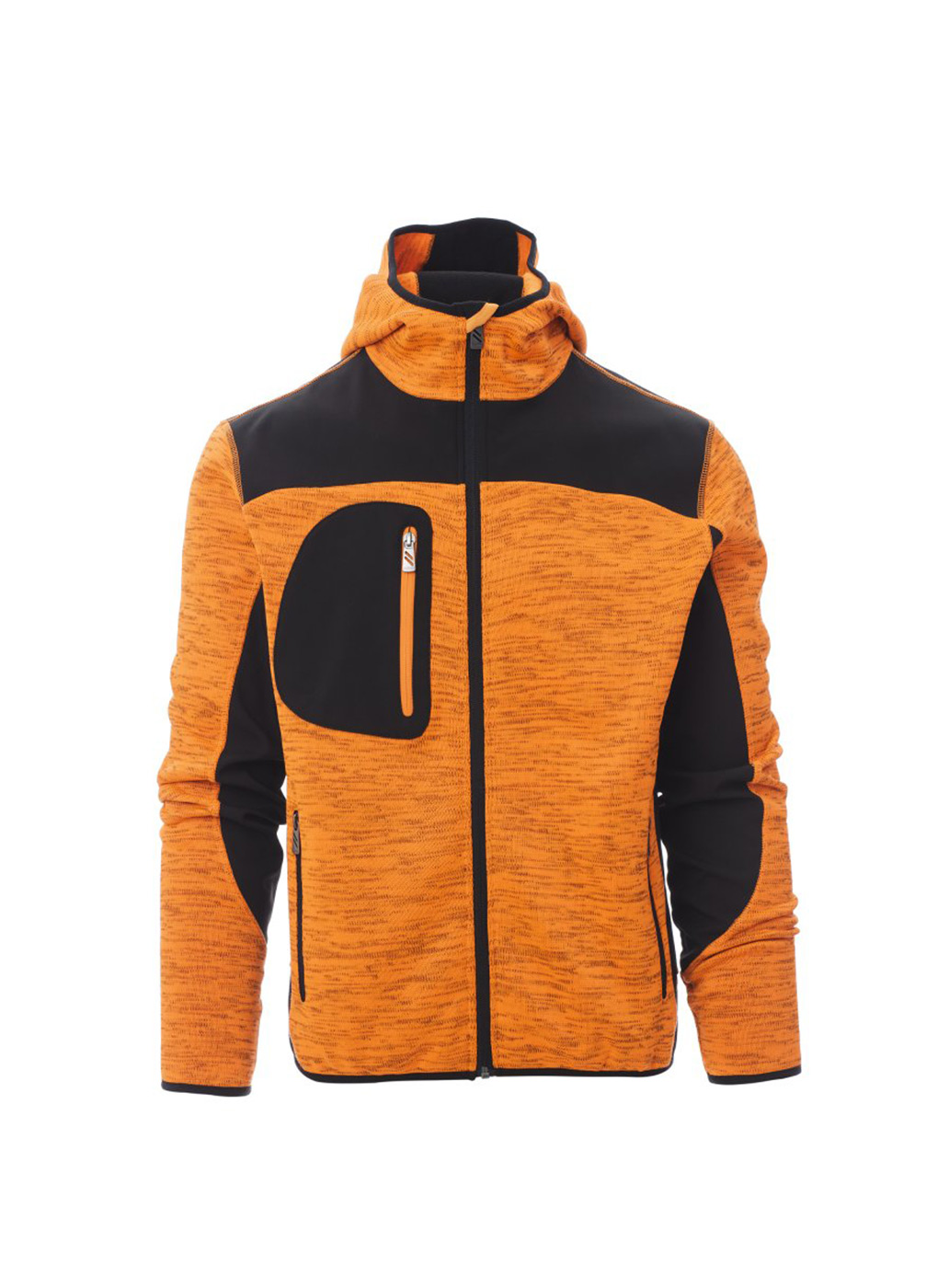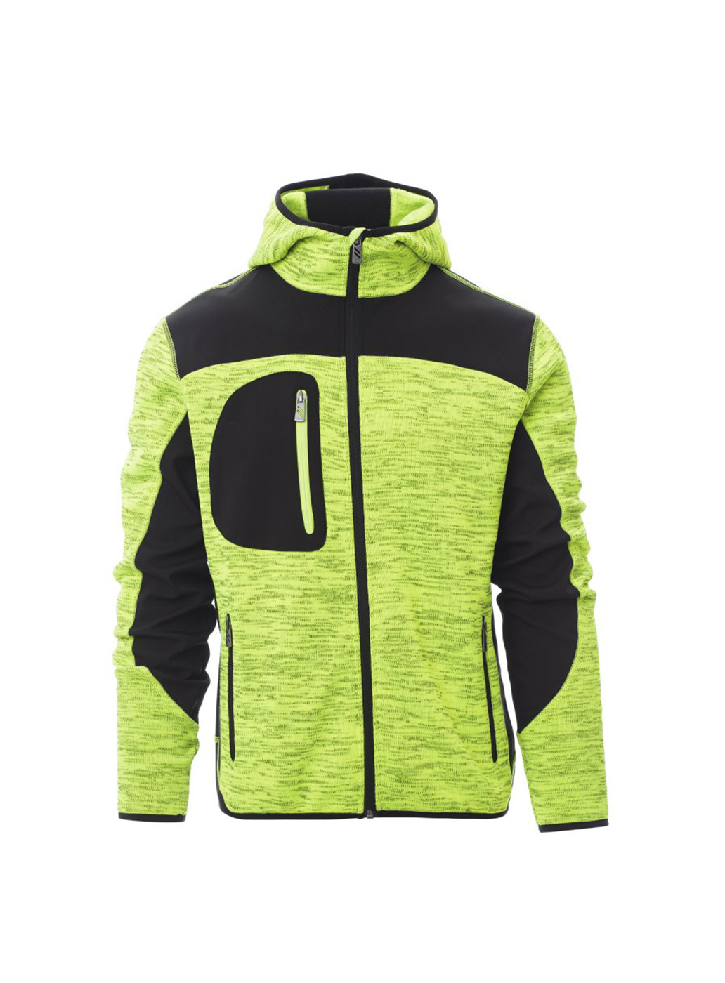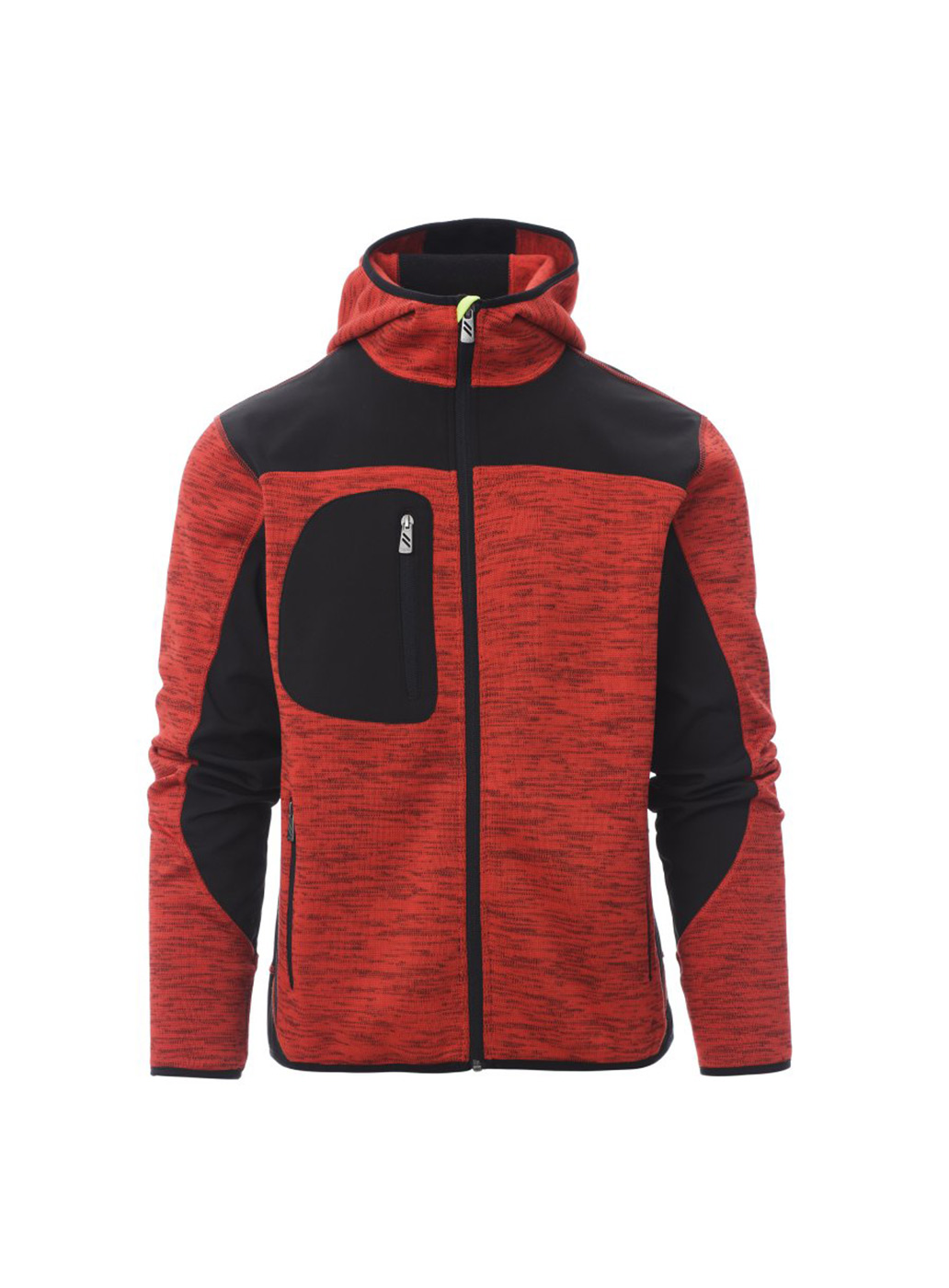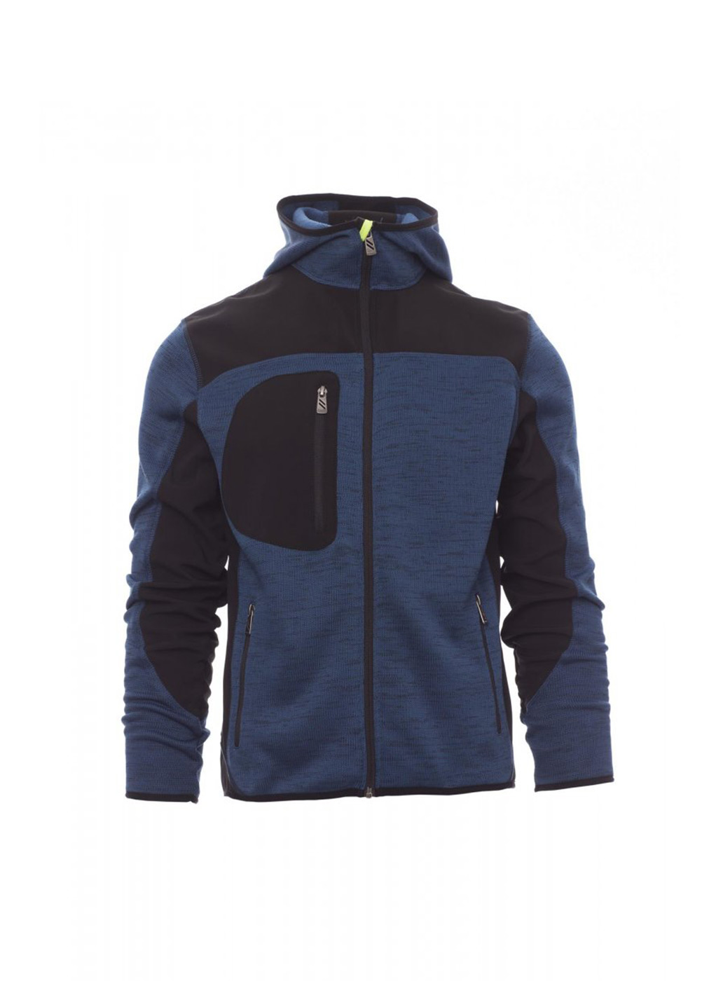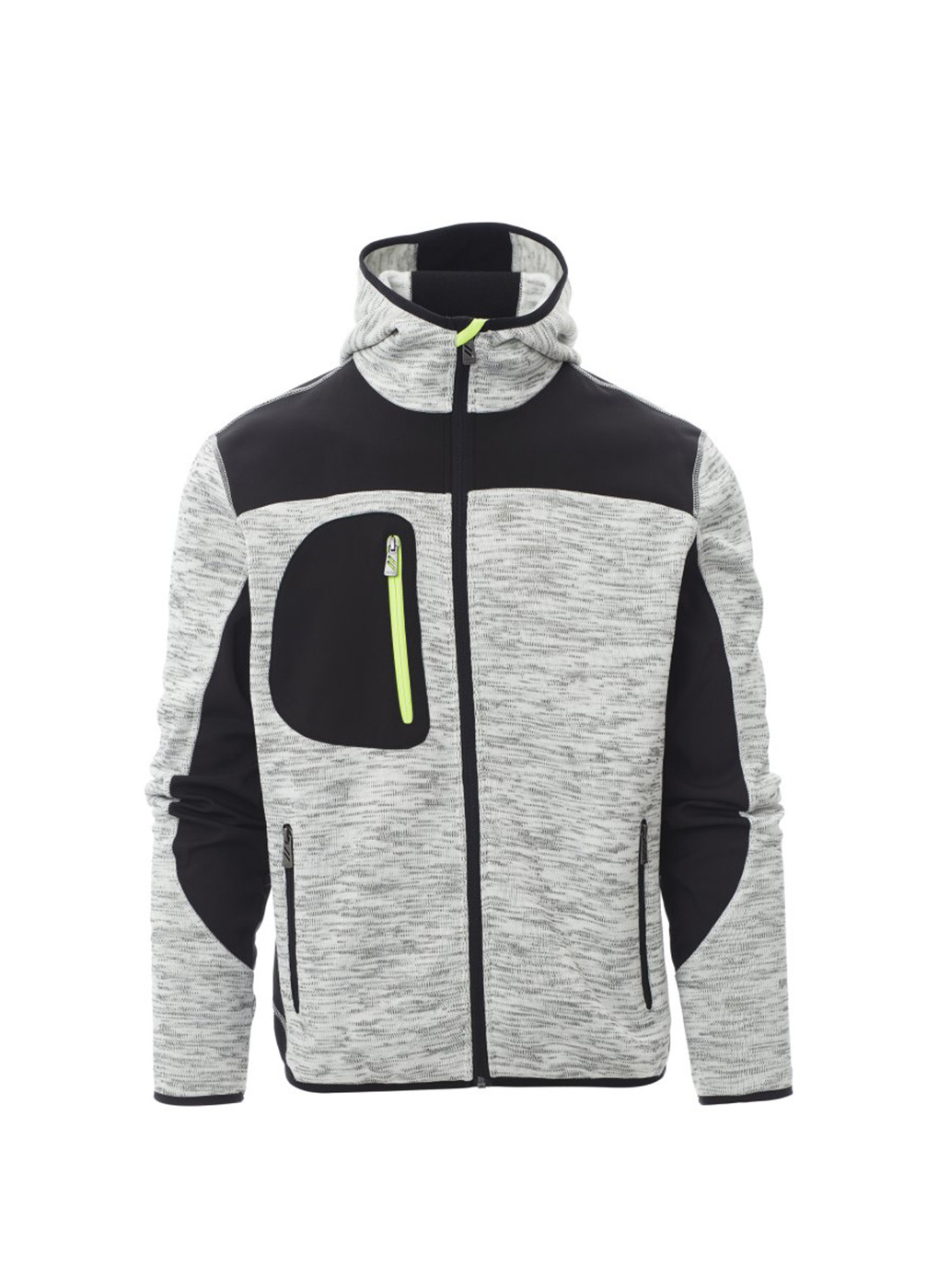 Giacca ergonomica da uomo con cappuccio, lavorazione a maglia con inserti in softshell nero, zip lunga SBS nastrata, due tasche laterali con zip, una tasca al petto.