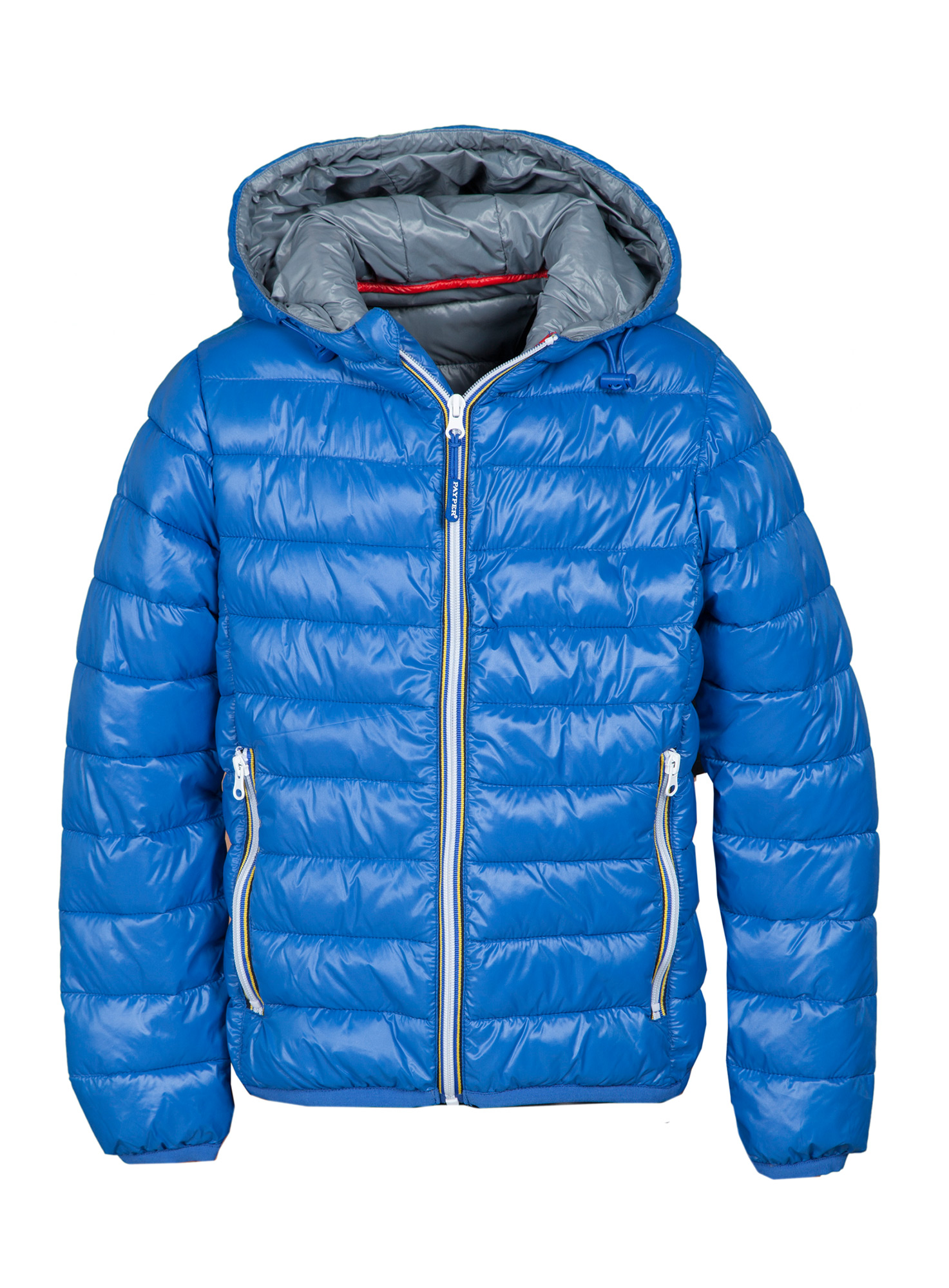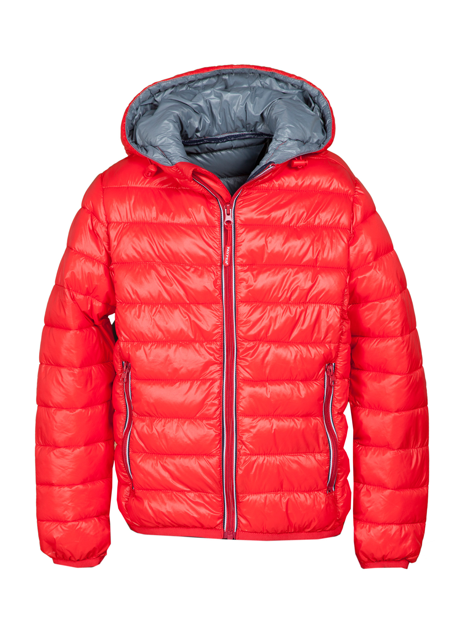 Giubbino/piumino con cappuccio, in nylon imbottito in poliestere effetto piuma, zip sportiva a contrasto, due tasche esterne, interno a contrasto grigio.