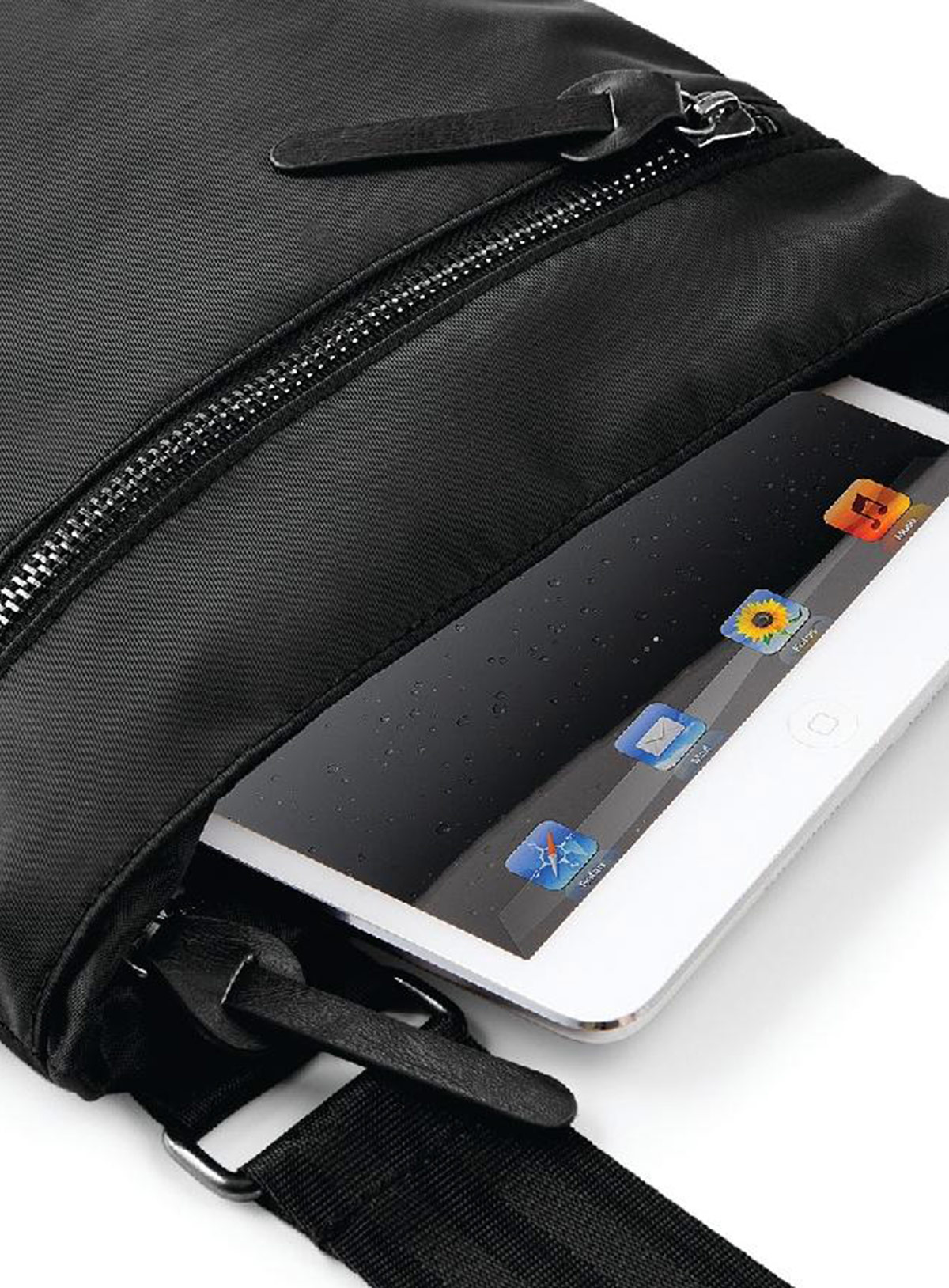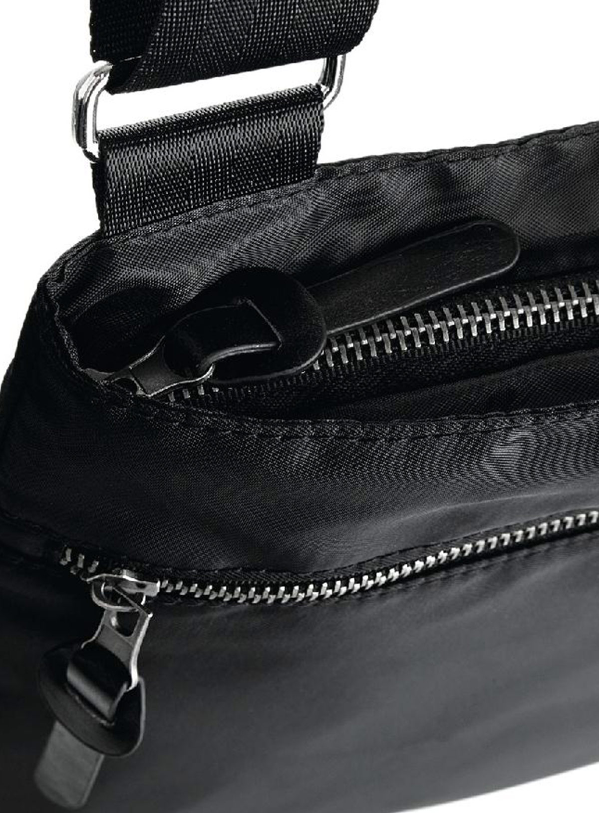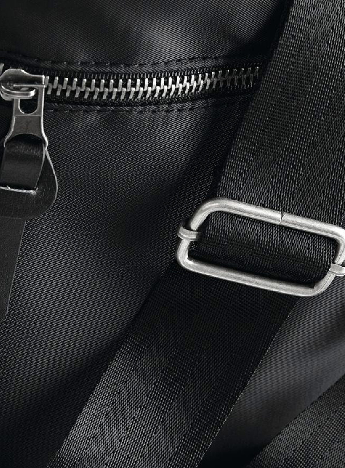 Completamente foderato, etichetta rimovibile, guarnizioni in PU e metallo, chiusura con zip, spallina regolabile.
