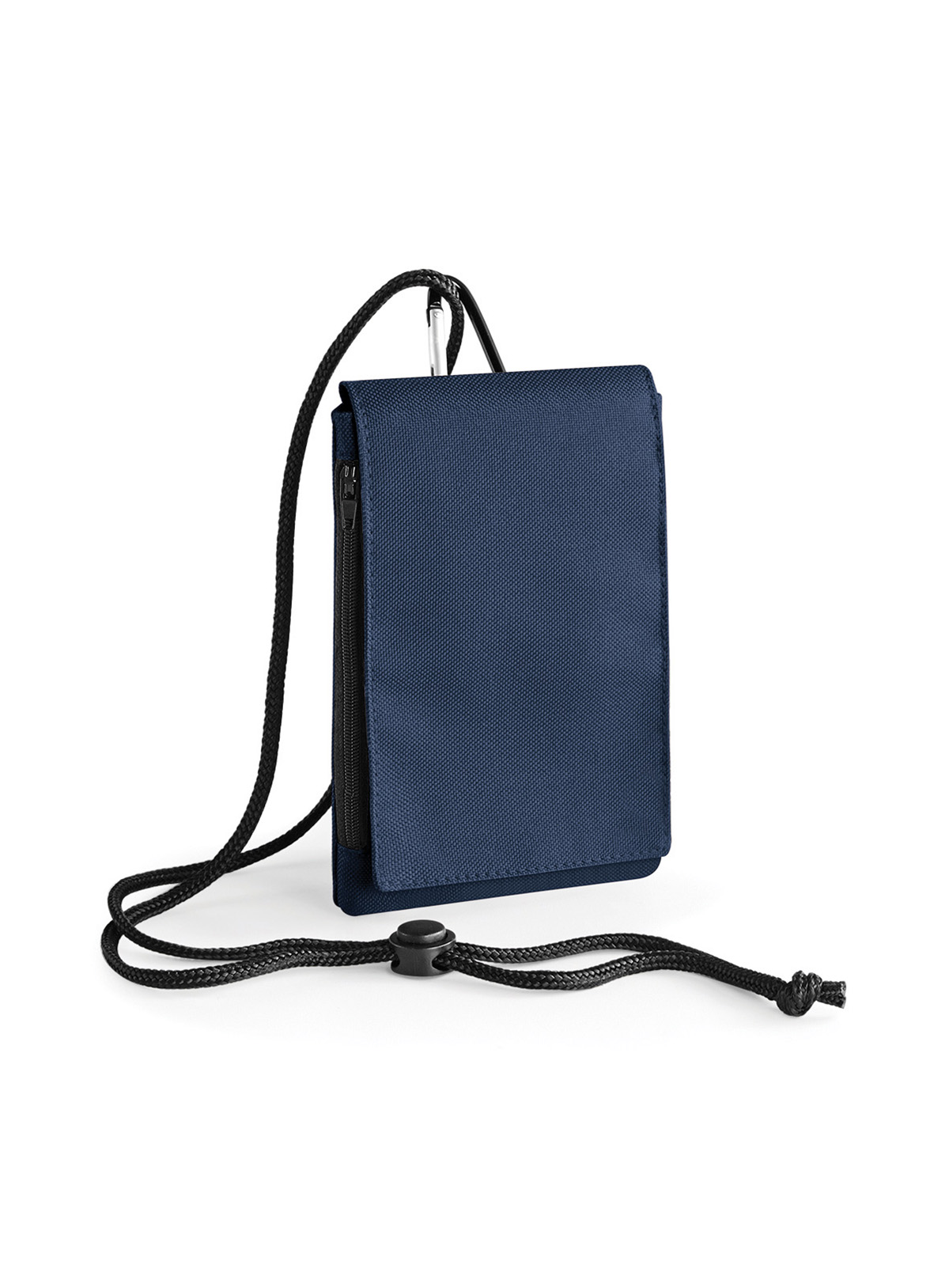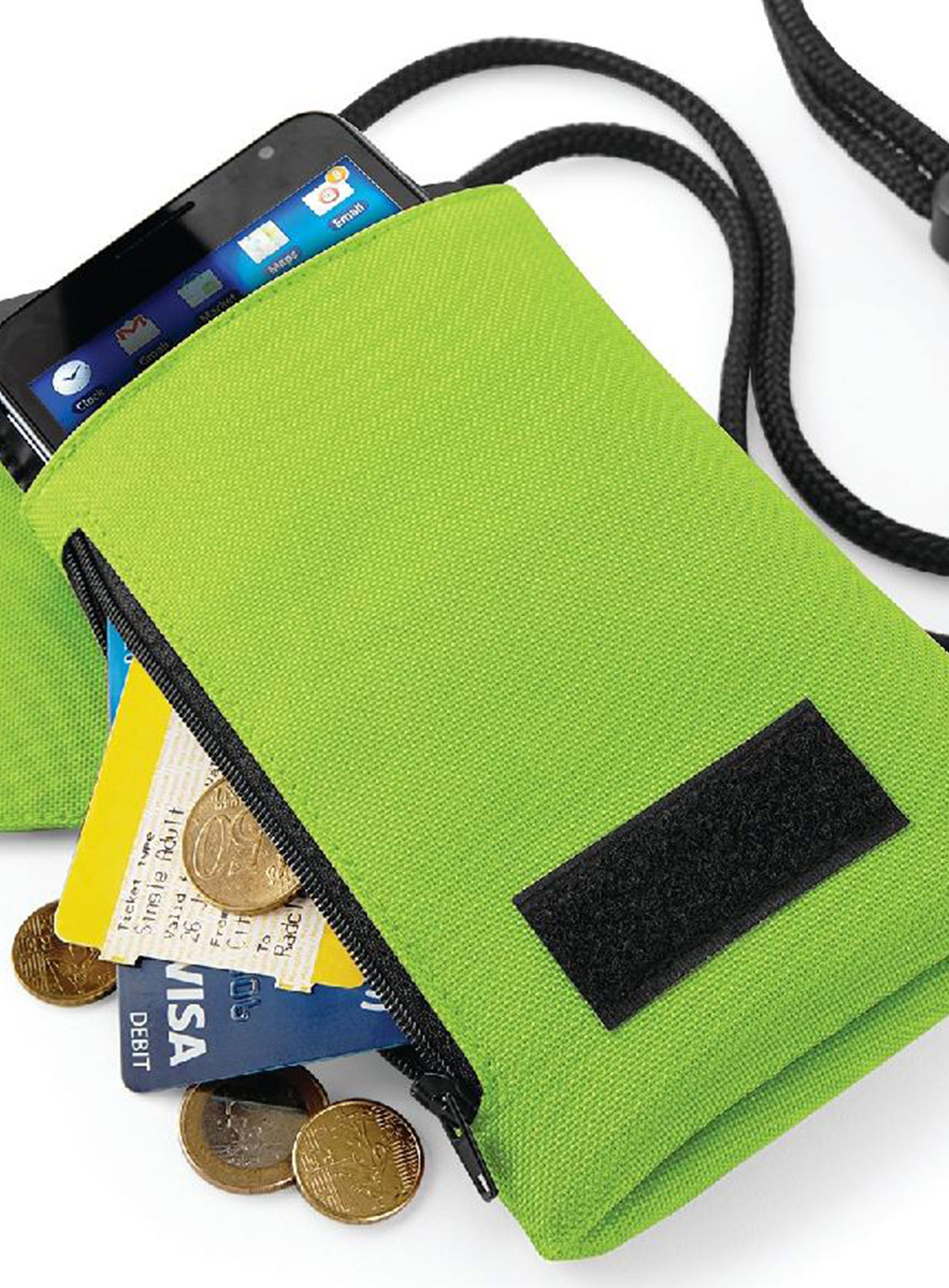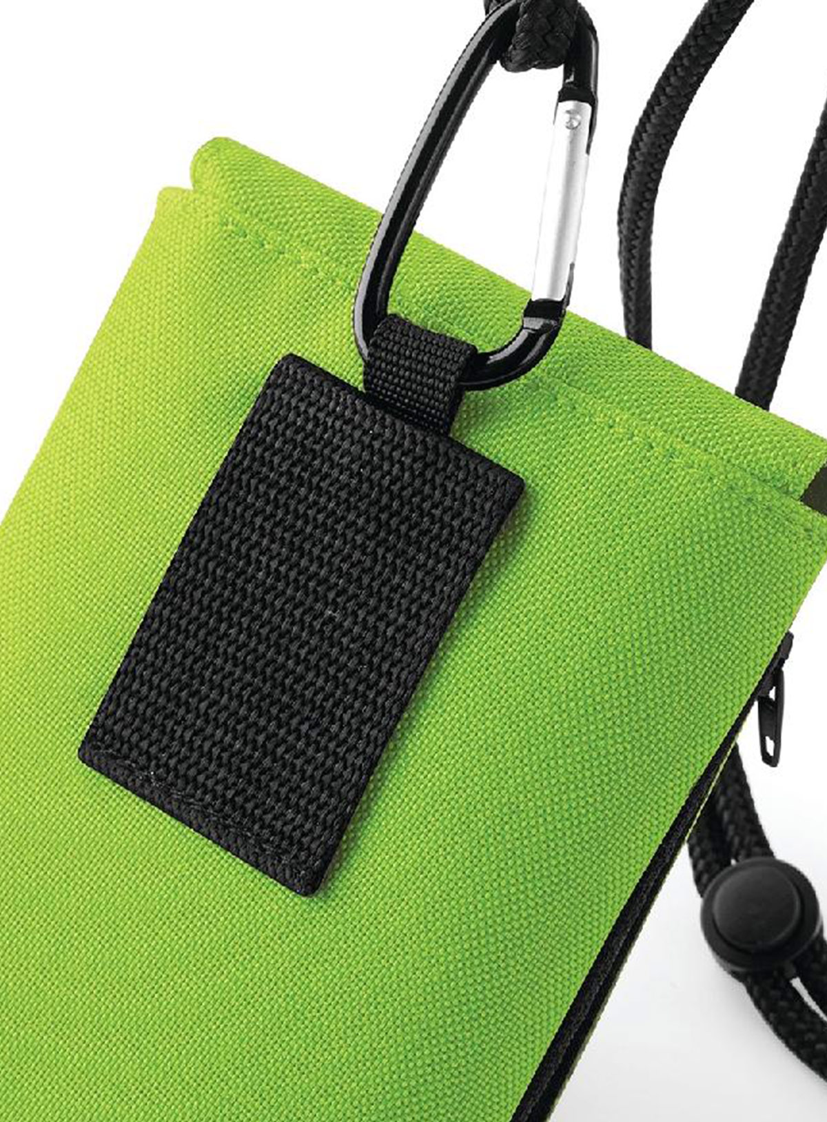 Porta smartphone compatibile con vari modelli. Chiusura a strappo che nasconde una tasca con cerniera.