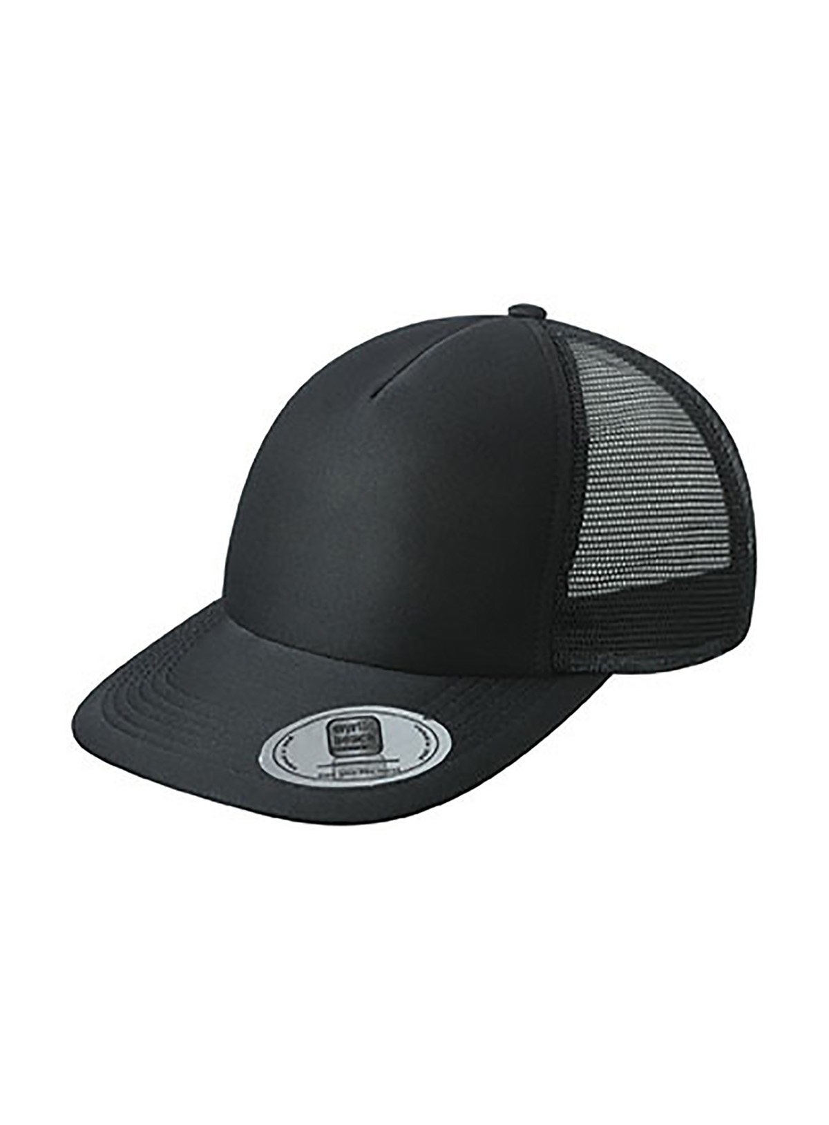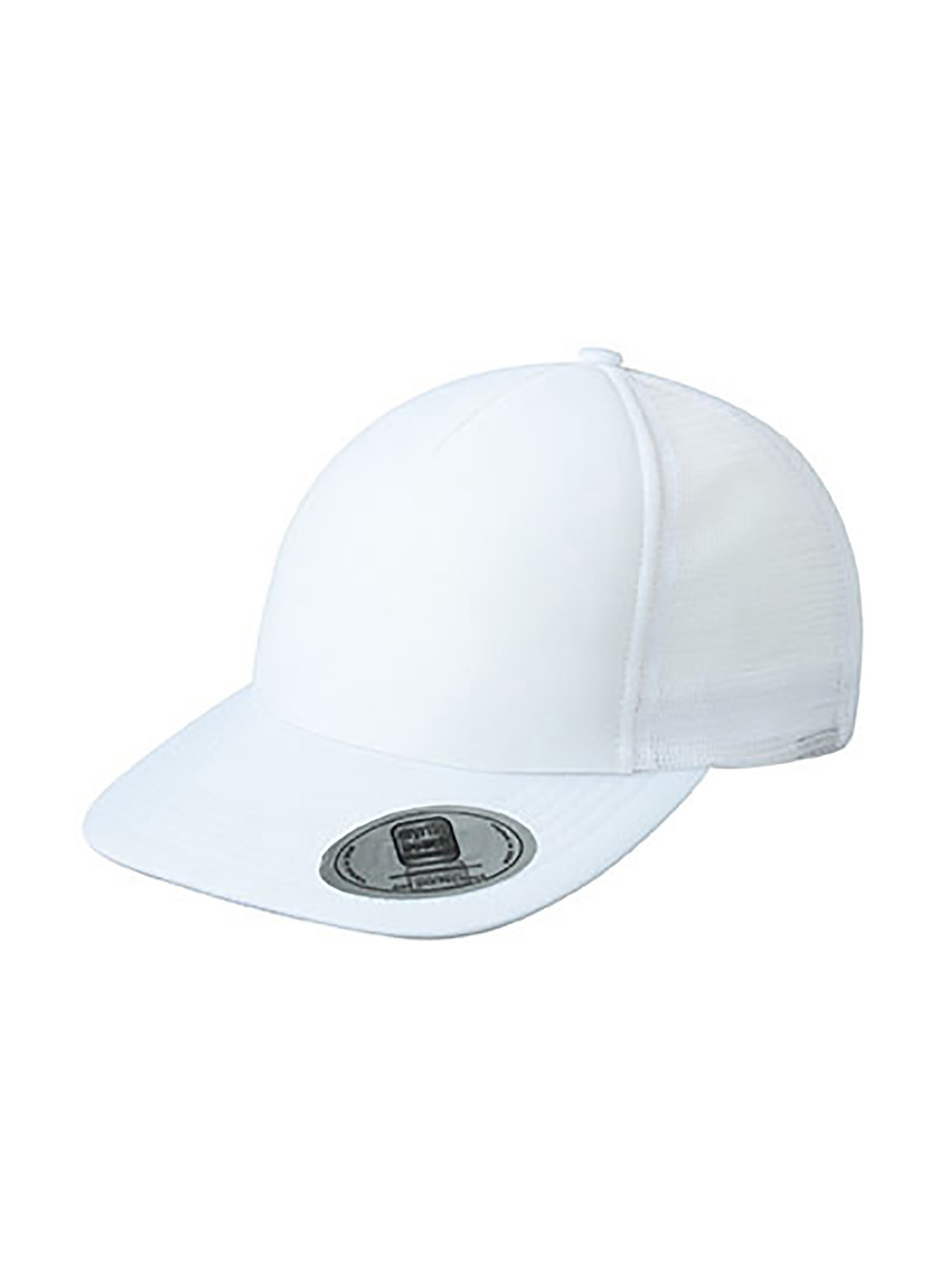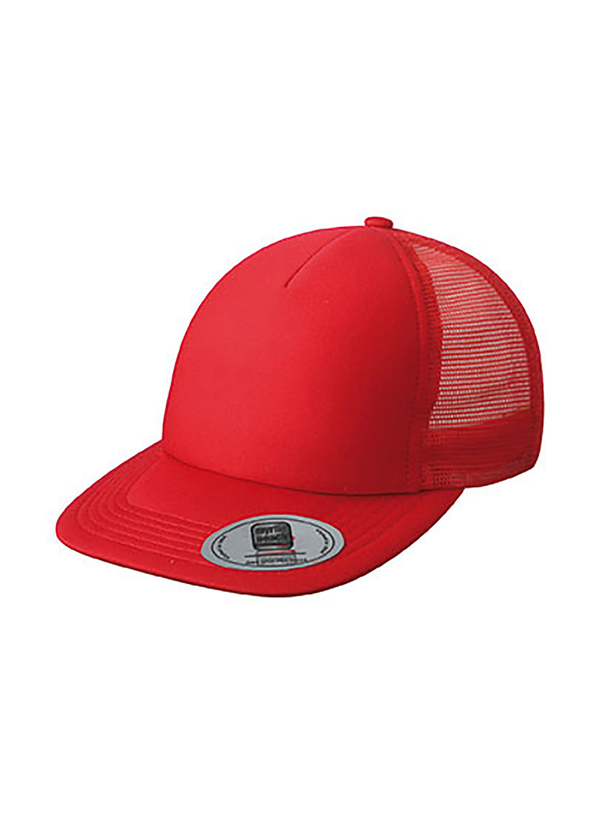Cappello a rete a 5 pannelli con visiera piatta 6 cuciture decorative sulla visiera, Fascetta, tergisudore in cotone, Etichetta sulla visiera. Regolazione taglia con chiusura “”click & snap””
