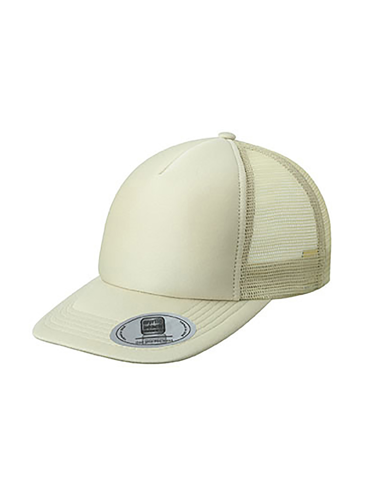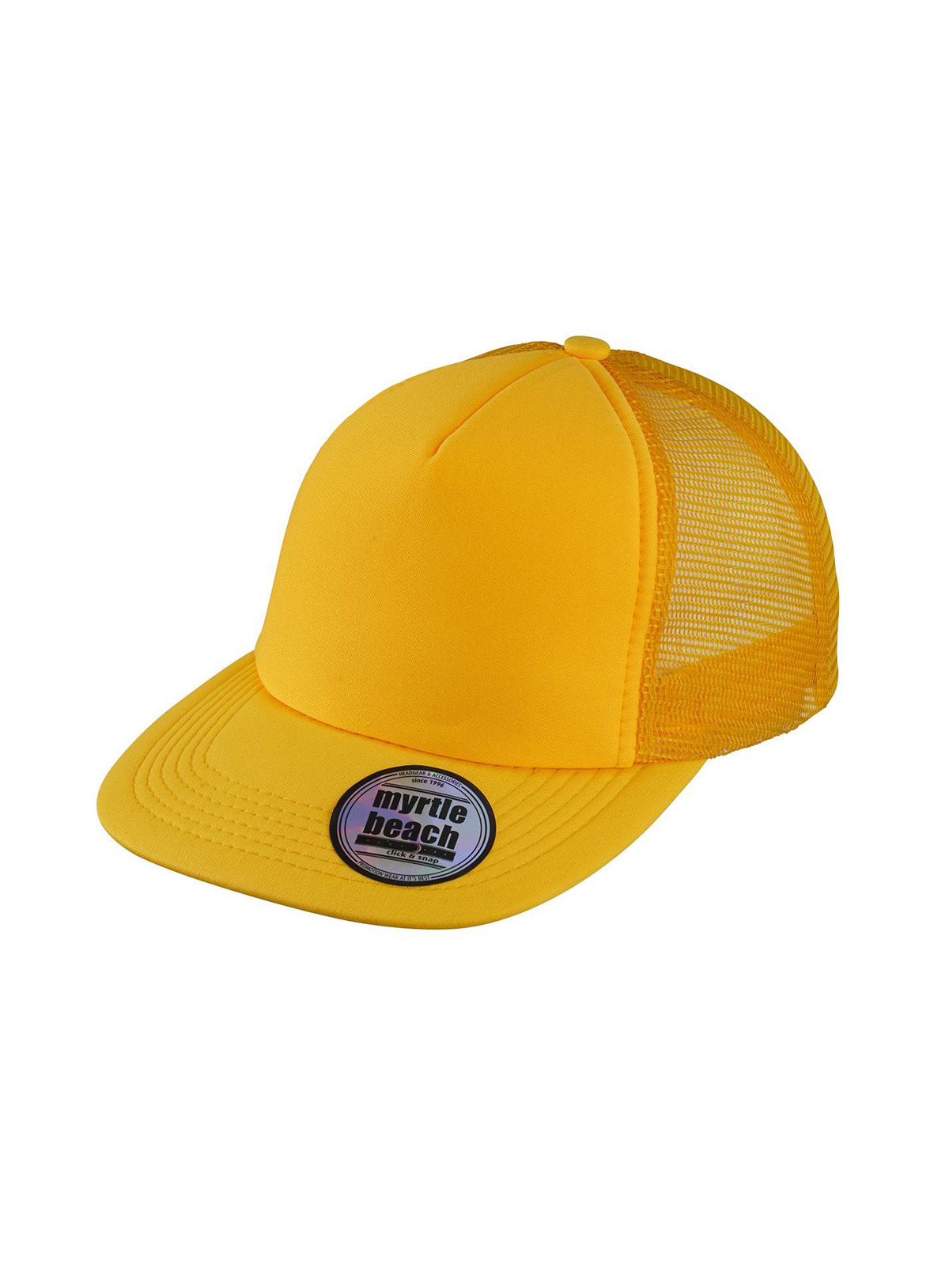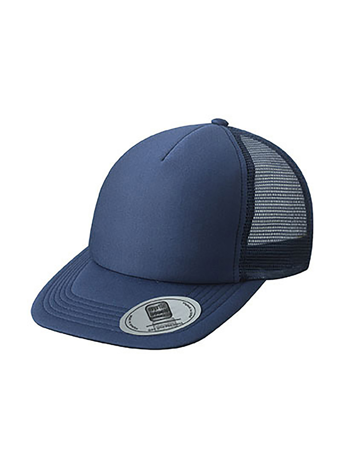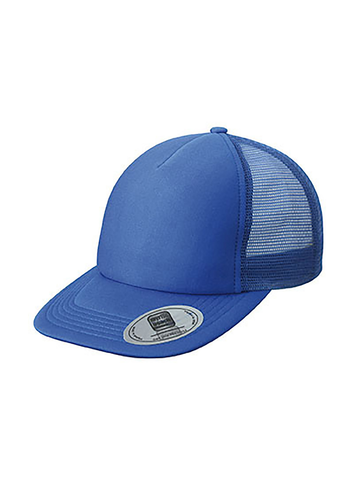 Cappello a rete a 5 pannelli con visiera piatta 6 cuciture decorative sulla visiera, Fascetta, tergisudore in cotone, Etichetta sulla visiera. Regolazione taglia con chiusura “”click & snap””