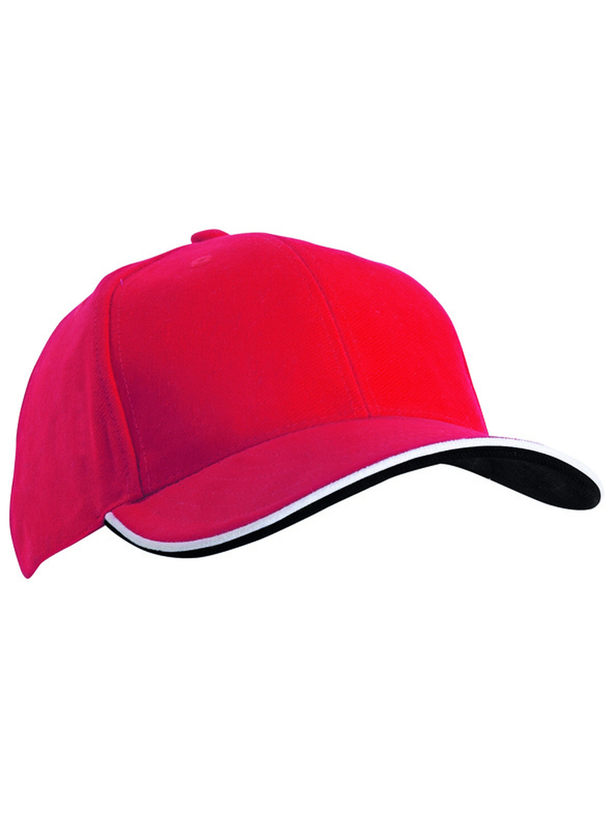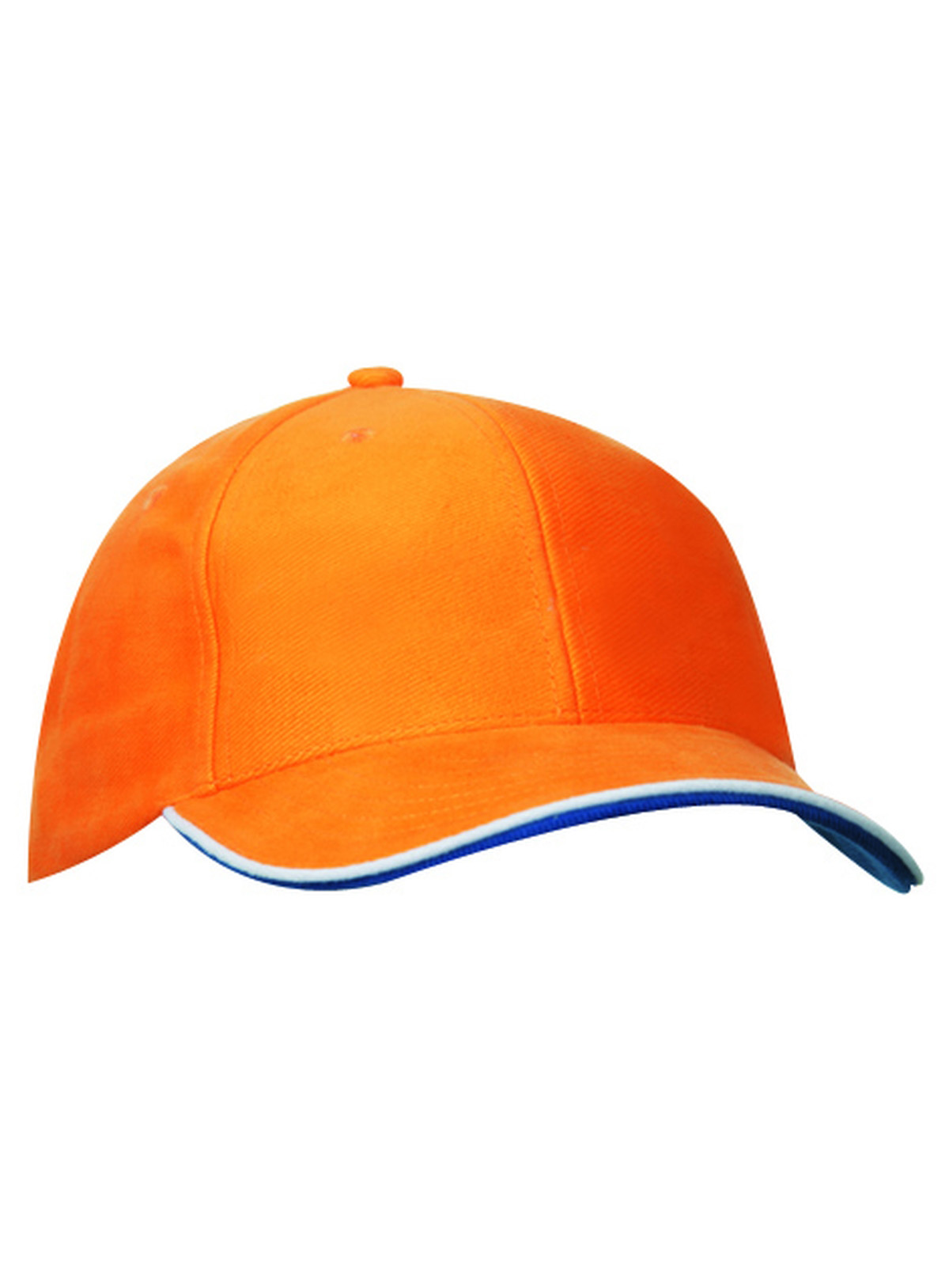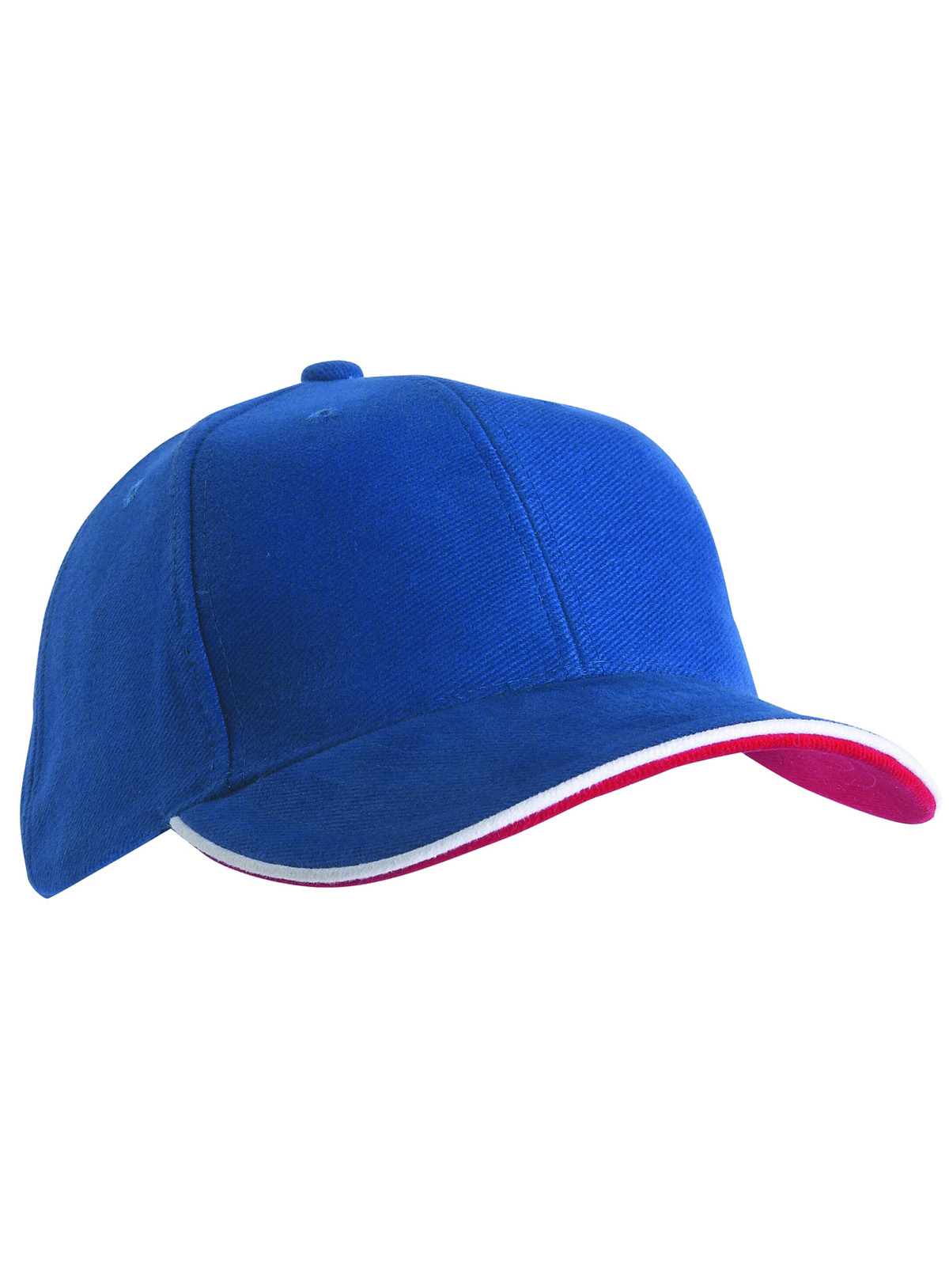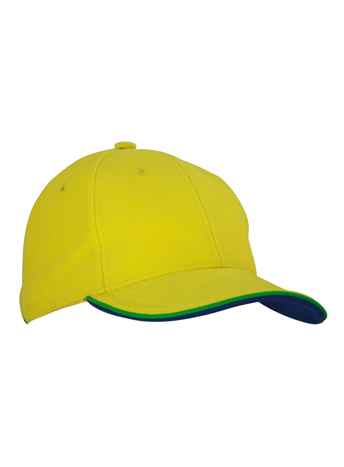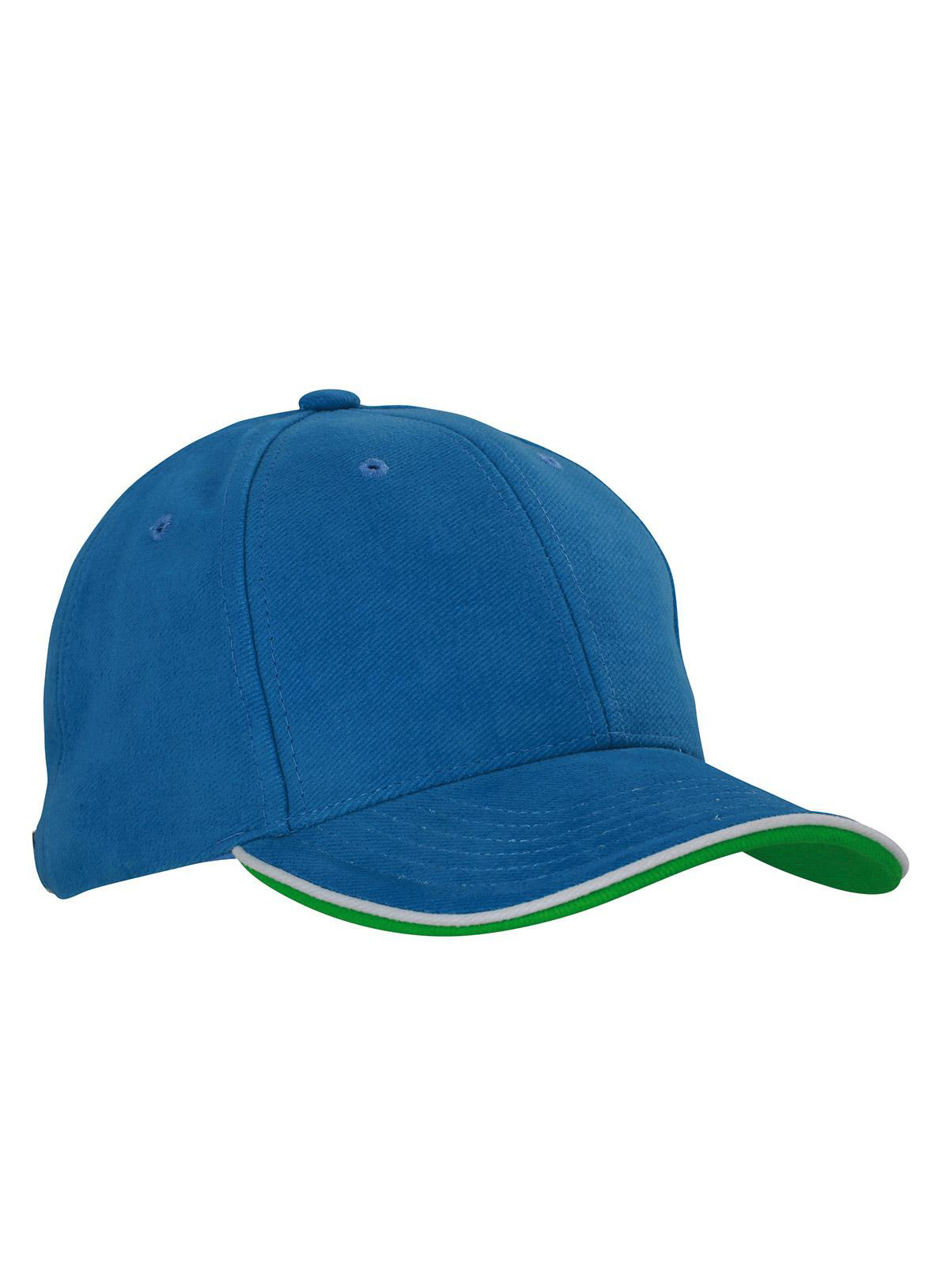 Cap a 6 pannelli con doppio sandwich 6 fori traspiranti imbastiti, 6 cuciture decorative sulla visiera, Parte inferiore della visiera a contrasto. Pannelli frontali laminati, Fascetta tergisudore imbottita in Satin, Chiusura a clip in argento opaco con filetto a costola a contrasto e asola in stoffa , Cap bimbo coordinato MB7005. Cotone spazzolato forte , policromo, Sandwich