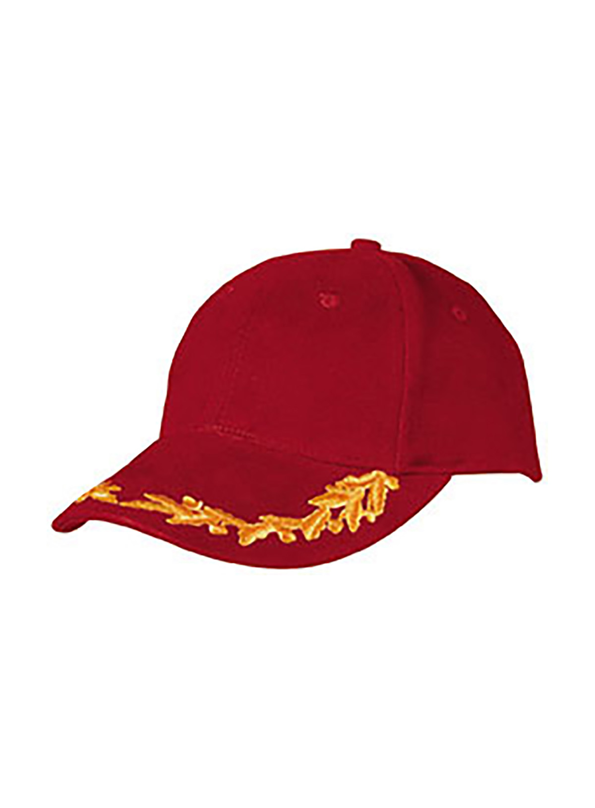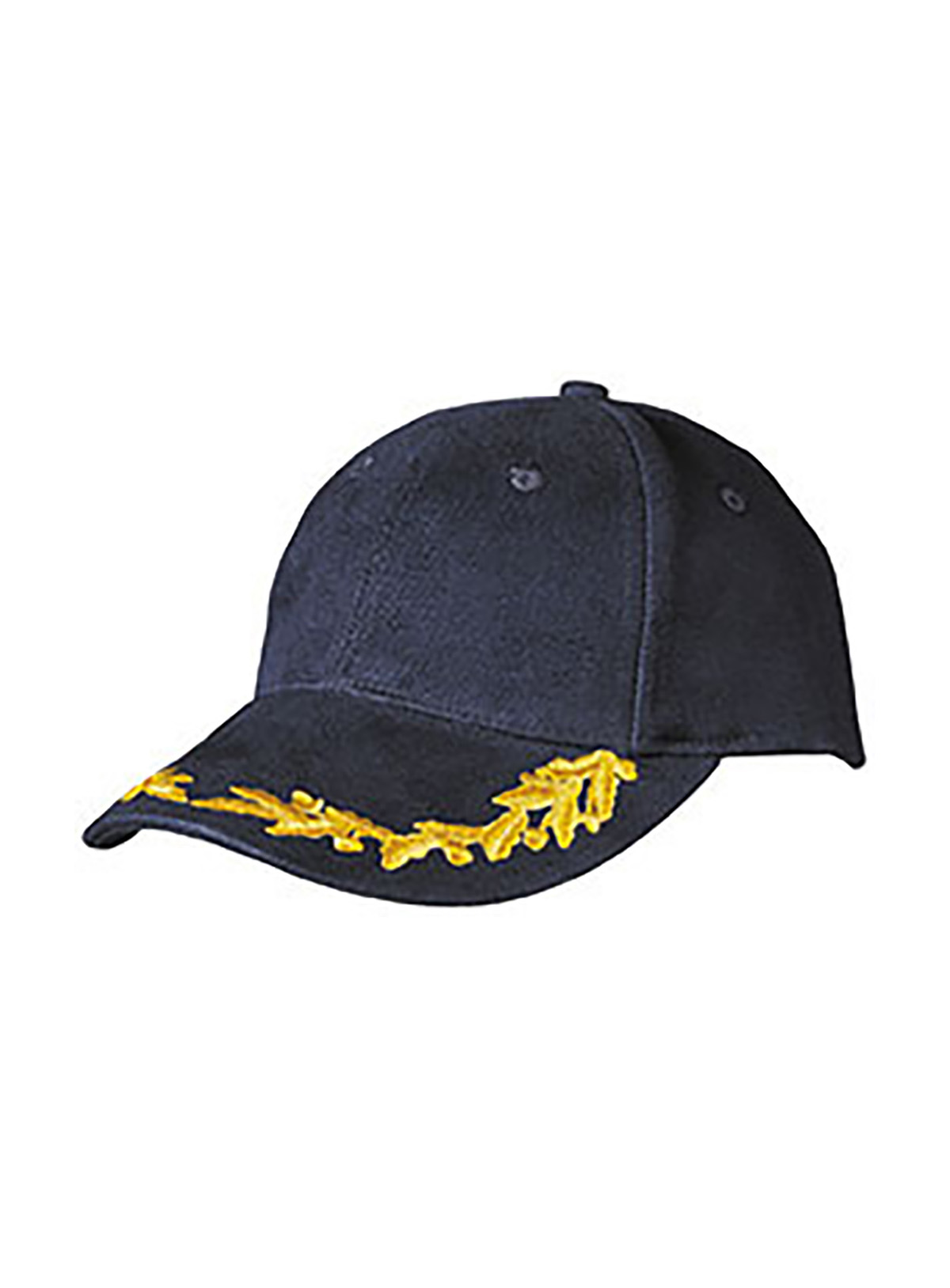 Cap particolare con foglia di quercia ricamata in lurex sulla visiera 6 fori traspiranti imbastiti. Pannelli frontali laminati . Fascetta tergisudore imbottita in satin, Fibbia in metallo argentato con bottone a pressione e asola in stoffa, Cotone spazzolato forte,policromo, Sandwich