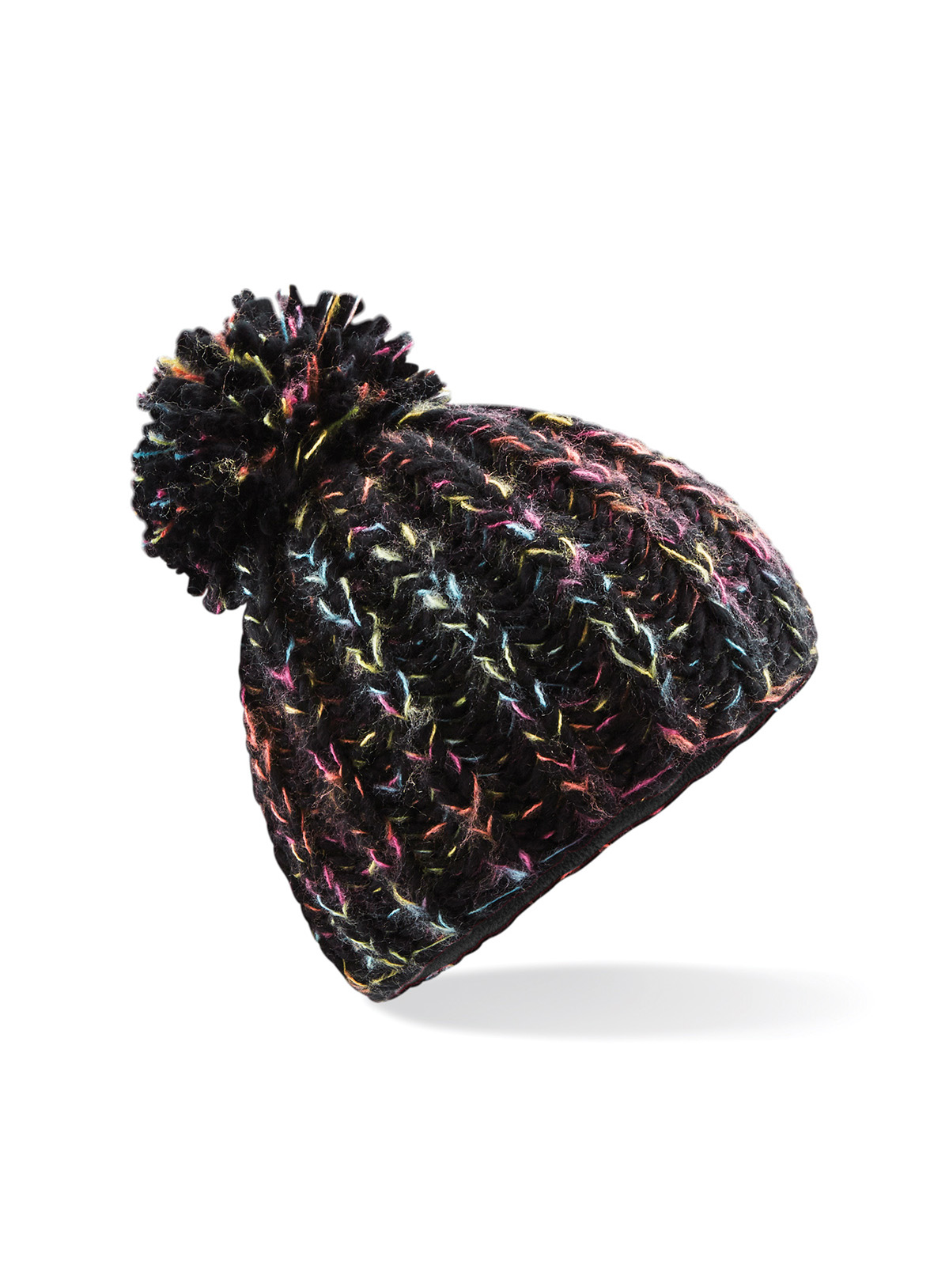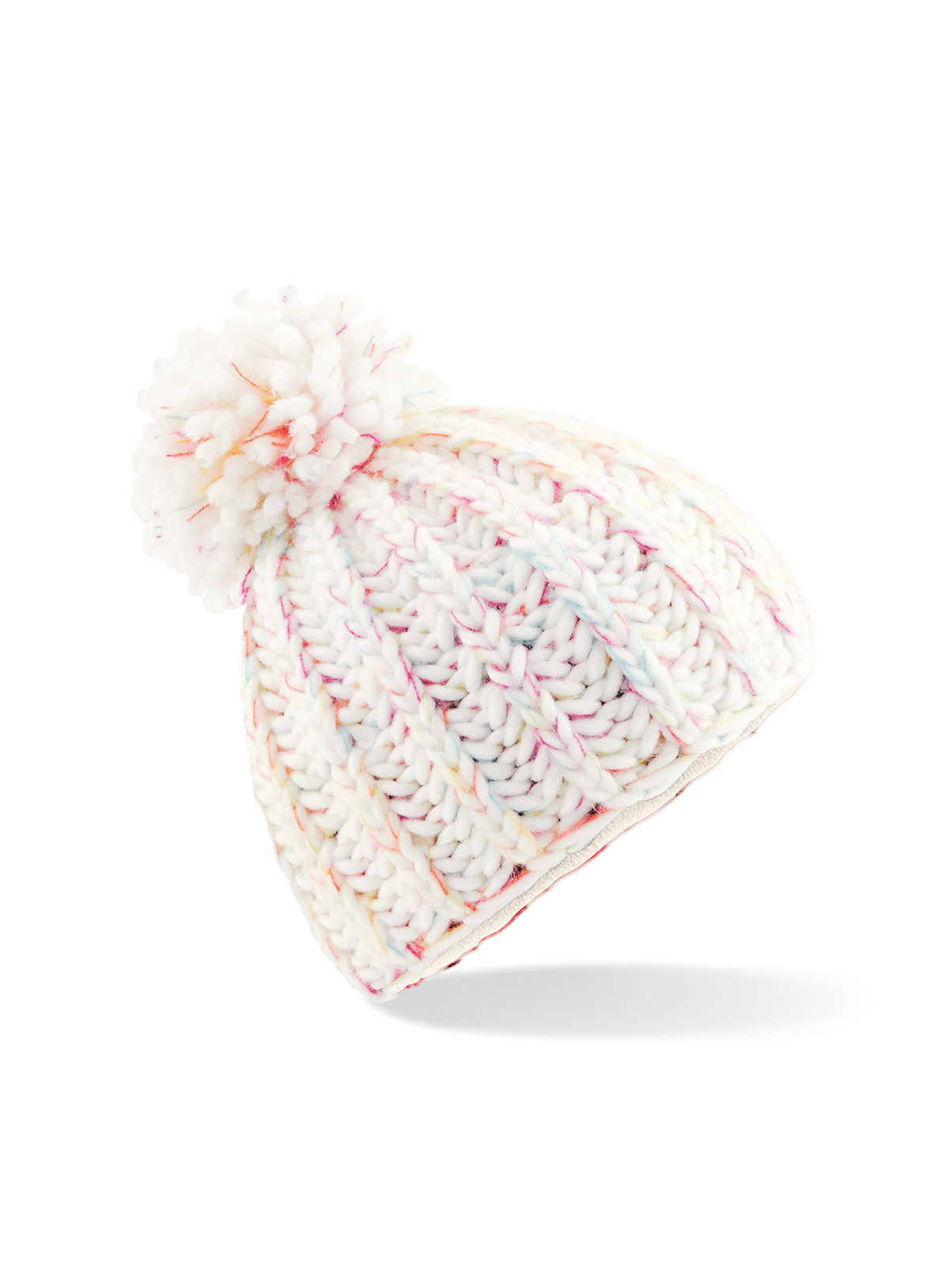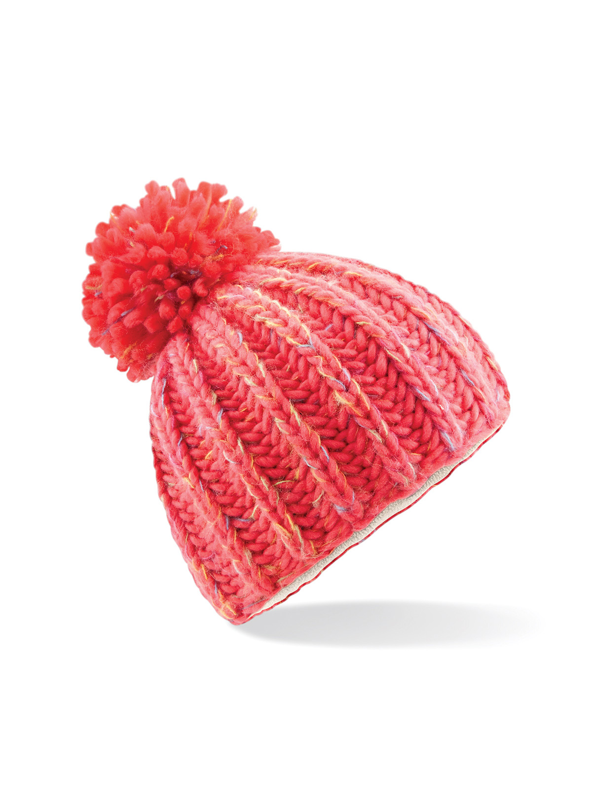 Modello classico, maglia realizzata con diversi filati pesanti, molto morbida al tatto, fascia termica di tessuto felpato, grande pom pom tono su tono.