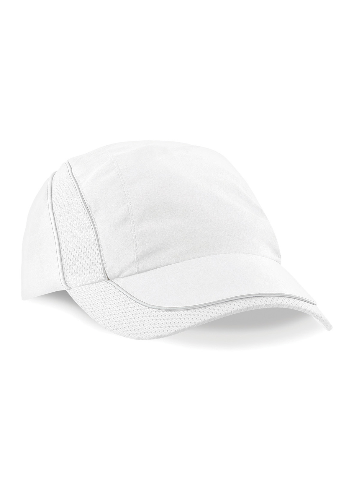 Cappellino con bande traforate ai lati e inserti fluorescenti. Chiusura/apertura a strappo per l’aggiustamento della misura.