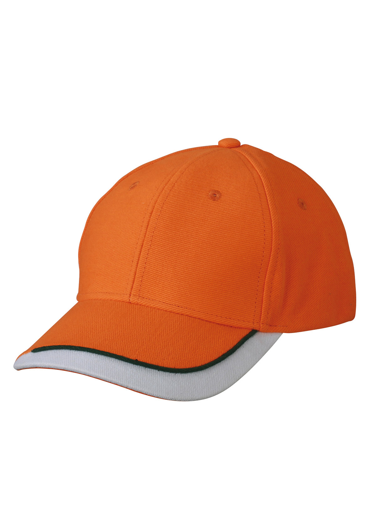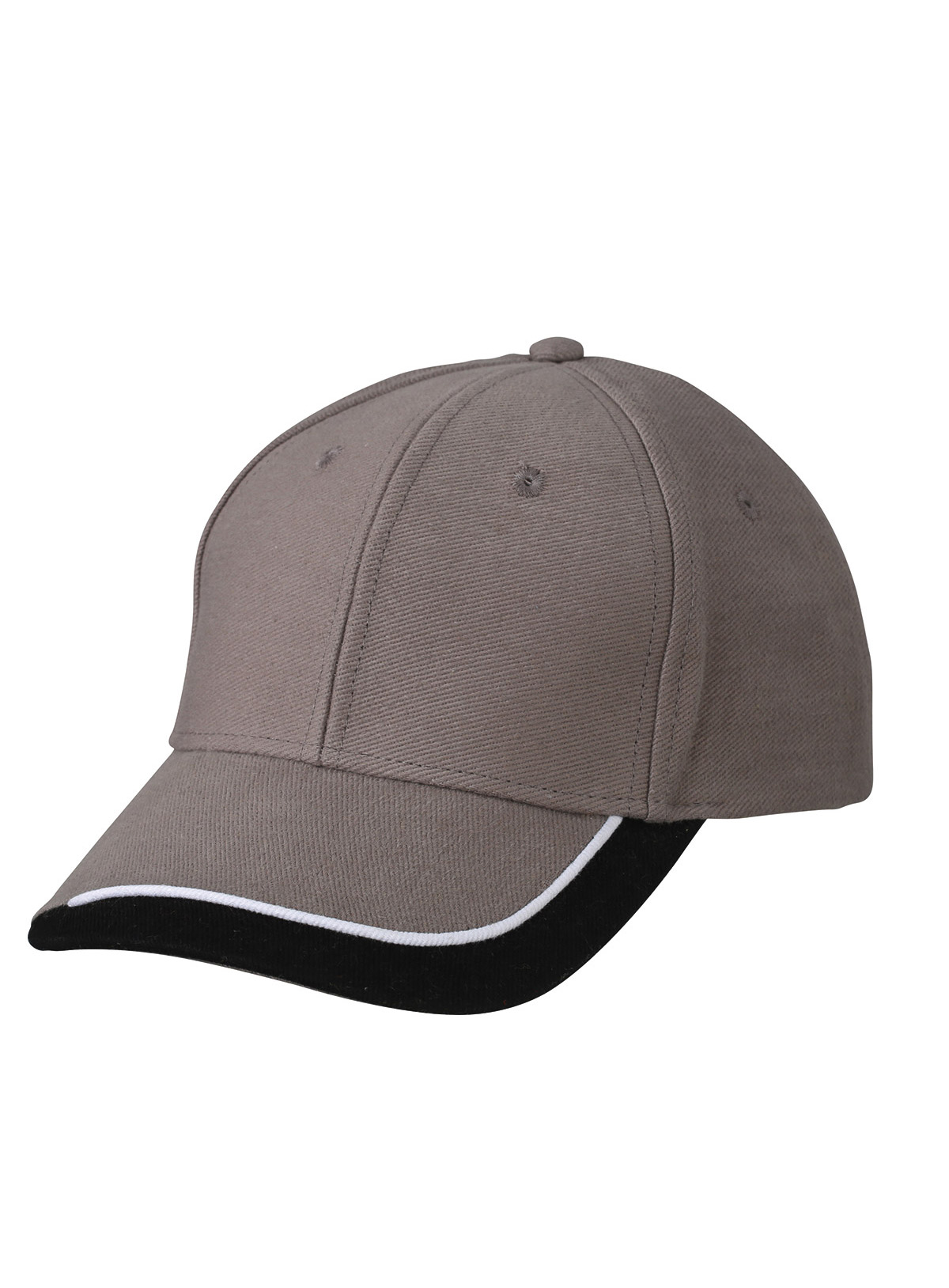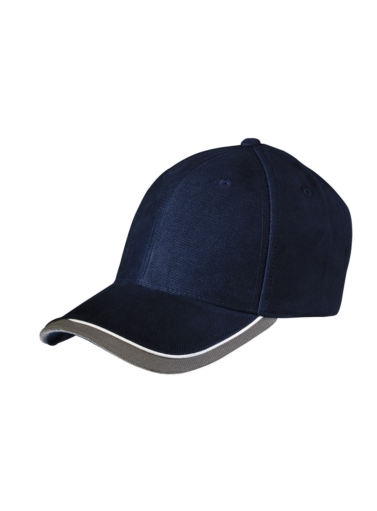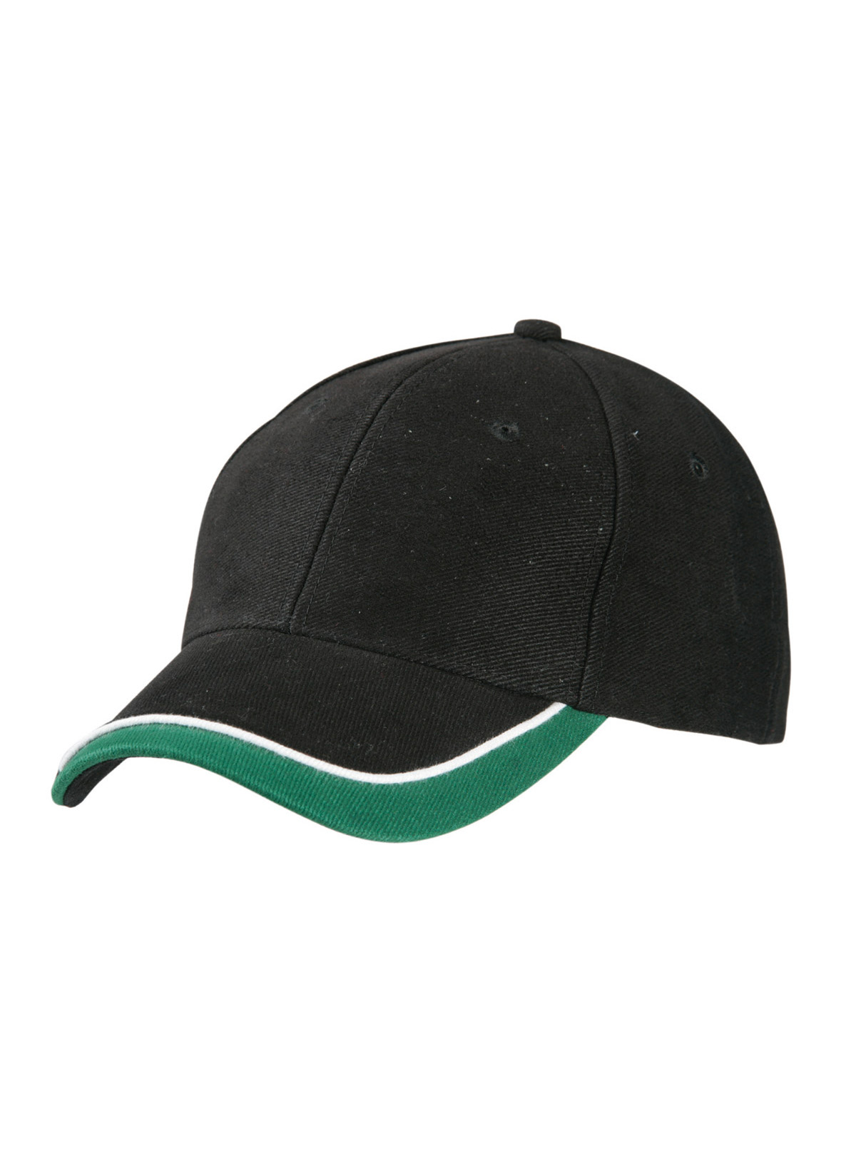 Cappello a 6 pannelli con sandwich in tre colori Visiera sandwich con filetto a costola a contrasto. Pannelli frontali laminati. Fascetta tergisudore imbottita in satin. Chiusura a clip argentata con asola imbastita. Cotone spazzolato forte, policromo, Sandwich