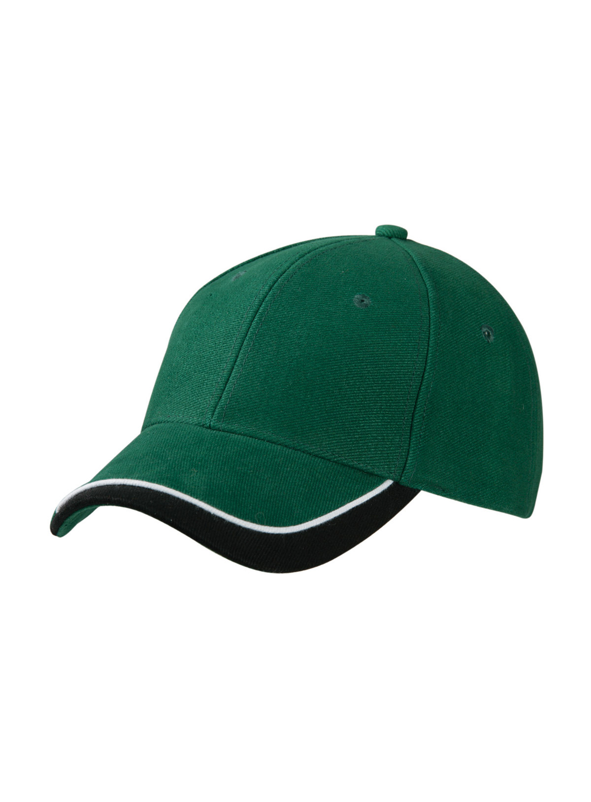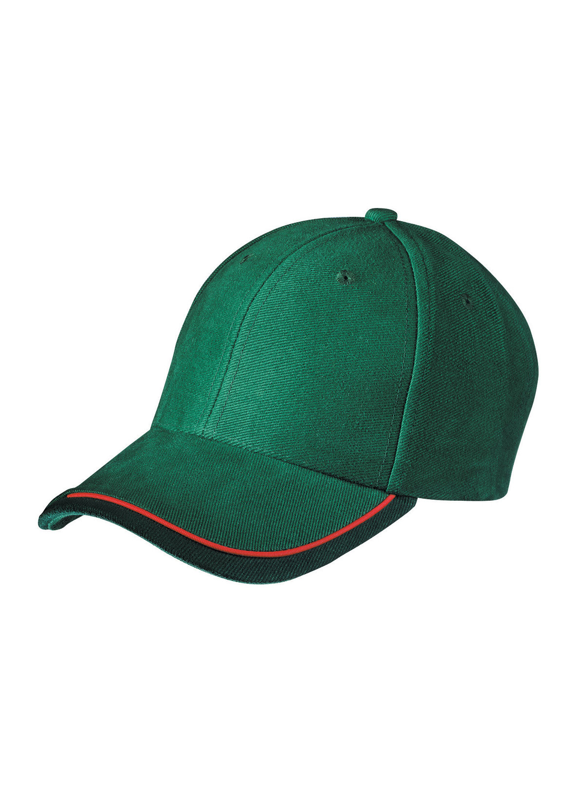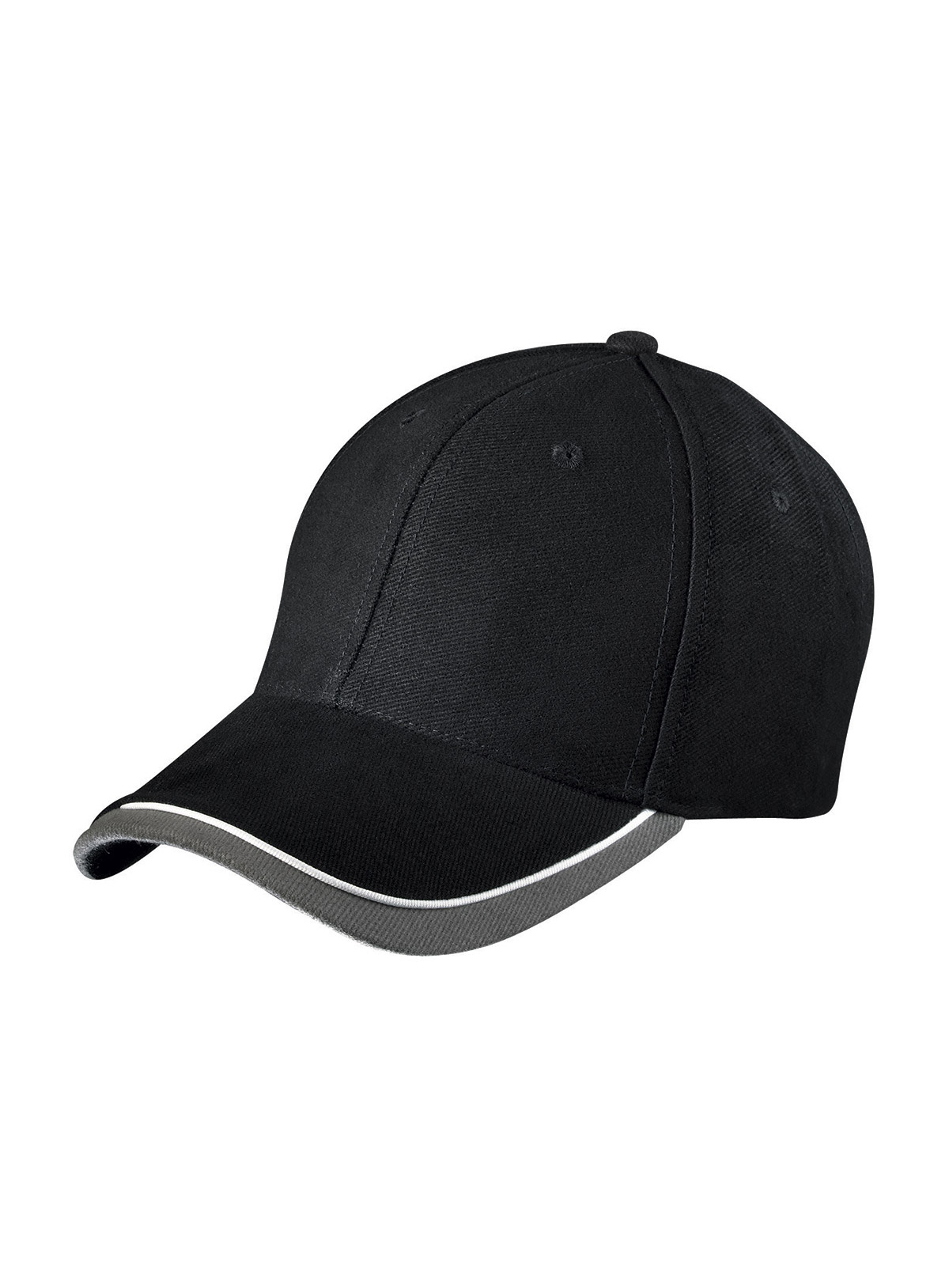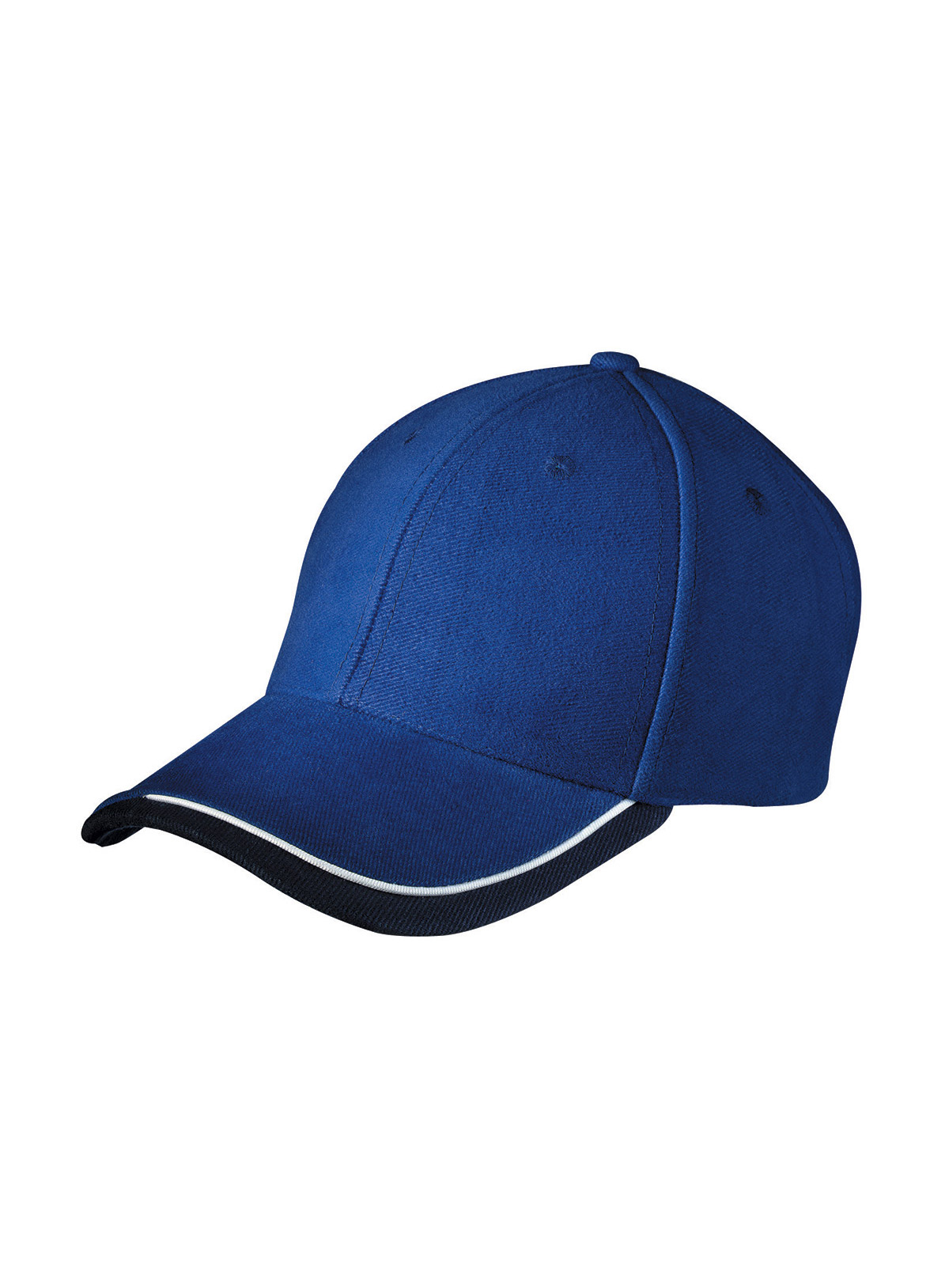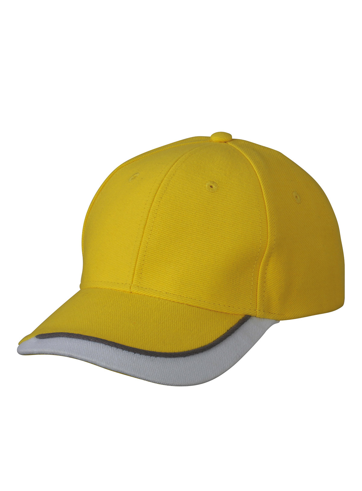 Cappello a 6 pannelli con sandwich in tre colori Visiera sandwich con filetto a costola a contrasto. Pannelli frontali laminati. Fascetta tergisudore imbottita in satin. Chiusura a clip argentata con asola imbastita. Cotone spazzolato forte, policromo, Sandwich