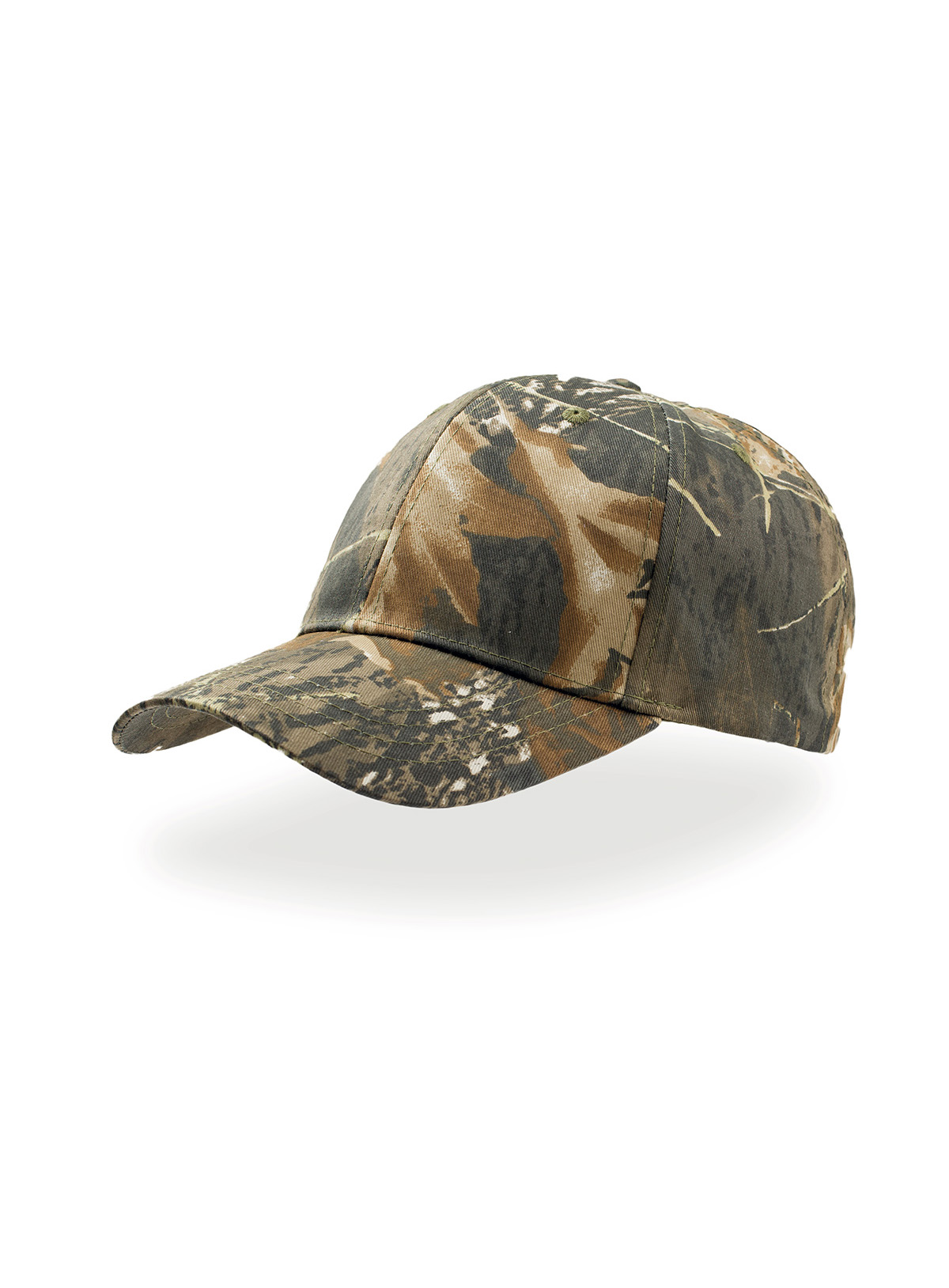 Cappellino 6 pannelli con stampa camouflage, pannelli frontali strutturati, visiera precurvata, chiusura con velcro, 6 occhielli cuciti, parasudore 100% poliestere.