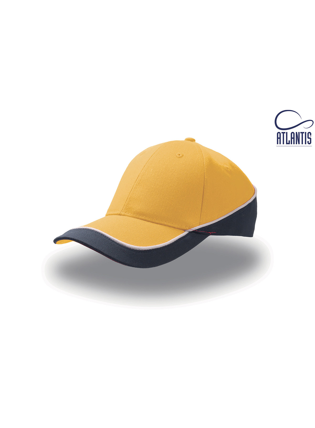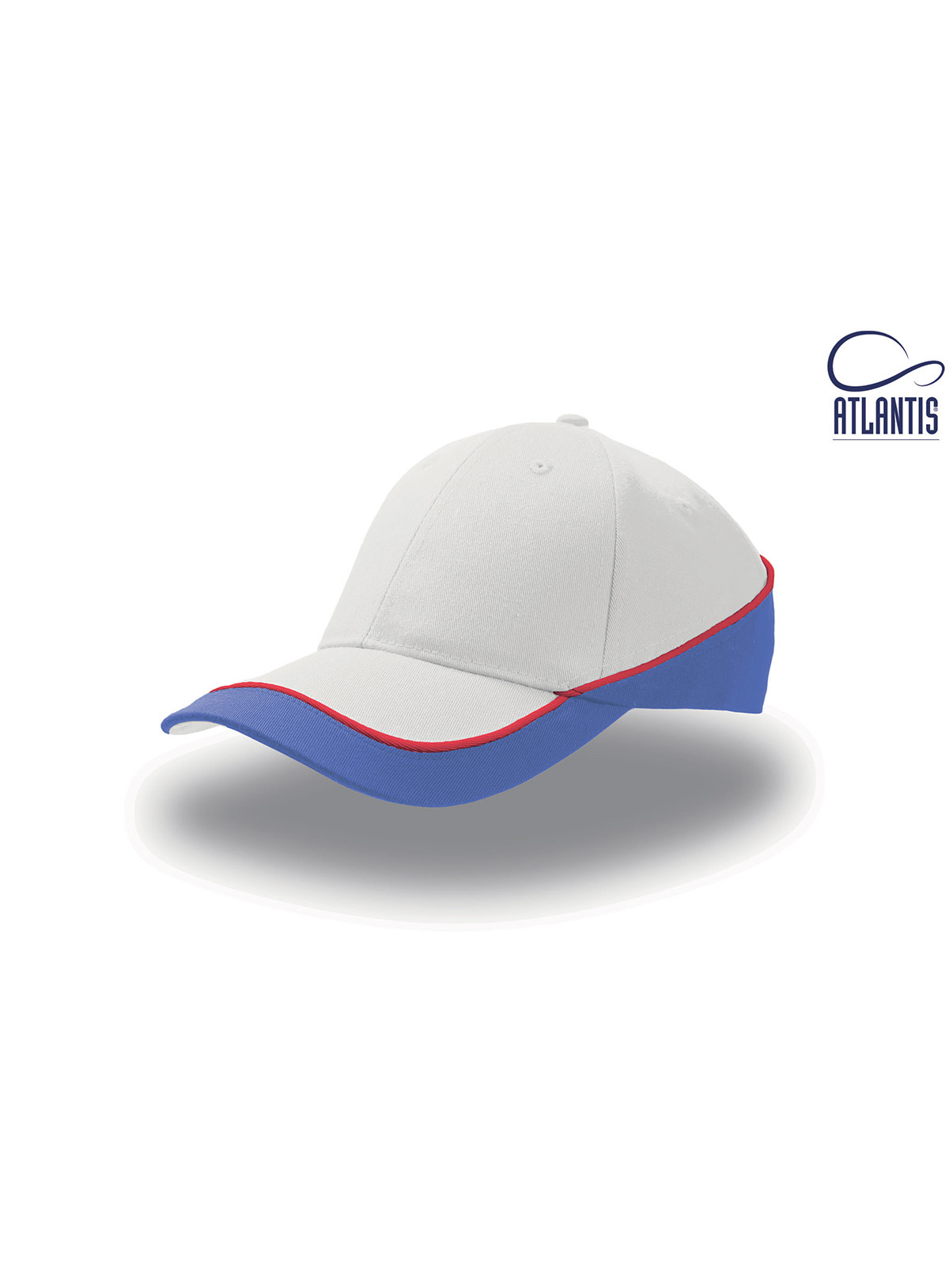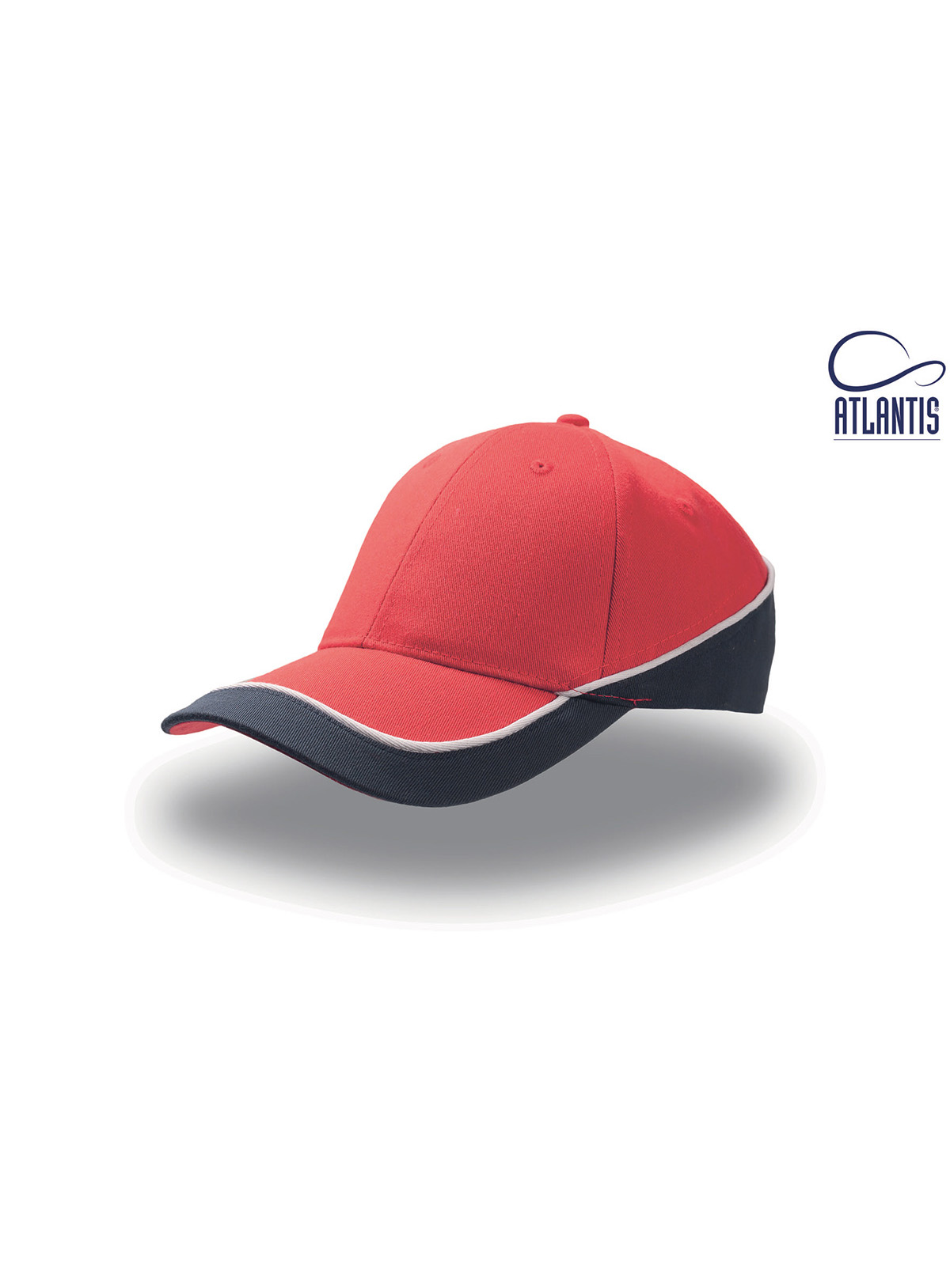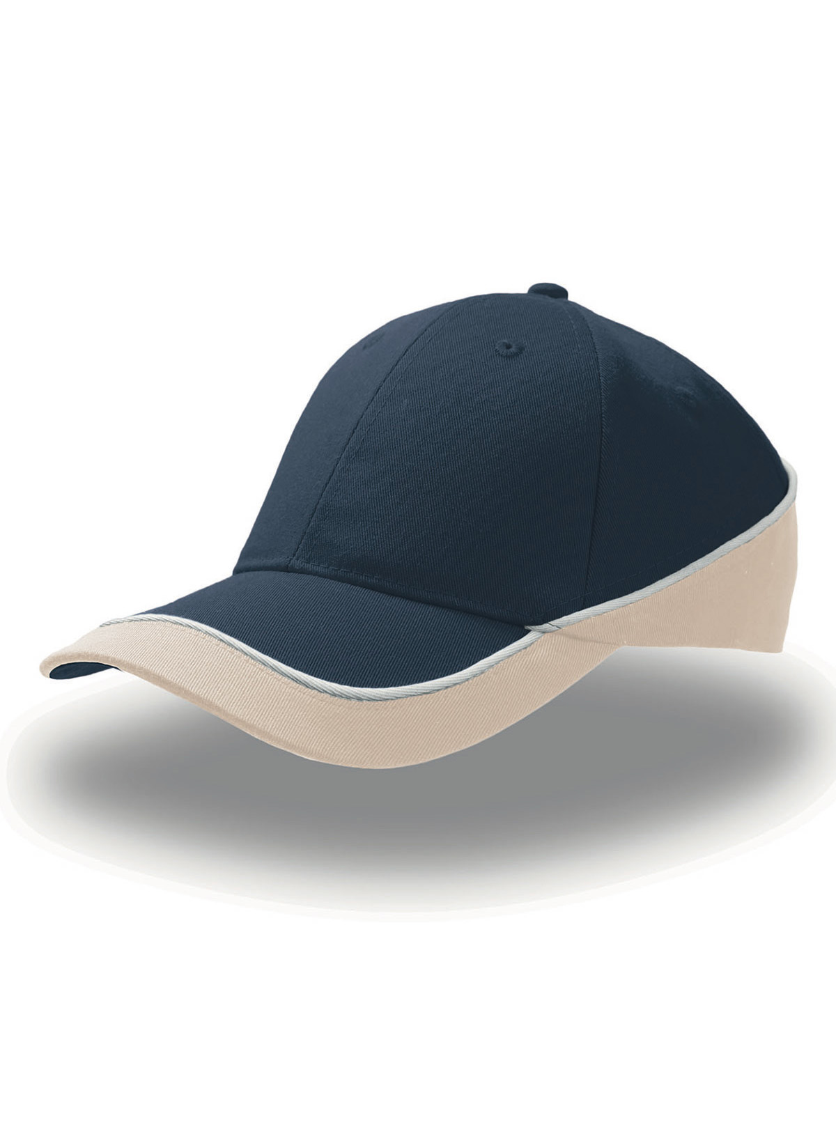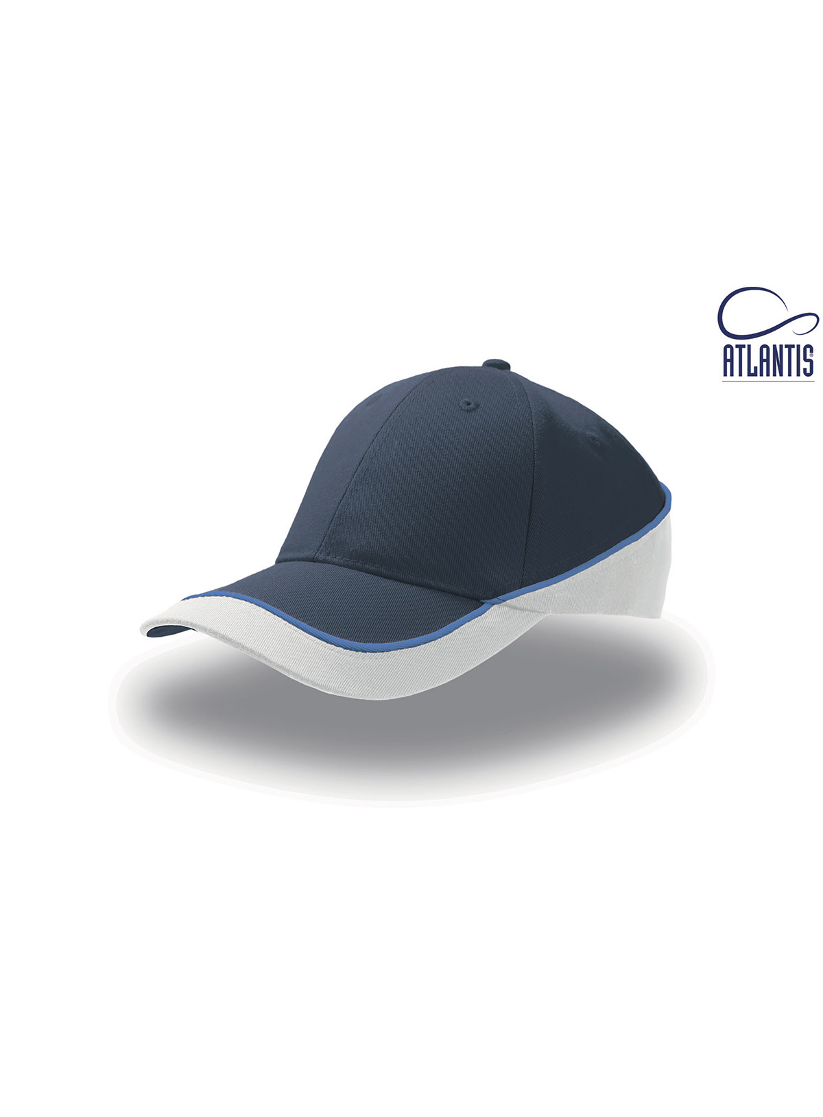 Cappellino tipo baseball. Linea aereodinamica. Due colori abbinati con profilo a contrasto. Chiusura con cinturino in tessuto e velcro.
