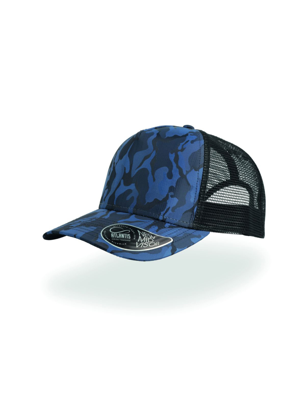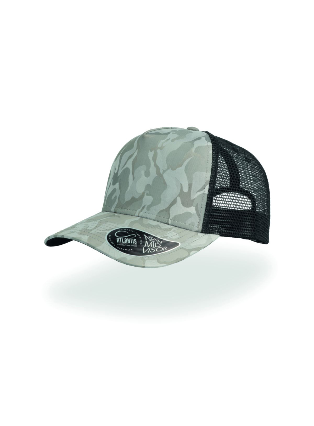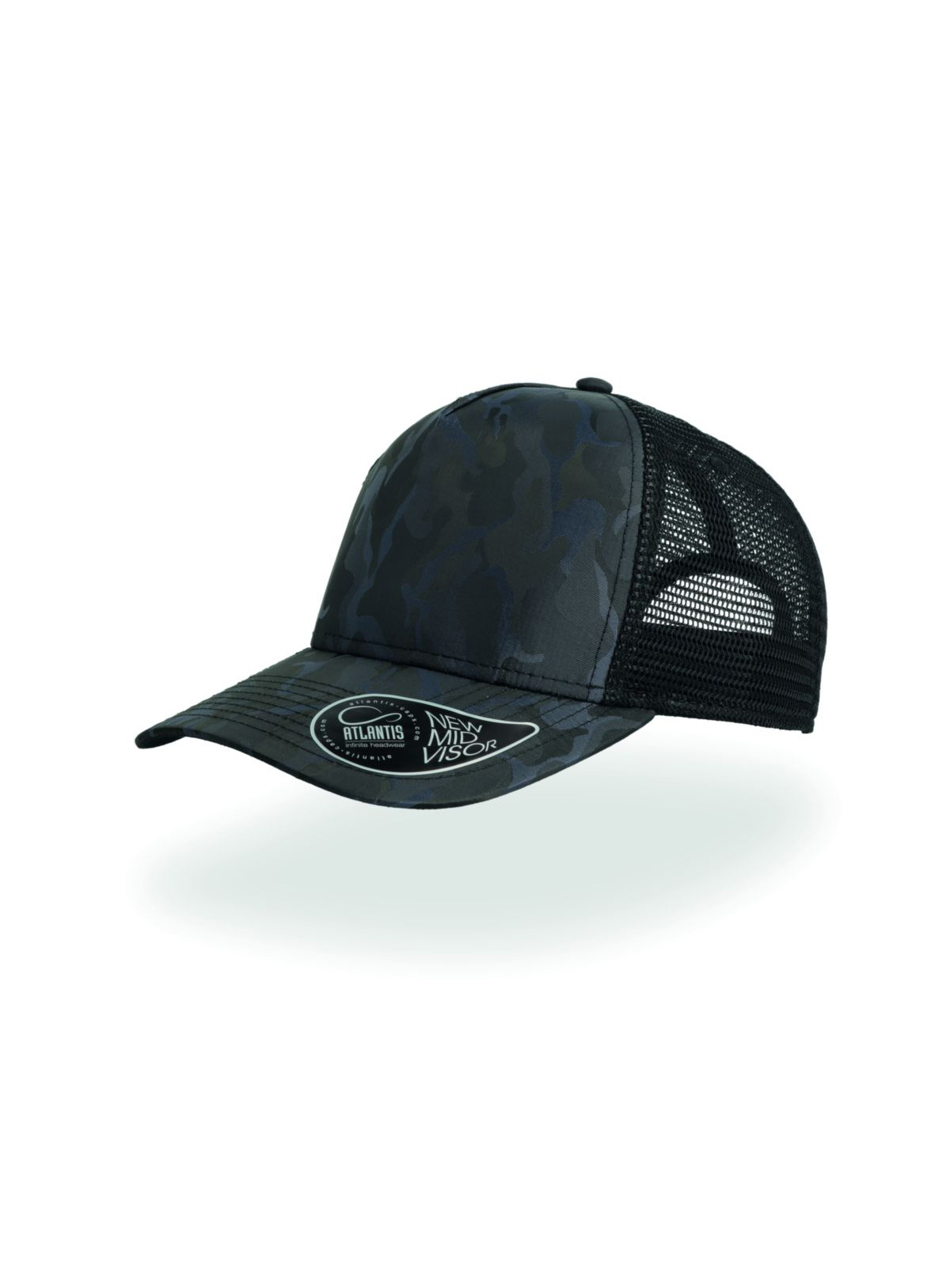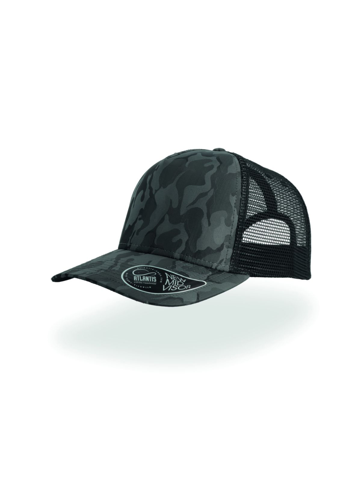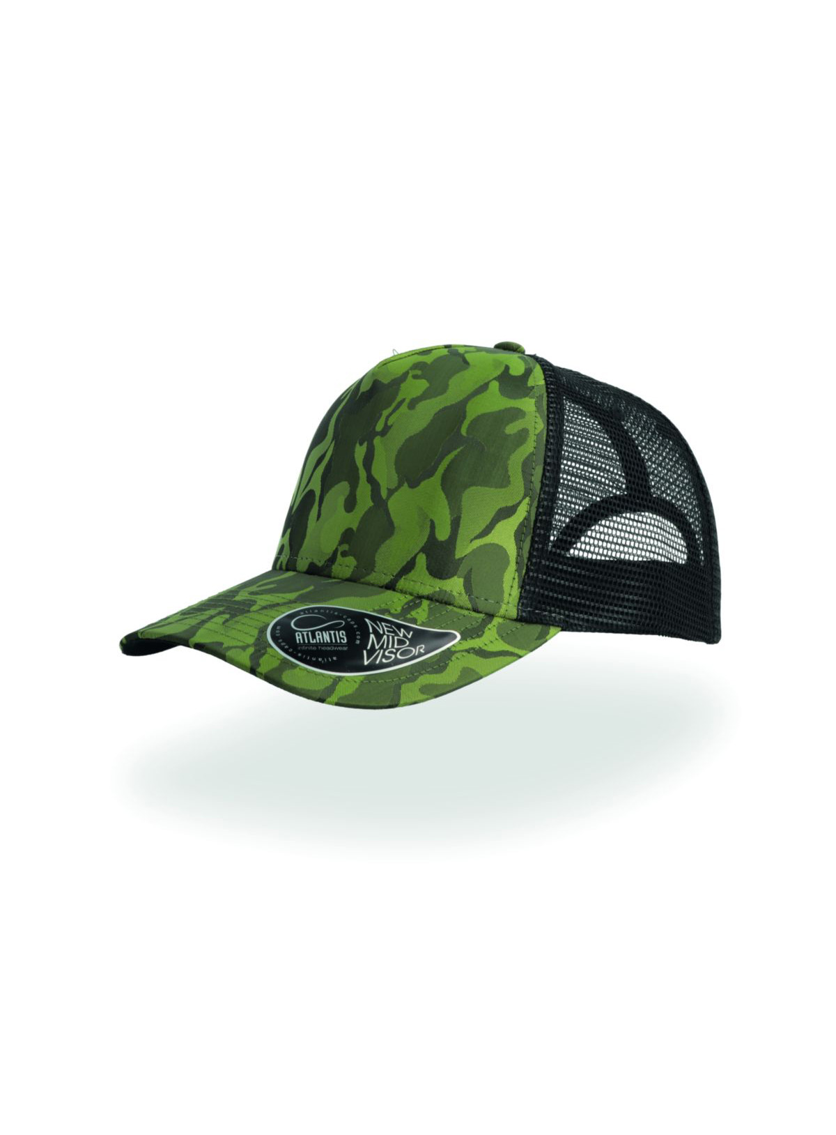 5 pannelli, trucker cap, sottovisiera a contrasto, occhielli ricamati, visiera pre-curvata, adesivo sulla visiera, chiusura in pvc, 8 cuciture su visiera, parasudore in cotone