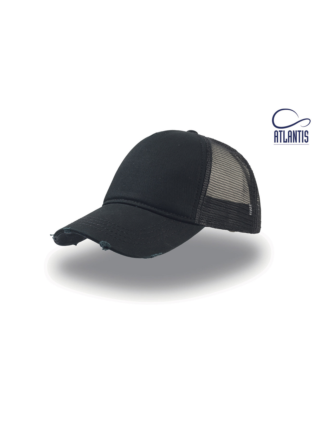 5 pannelli, trucker cap, mesh posteriore, mesh laterale, visiera destroyed, pannello frontale non strutturato, visiera pre-curvata, chiusura in pvc, ideale per la stampa, 4 cuciture su visiera,