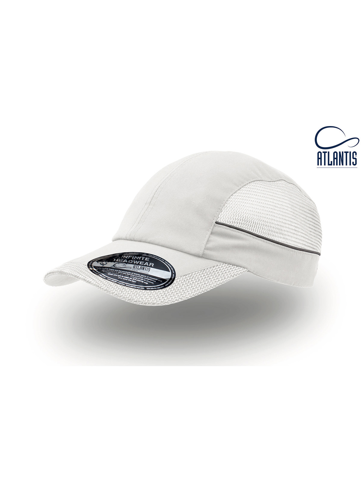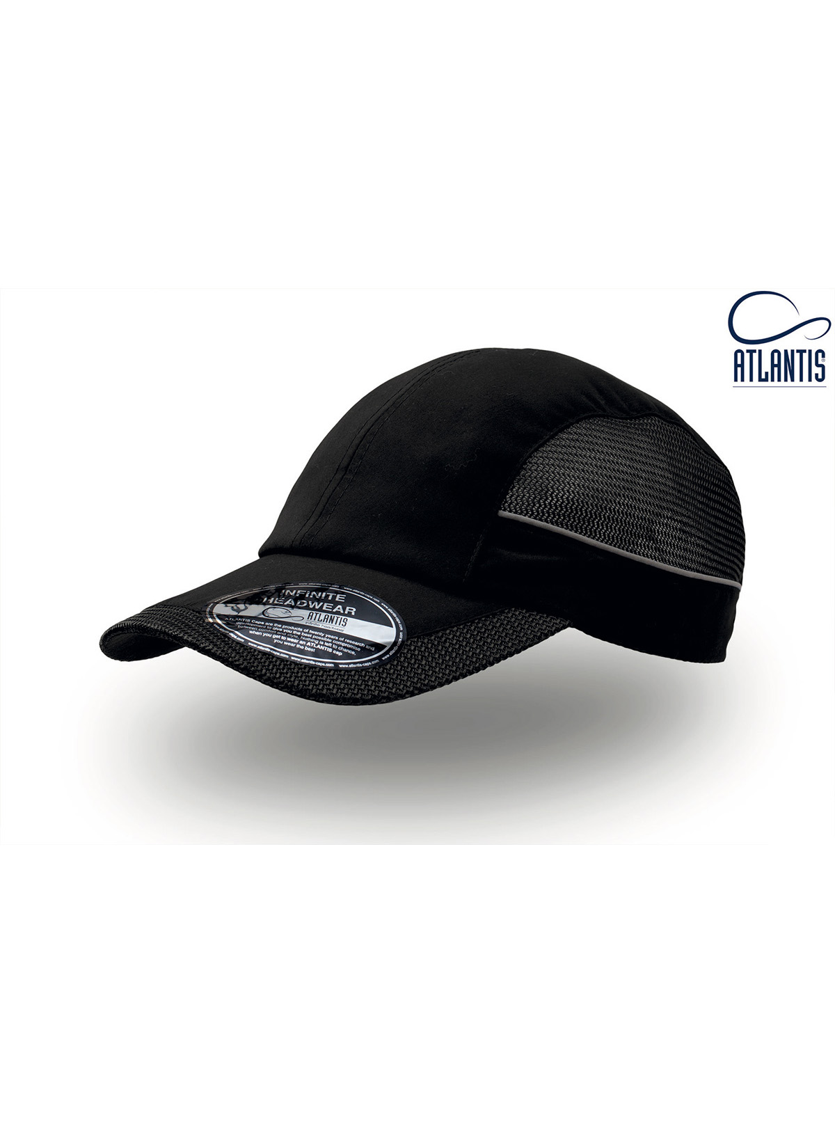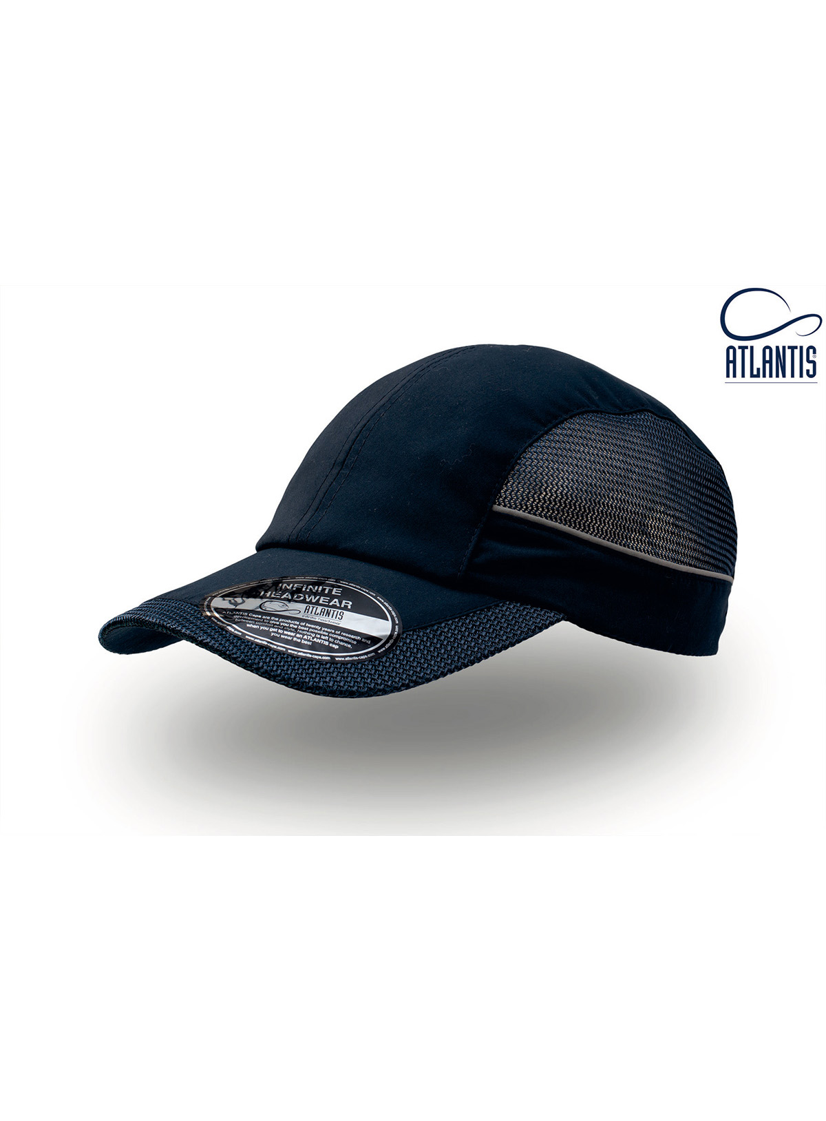 Cappellino 4 pannelli con inserti a rete ai lati e sulla visiera precurvata, pannelli frontali non strutturati, nessun occhiello, parasudore 100% poliestere, piping catarifrangente a contrasto dietro e sui lati