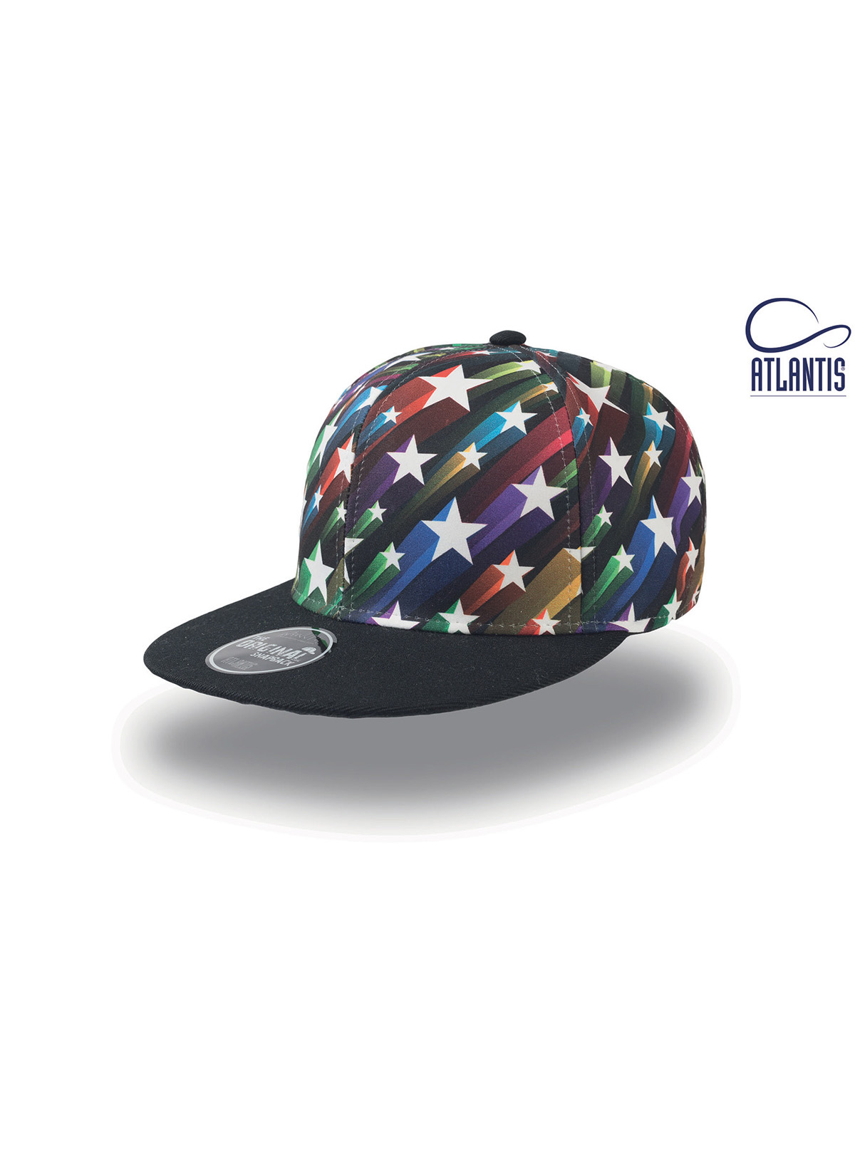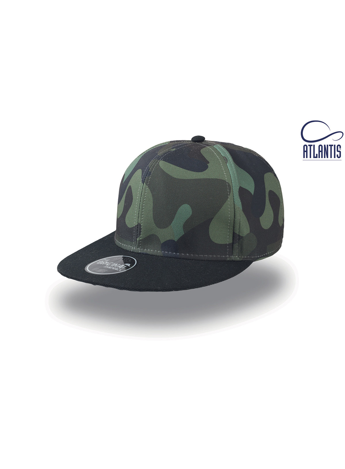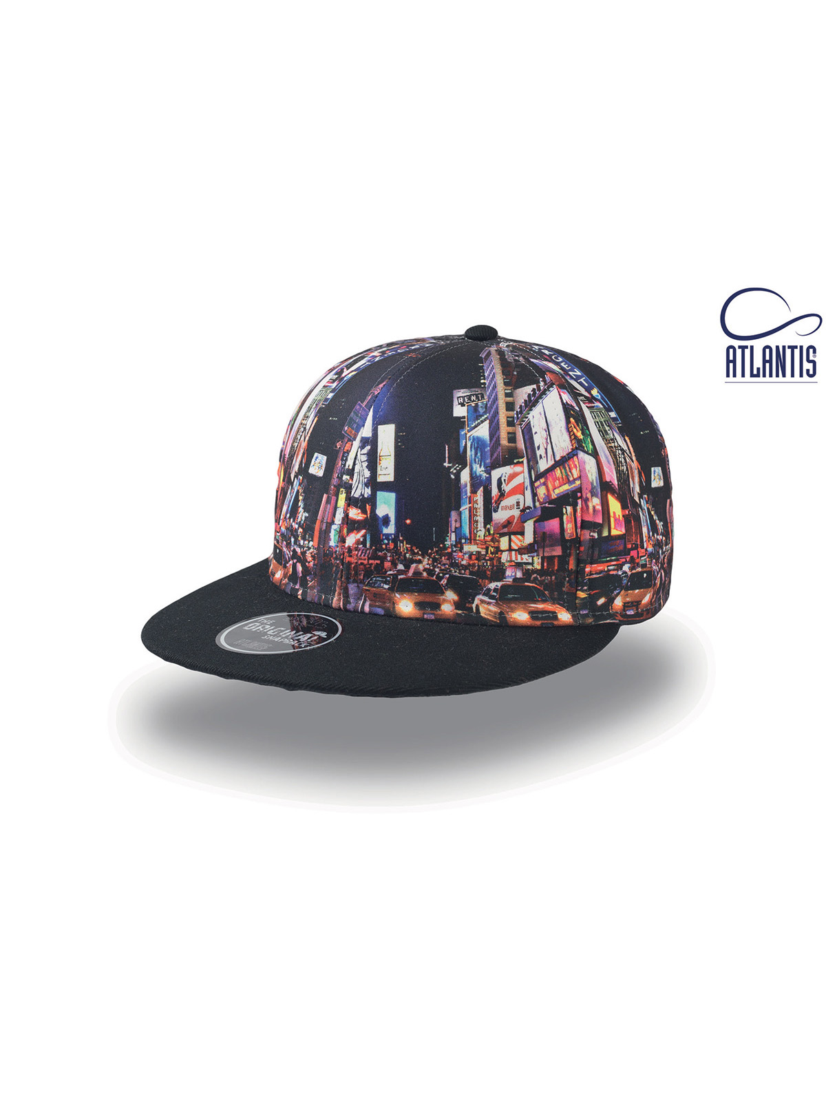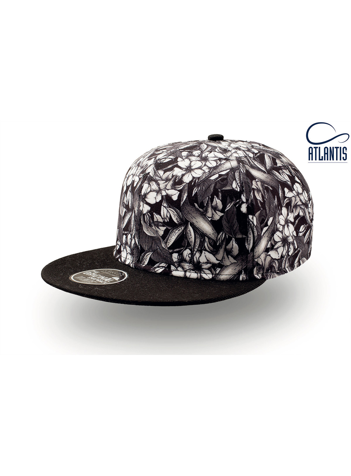 Cappellino 6pannelli in stile rap con visiera piatta. Pannello frontale rinforzato, adesivo sulla visiera, chiusura con fibbia in PVC. Stampa sublimatica