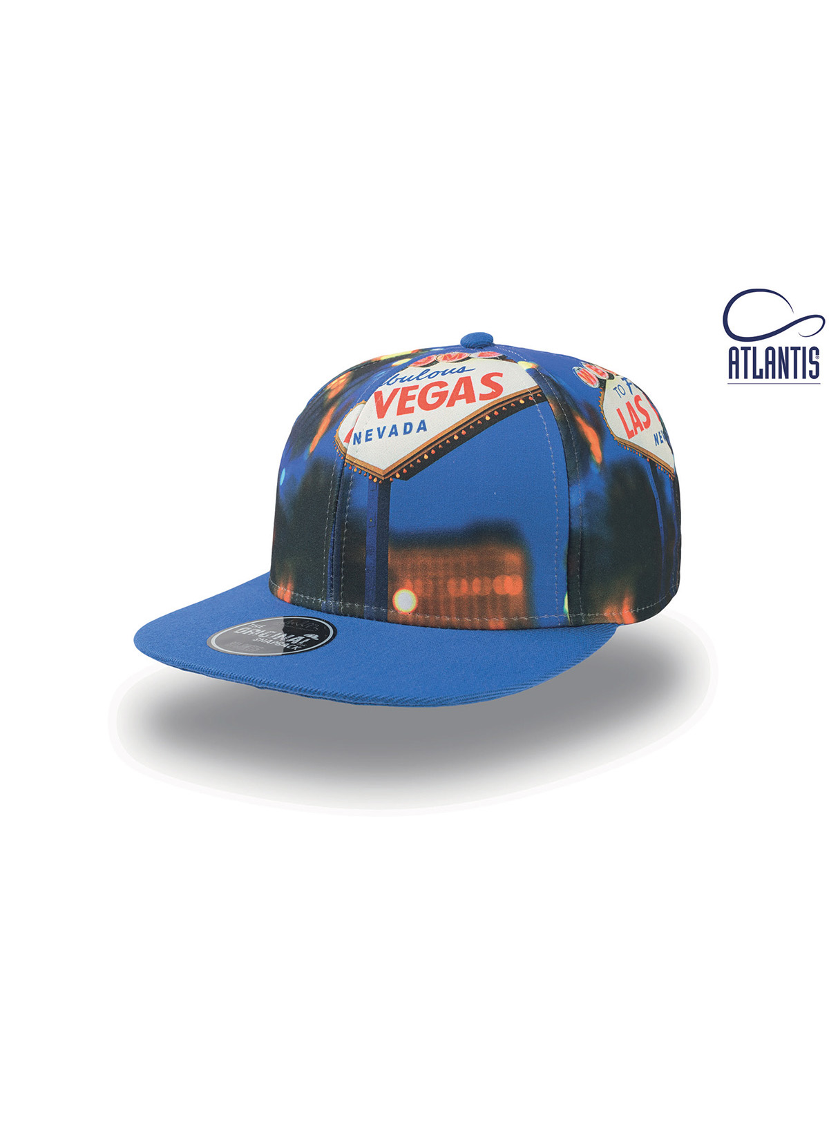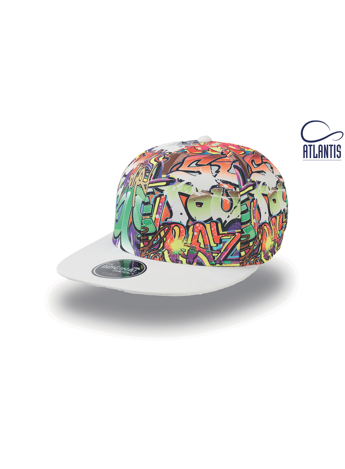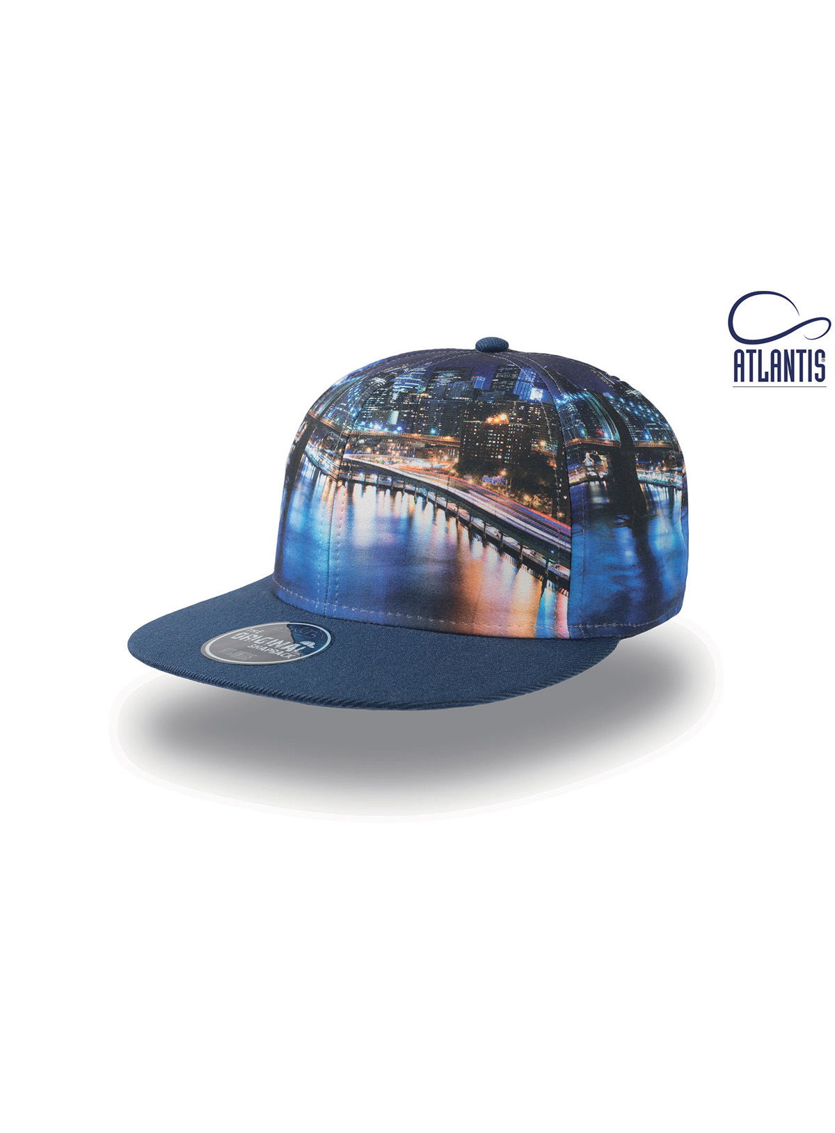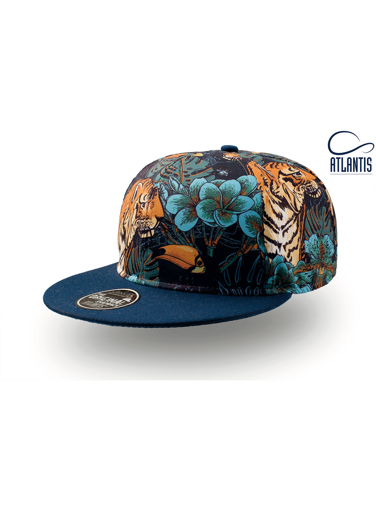 Cappellino 6pannelli in stile rap con visiera piatta. Pannello frontale rinforzato, adesivo sulla visiera, chiusura con fibbia in PVC. Stampa sublimatica