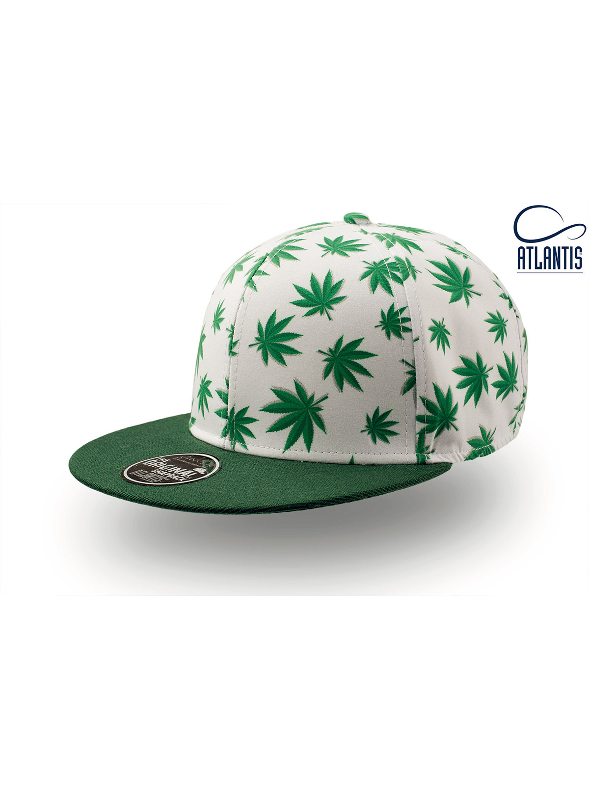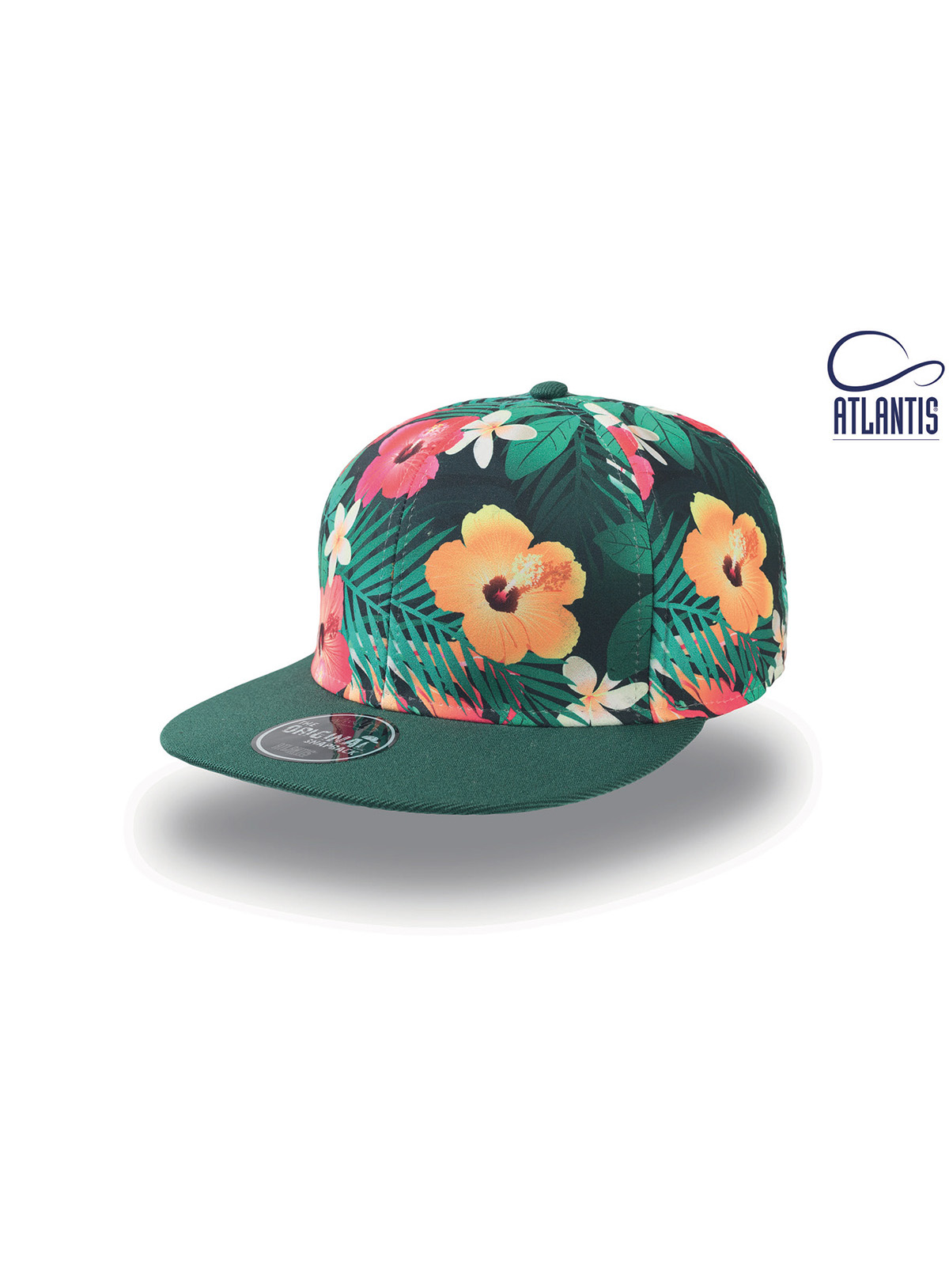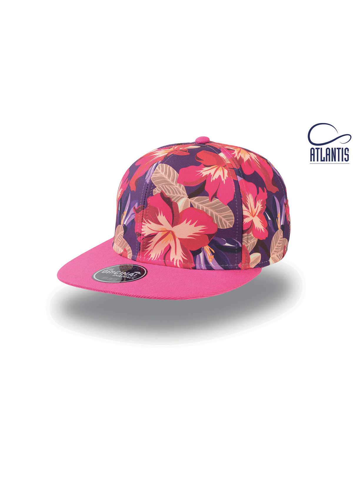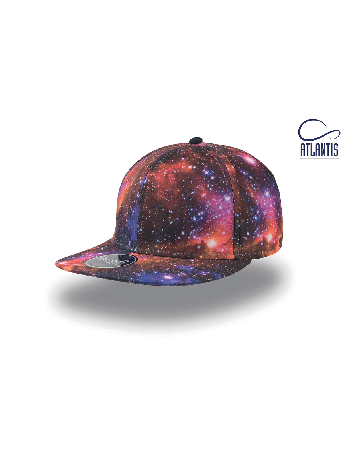 Cappellino 6pannelli in stile rap con visiera piatta. Pannello frontale rinforzato, adesivo sulla visiera, chiusura con fibbia in PVC. Stampa sublimatica