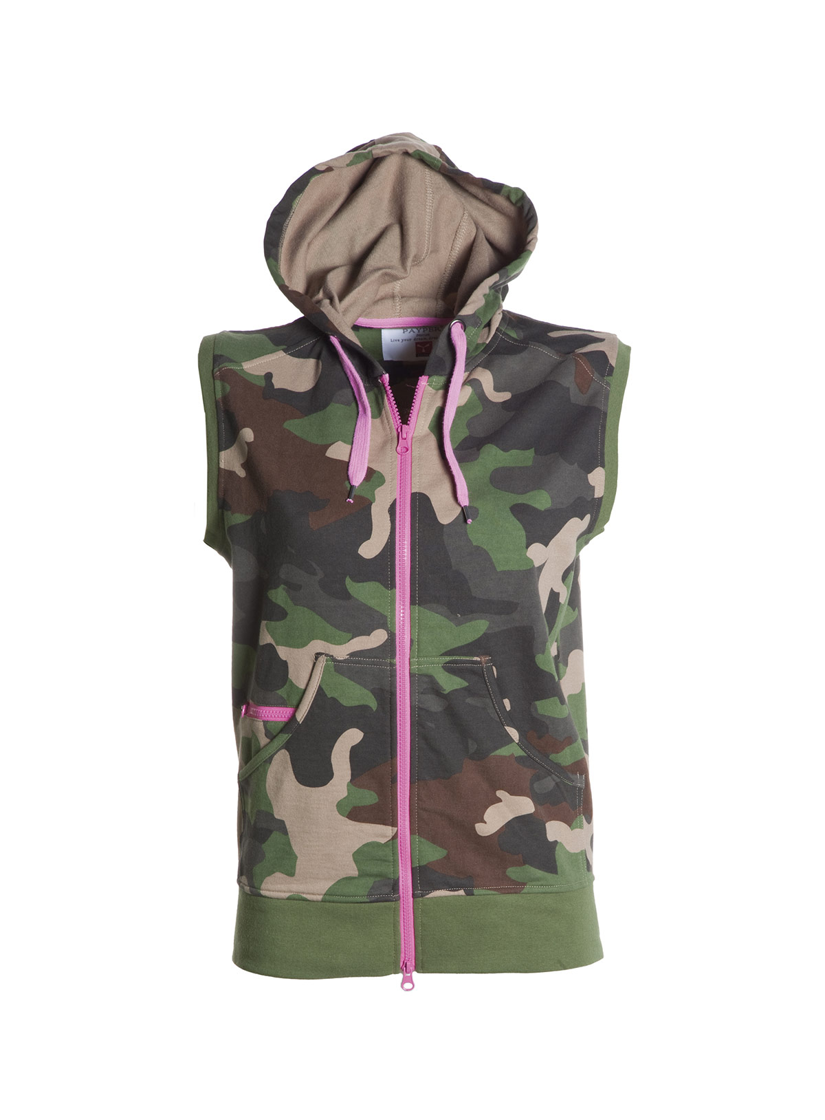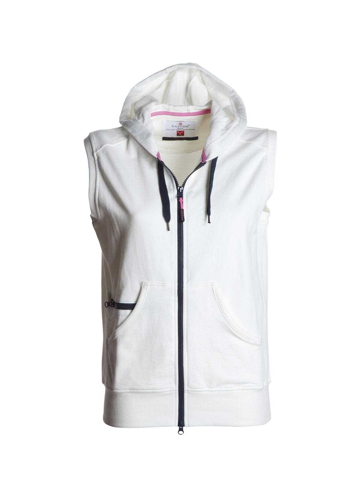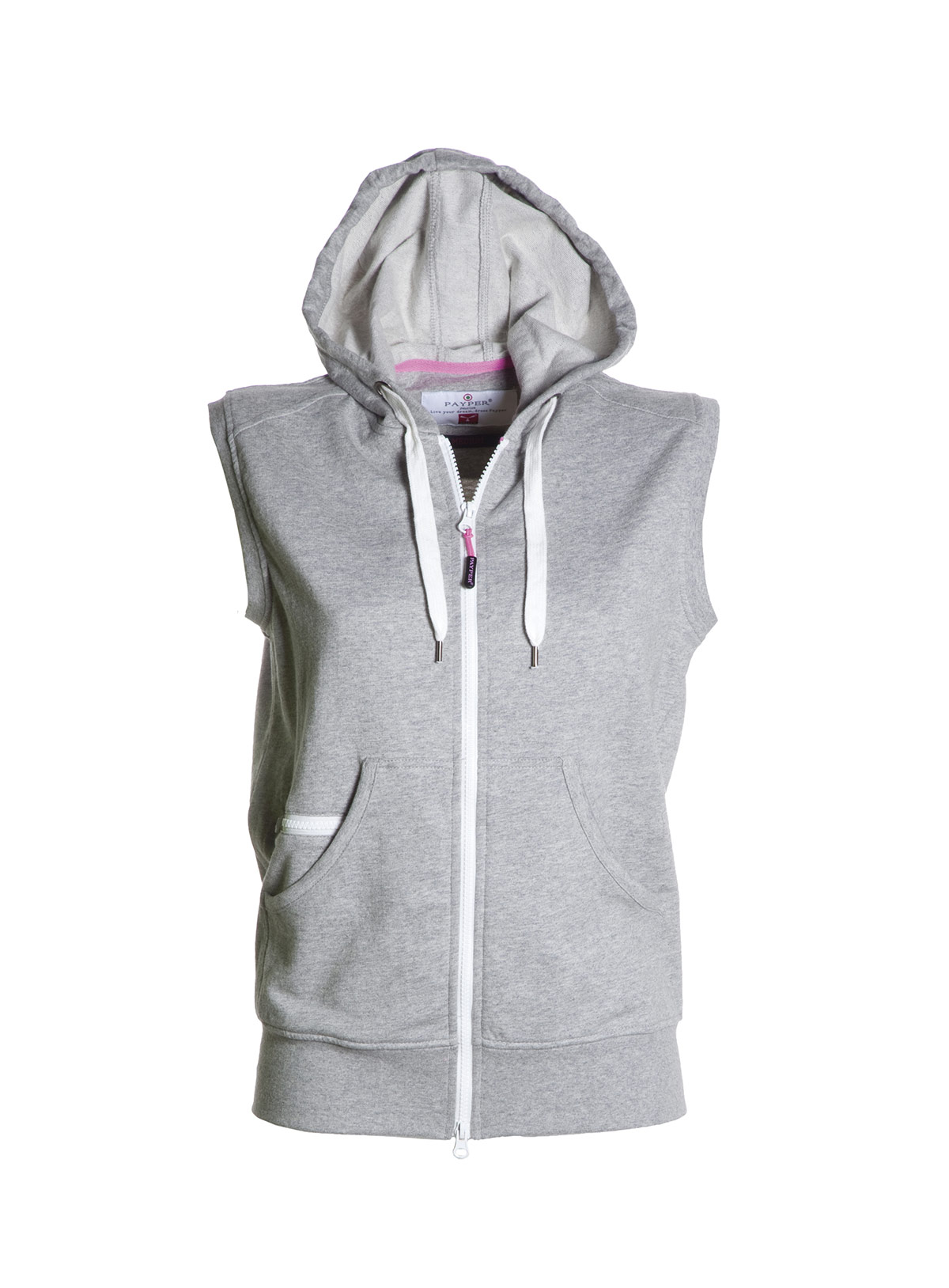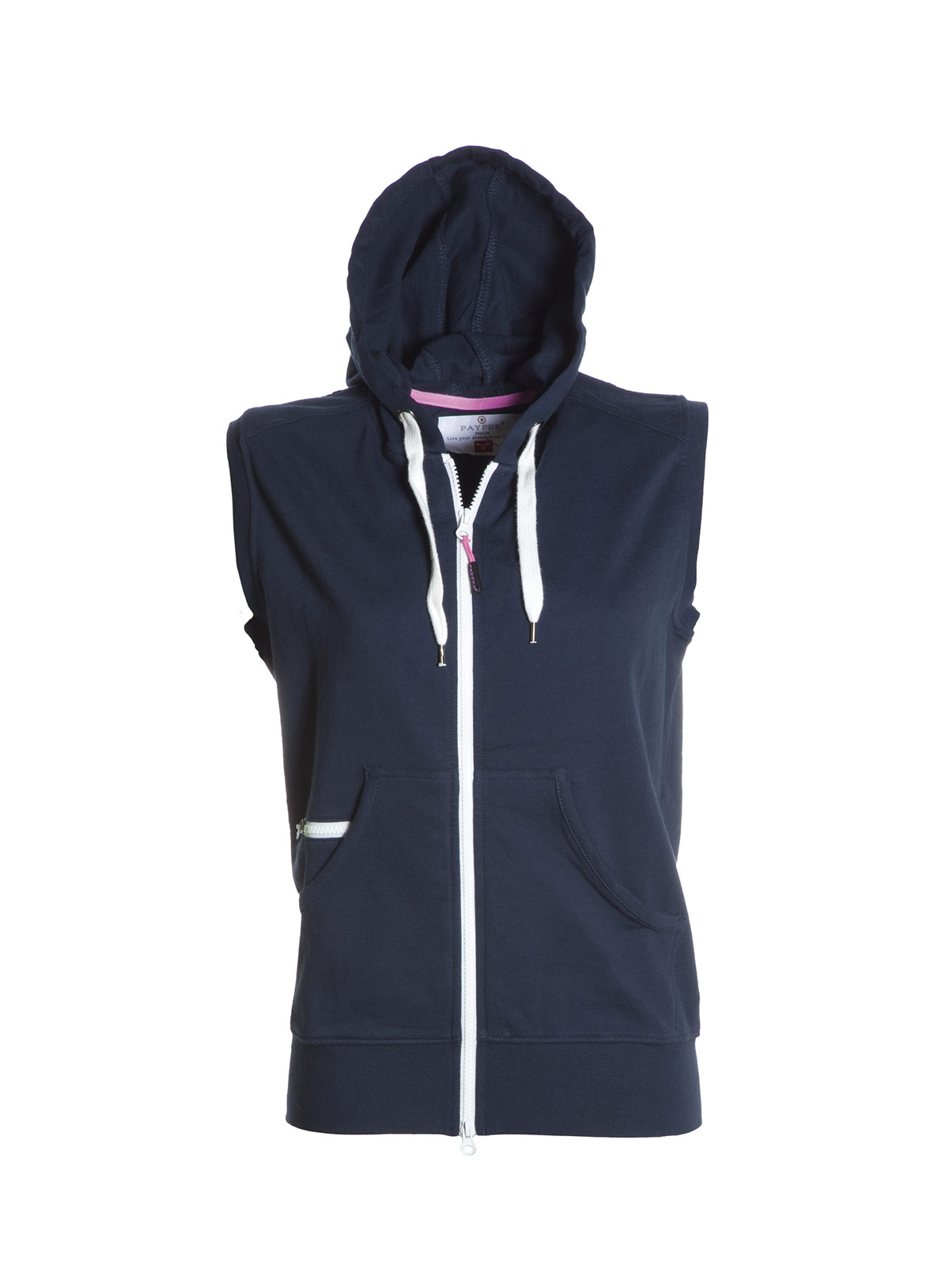 Felpa multistagione senza maniche sfiancata da donna con zip intera nascosta in plastica, con doppio cursore in metallo, con cappuccio sagomato e coulisse, tasche a marsupio e un taschino con zip.