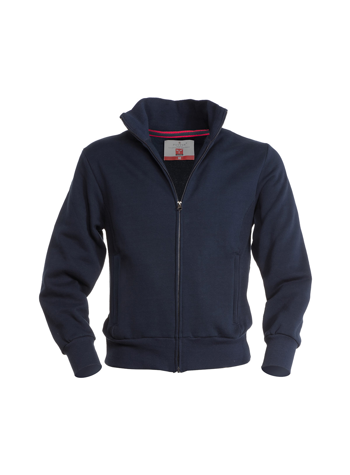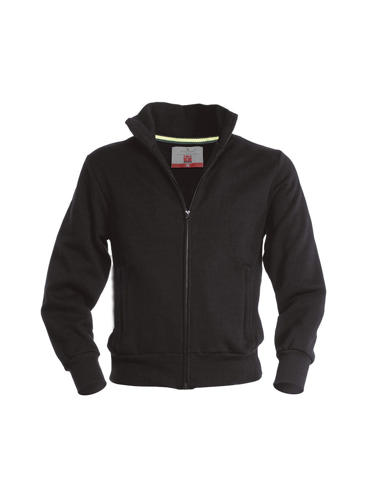 Felpa a zip intera di metallo; fascia ergonomica in rib sui fianchi, polsini, vita e colletto in rib elasticizzato e due tasche laterali con zip.