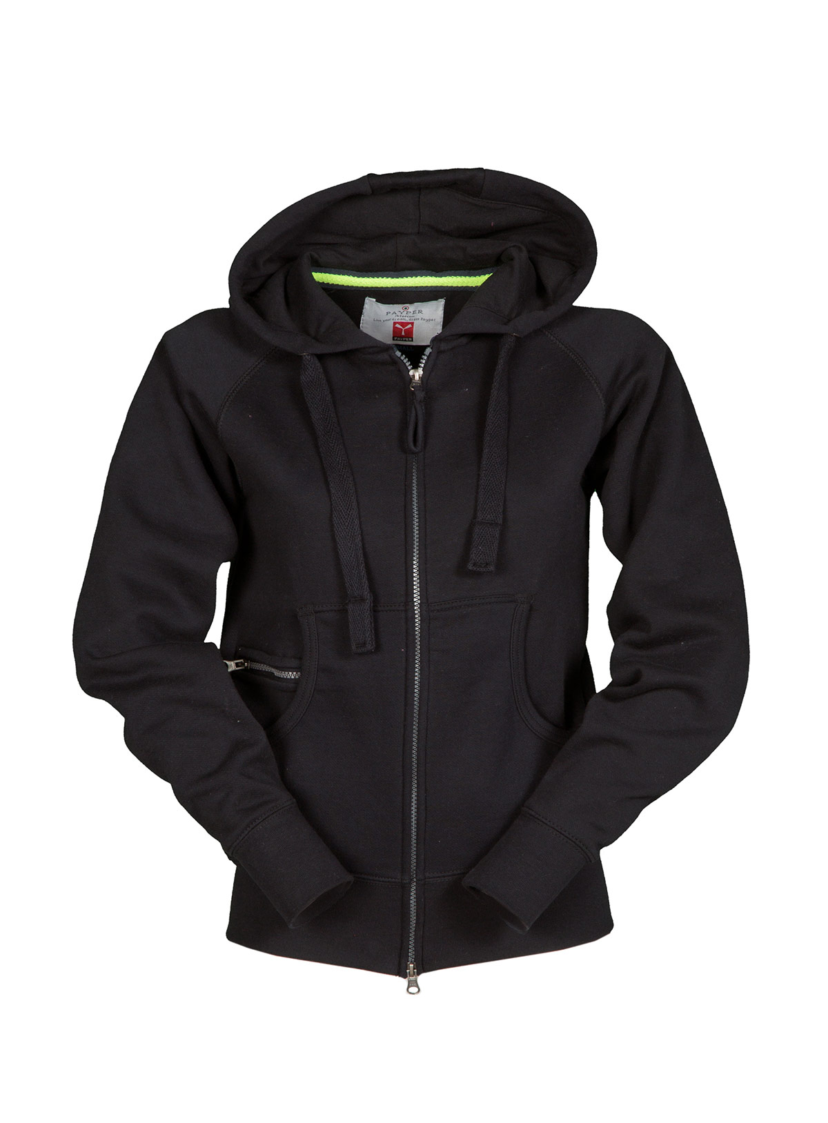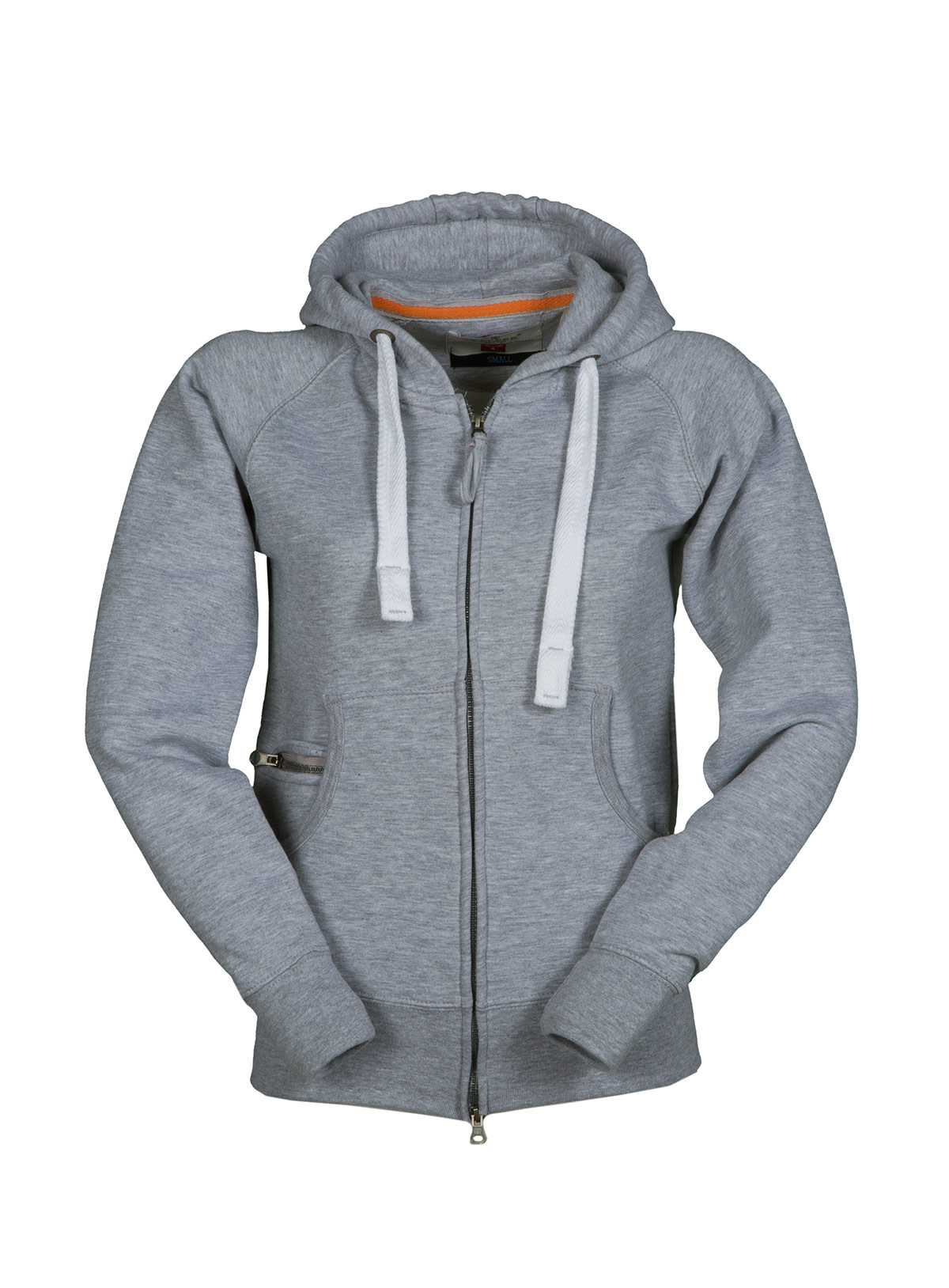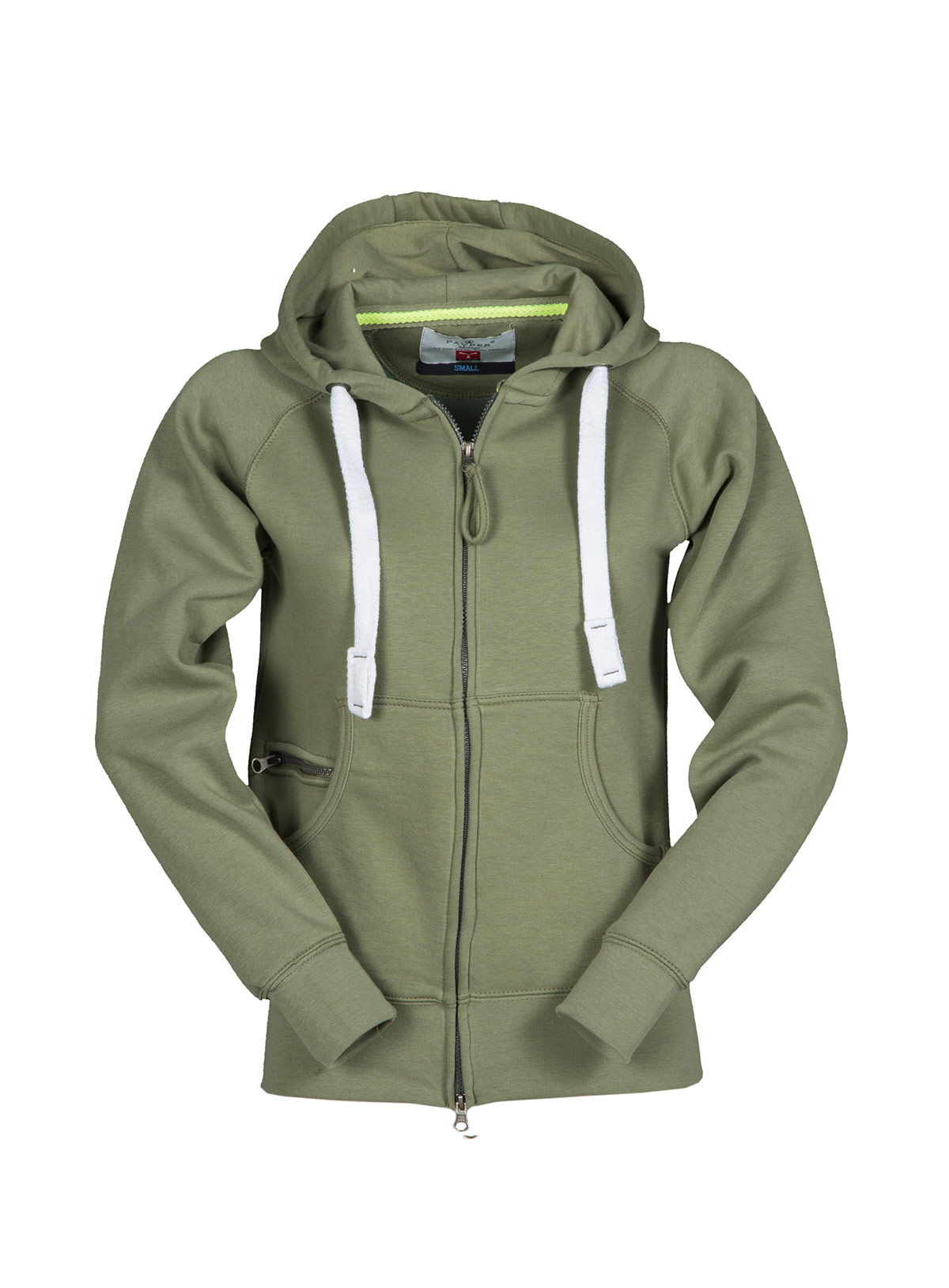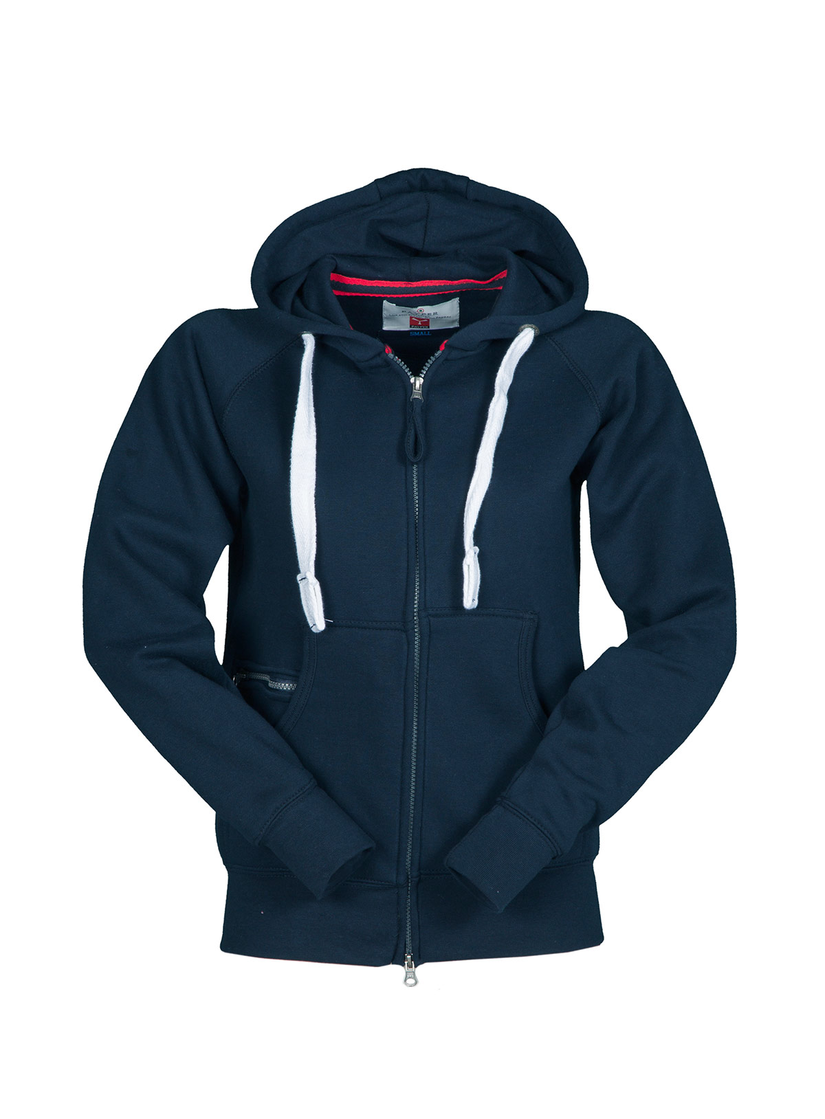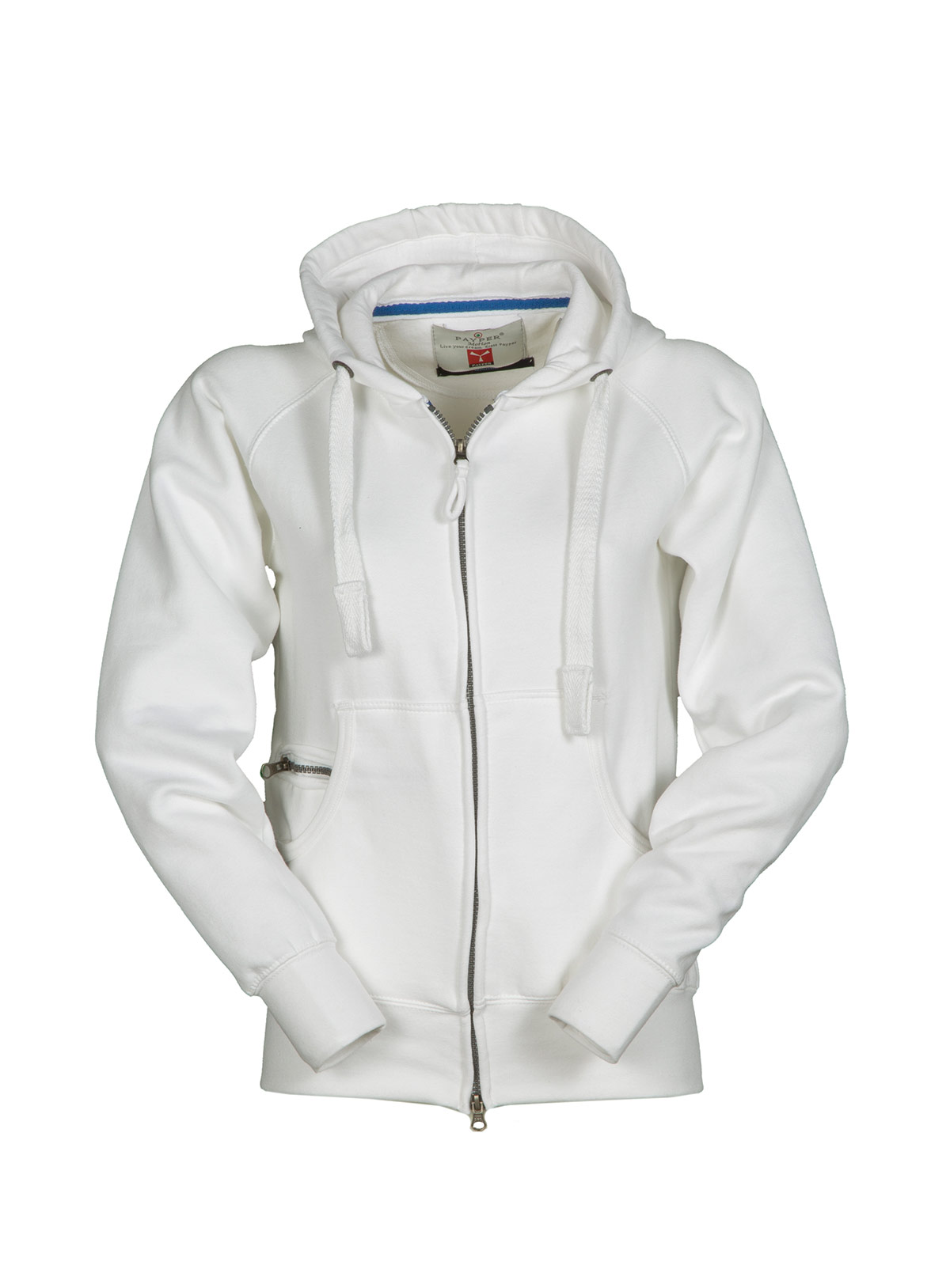 Felpa da donna con manica raglan, zip intera con doppio cursore e cappuccio in tinta, coulisse bianca con cuciture in tinta con la felpa e anelle in metallo, tasche a marsupio con taschino con secur-zip, polsini e vita in costina elasticizzata. Cuciture rinforzate.