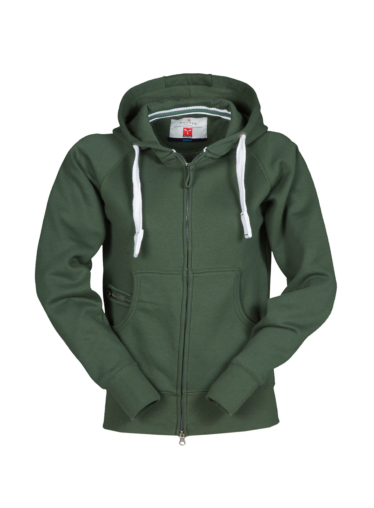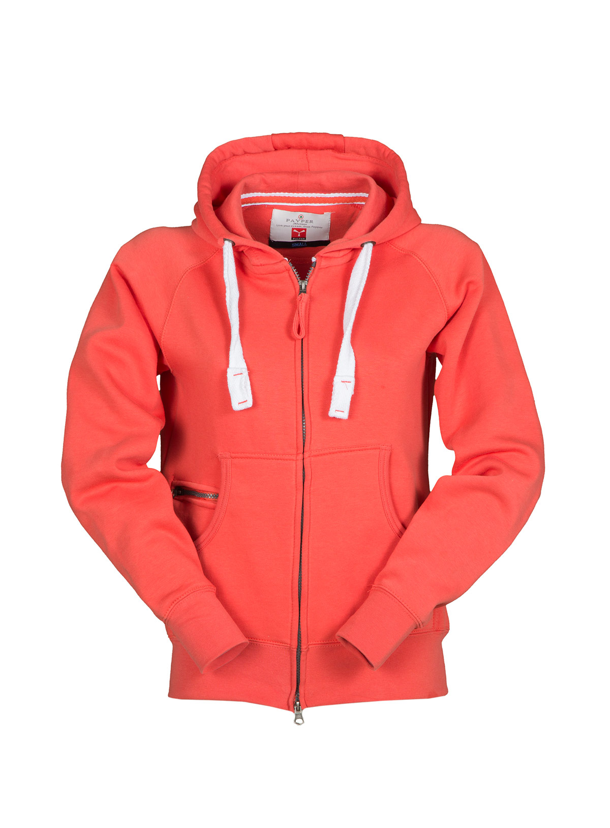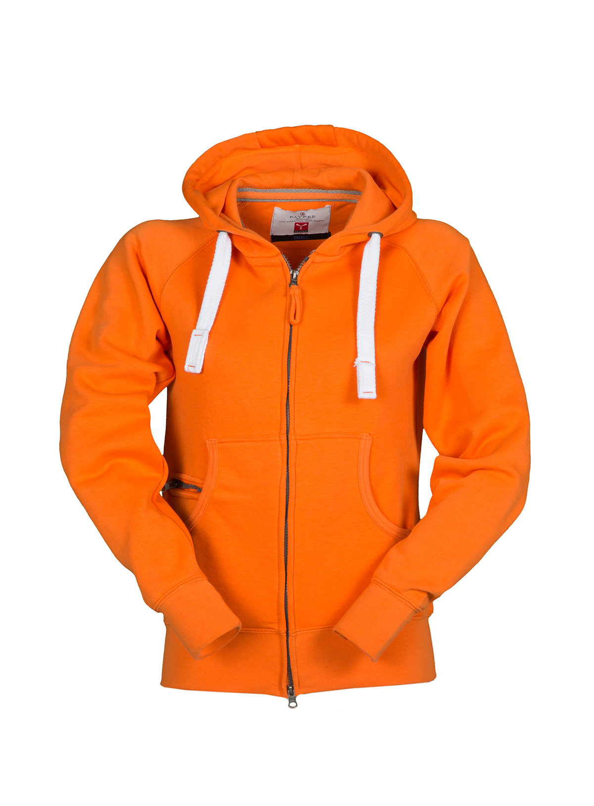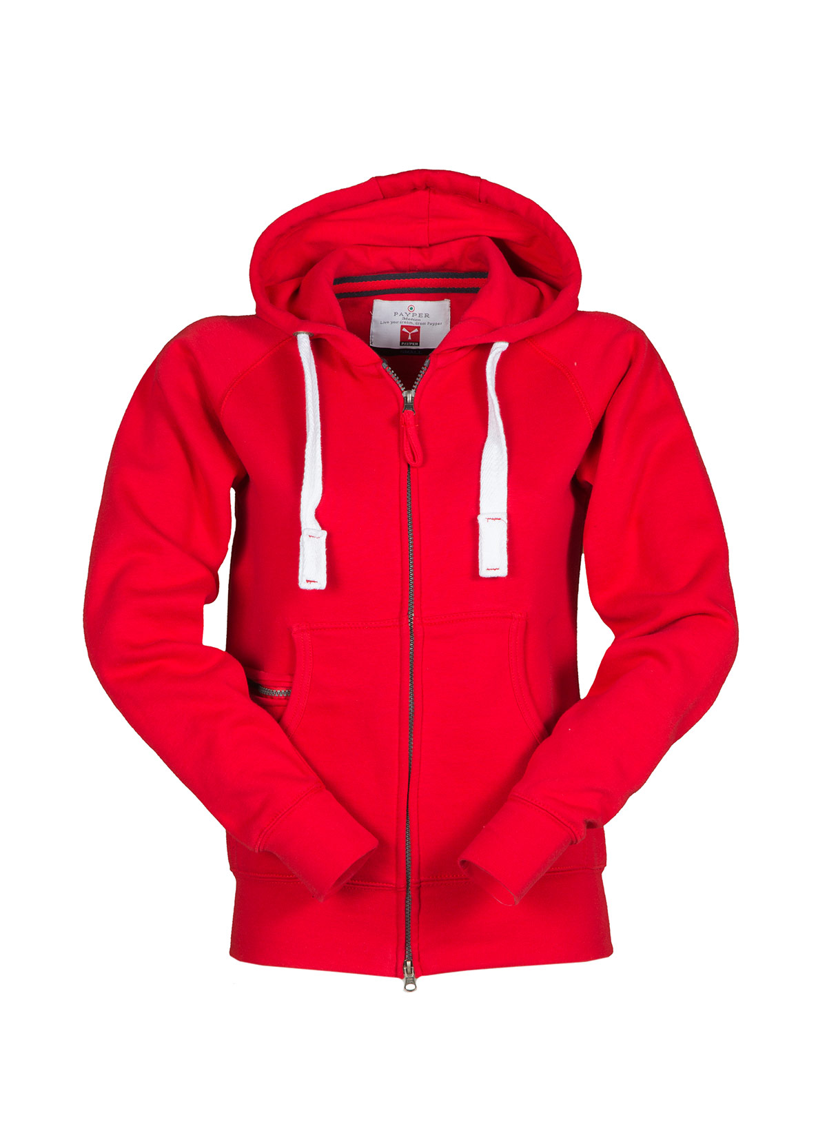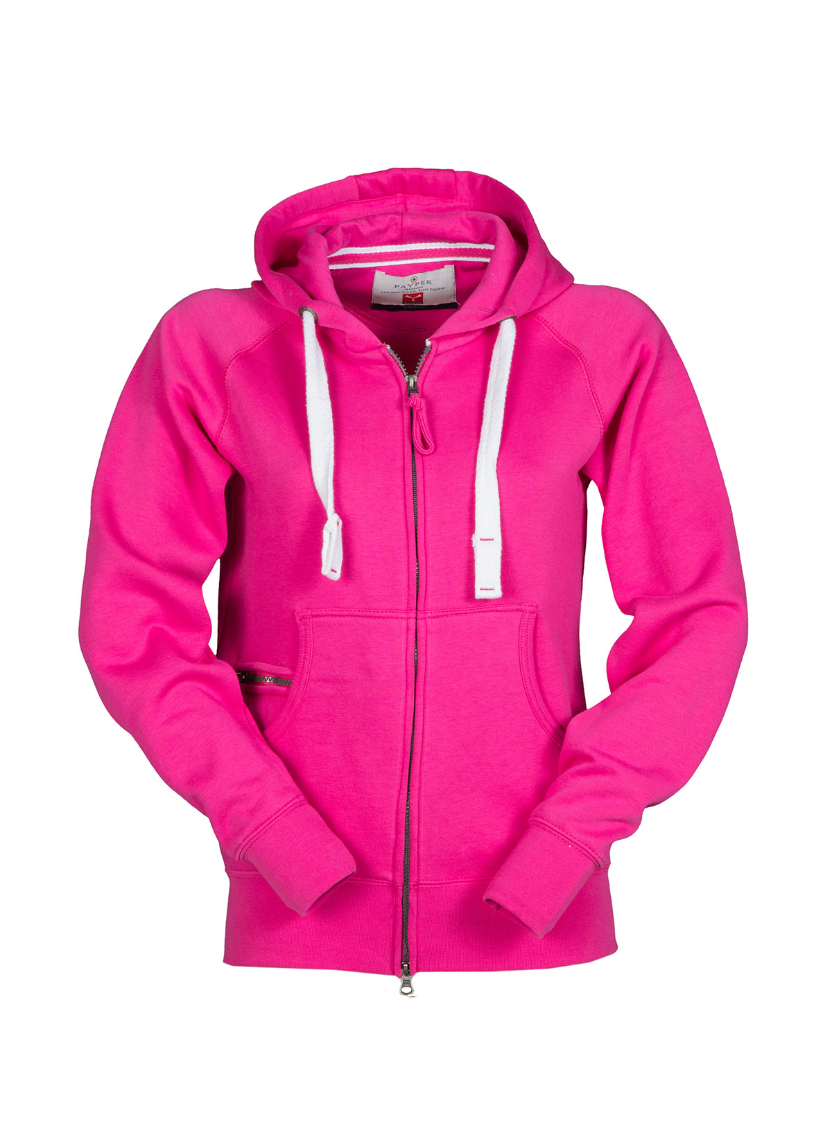 Felpa da donna con manica raglan, zip intera con doppio cursore e cappuccio in tinta, coulisse bianca con cuciture in tinta con la felpa e anelle in metallo, tasche a marsupio con taschino con secur-zip, polsini e vita in costina elasticizzata. Cuciture rinforzate.