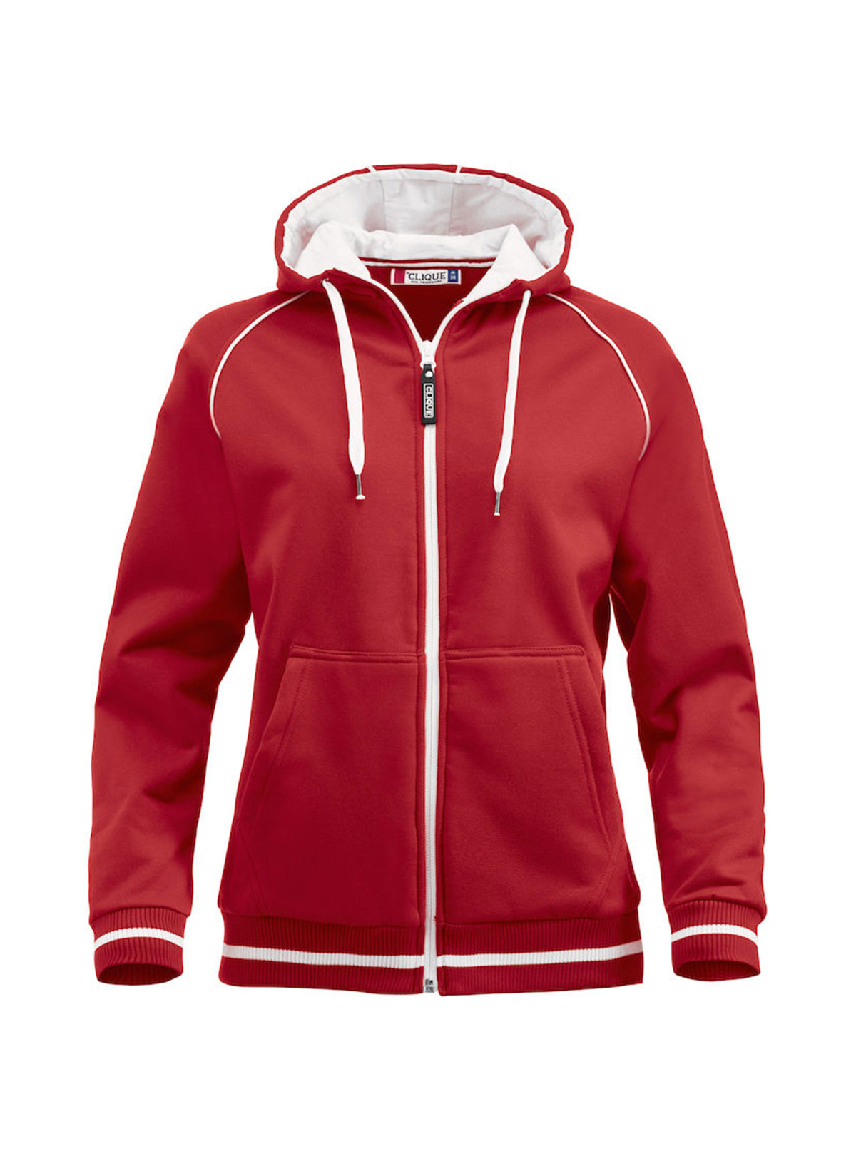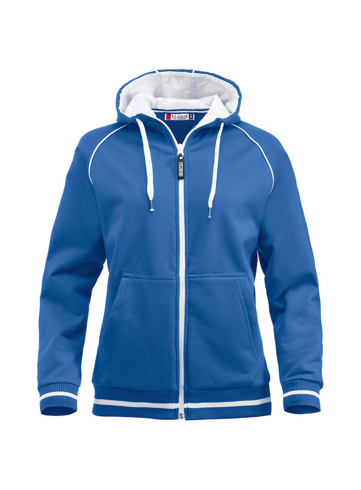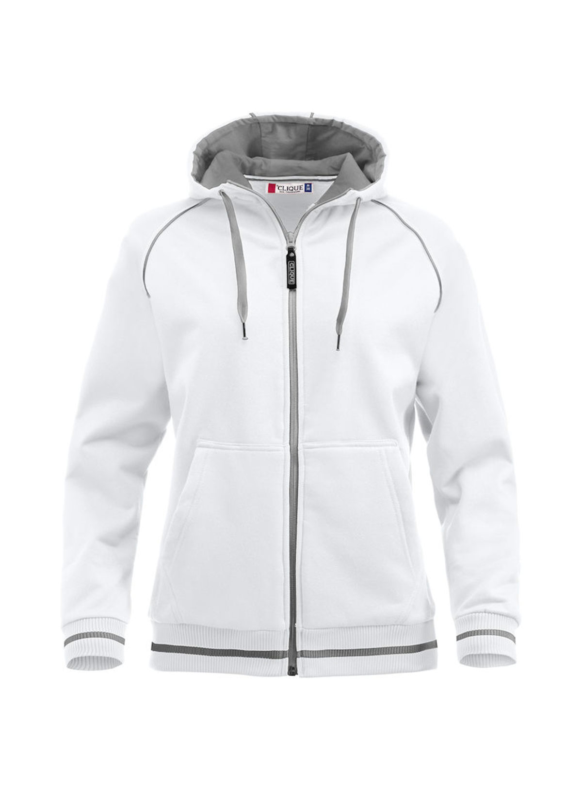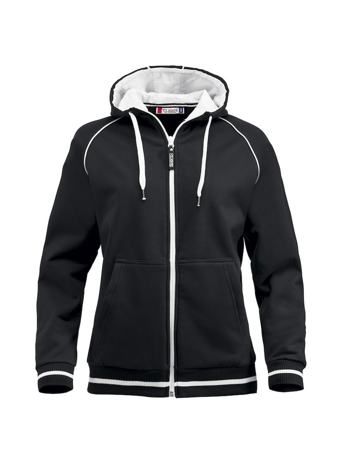 Felpa cappuccio full zip e tasconi. Cordoncino, profili e costine in contrasto.