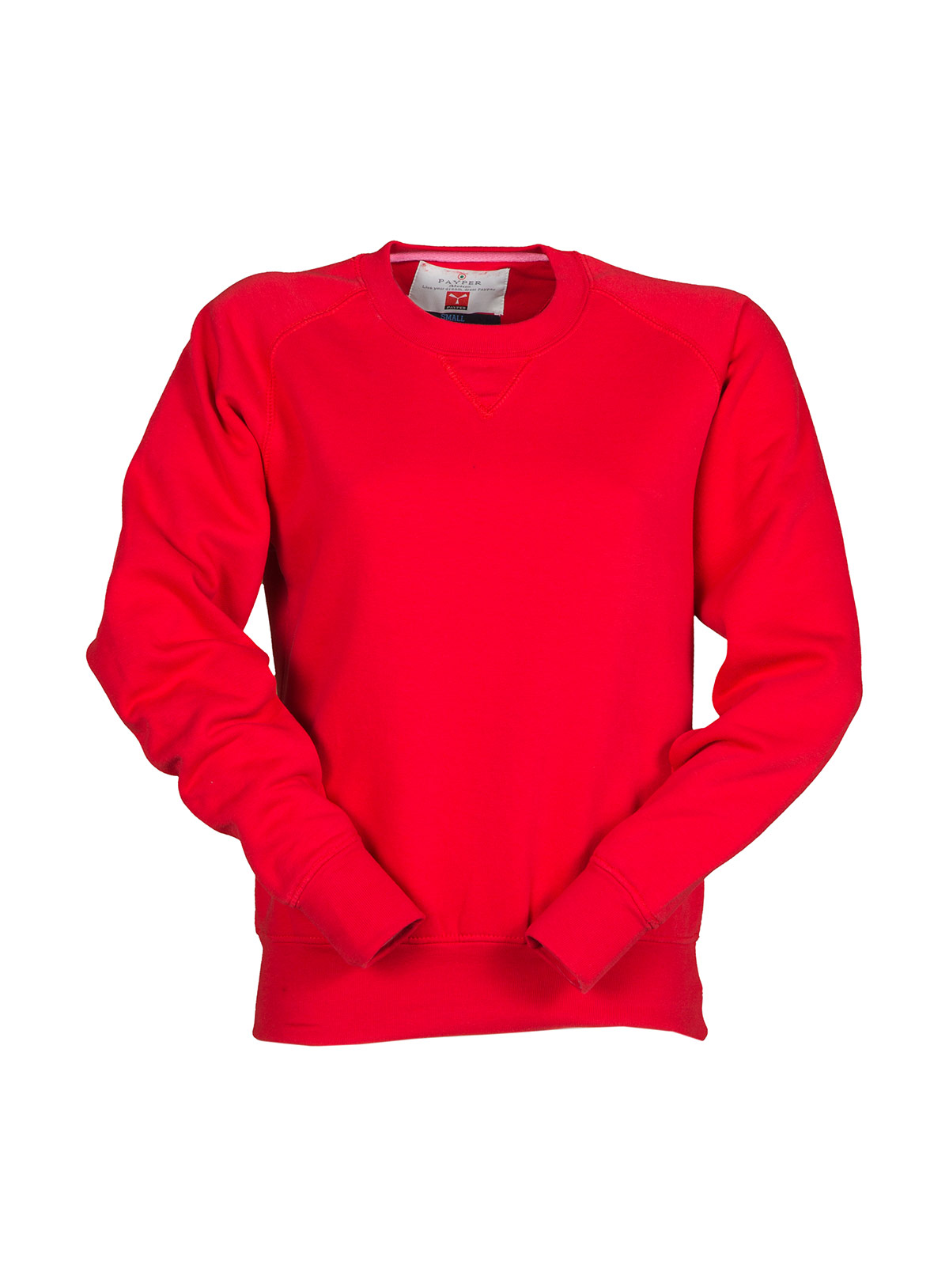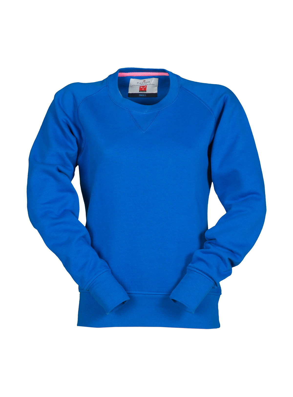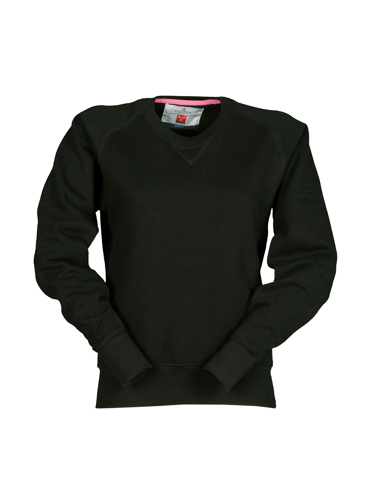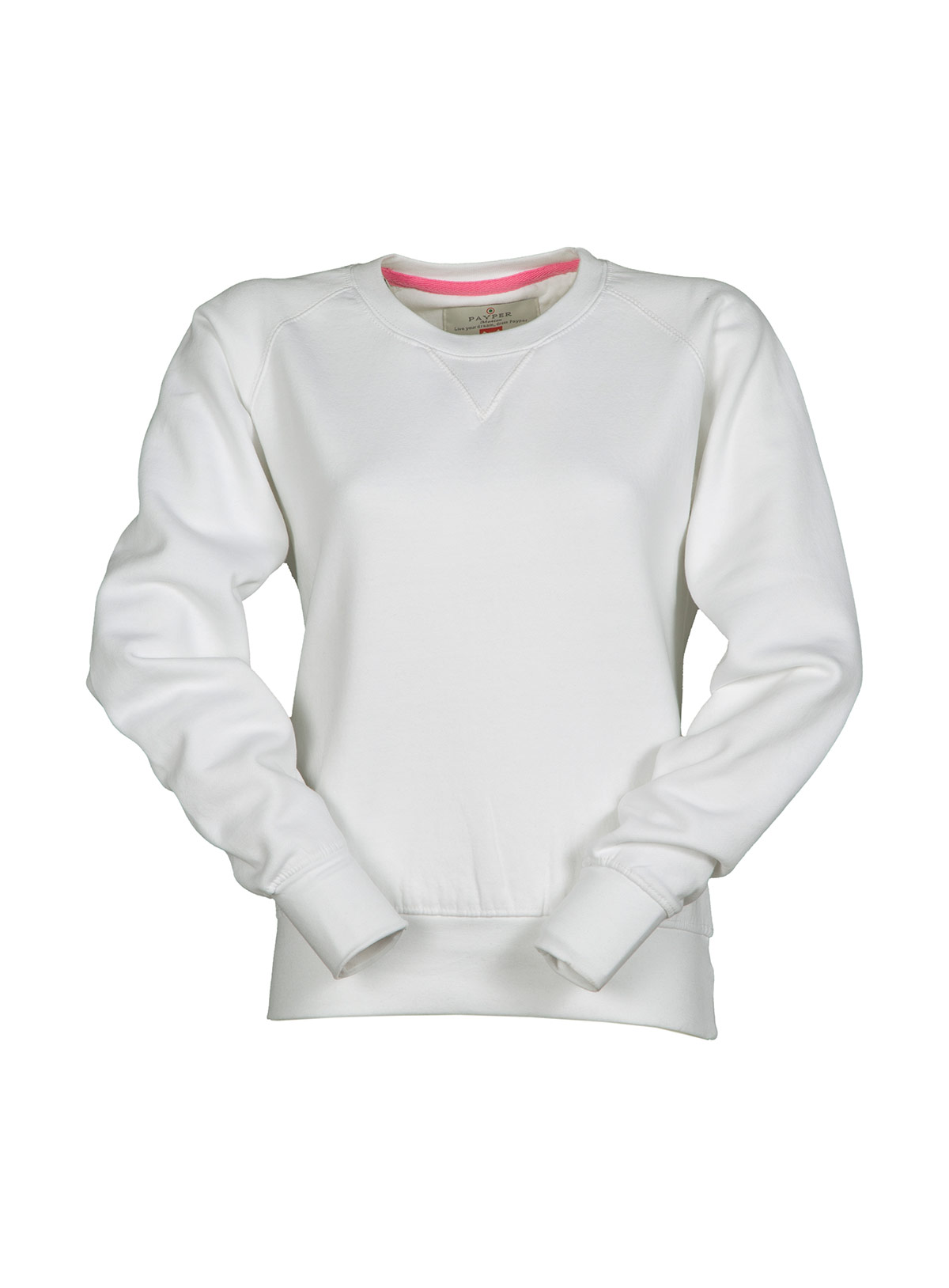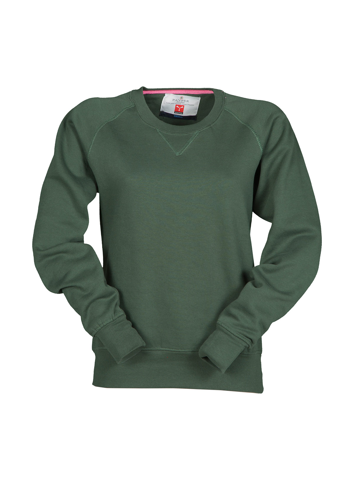 Felpa da donna a girocollo, manica raglan, cucitura estetica a V al collo; polsini e vita in costina elasticizzata, cuciture rinforzate.
