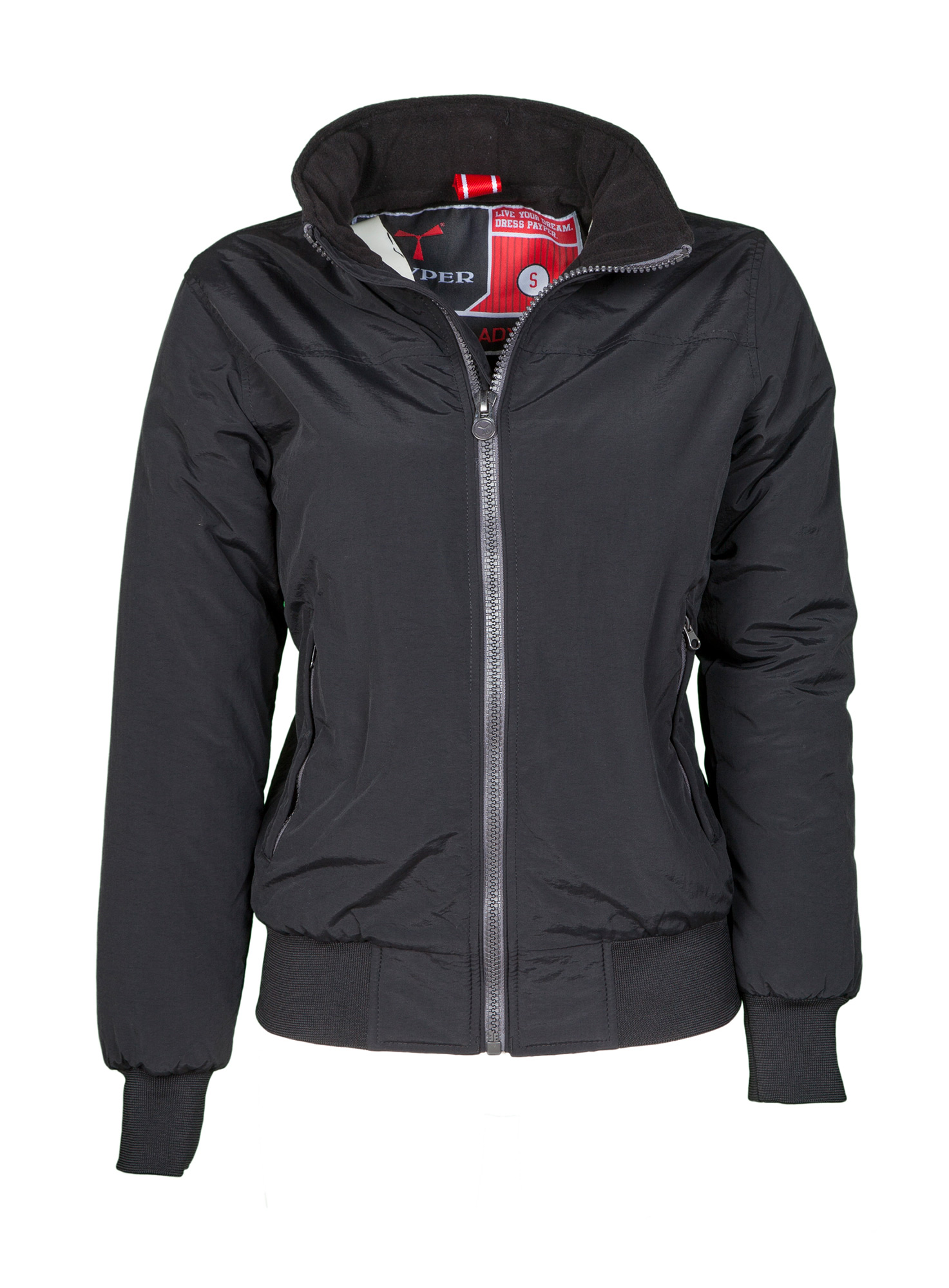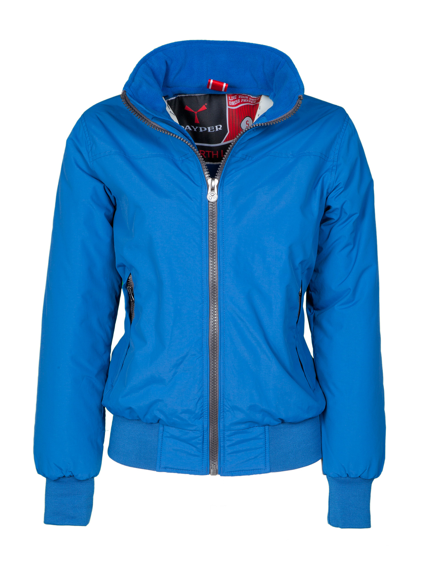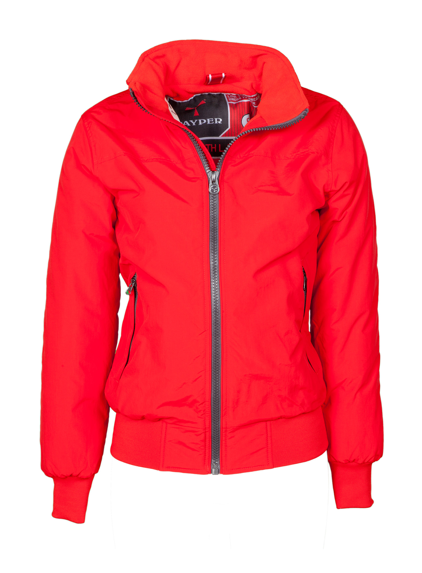 Giubbino da donna con rib elasticizzato in vita e ai polsi, due tasche esterne con zip coperta; interno imbottito e micropile nel colletto e nella schiena, 1 tasca interna porta smartphone con cerniera e passaggio per cuffie, zip al petto e sul fondo per agevolare stampe e ricami.