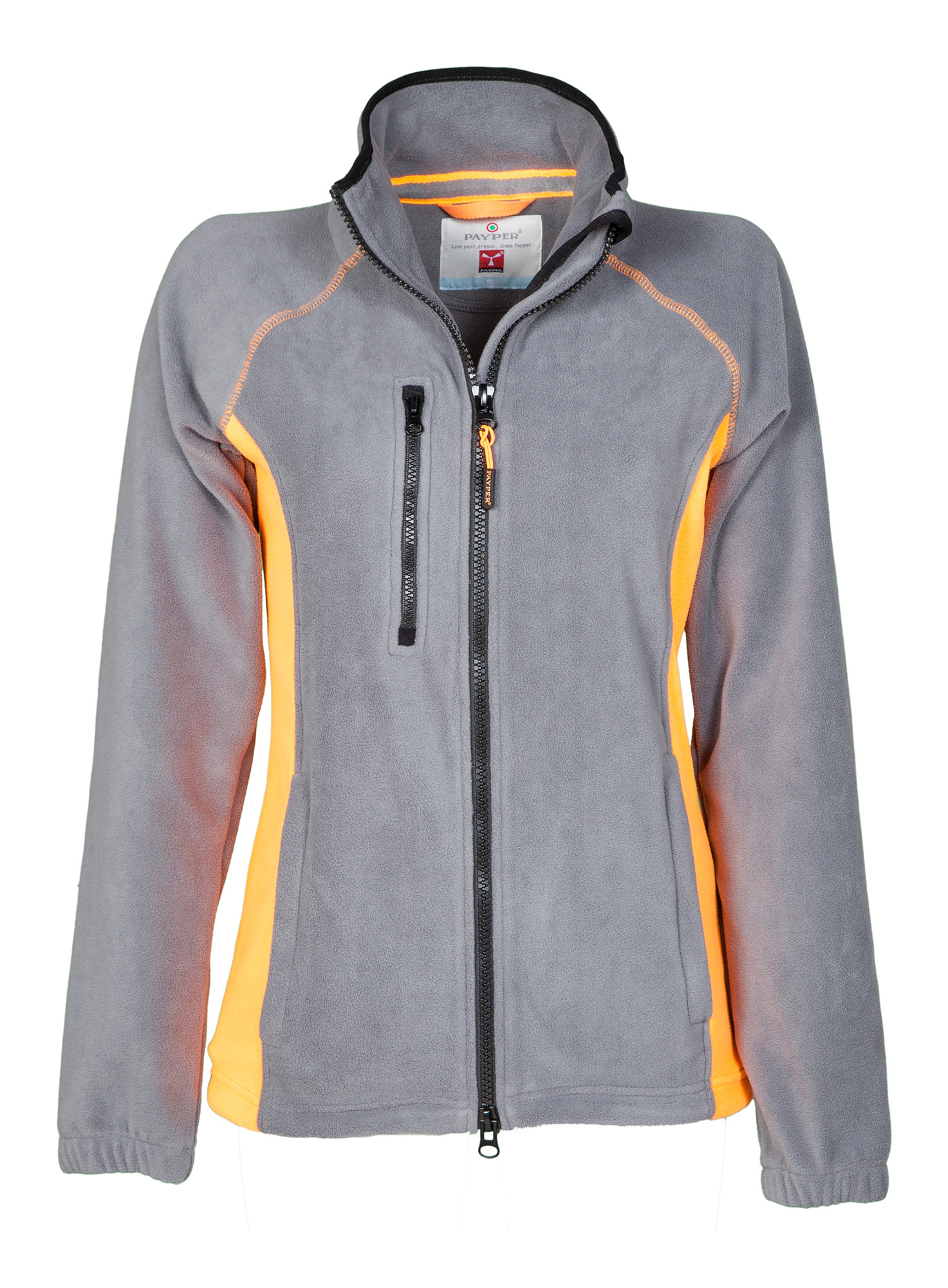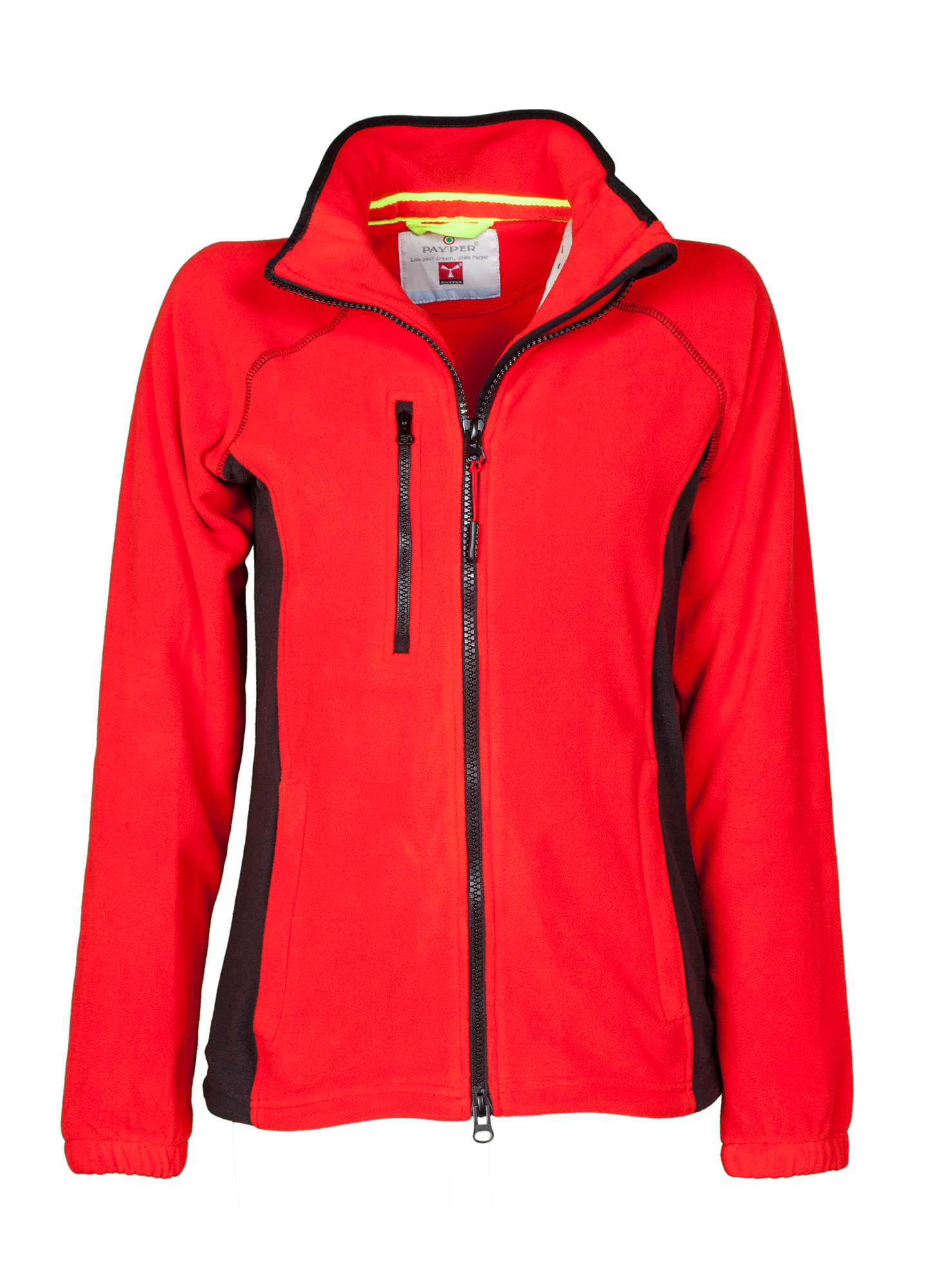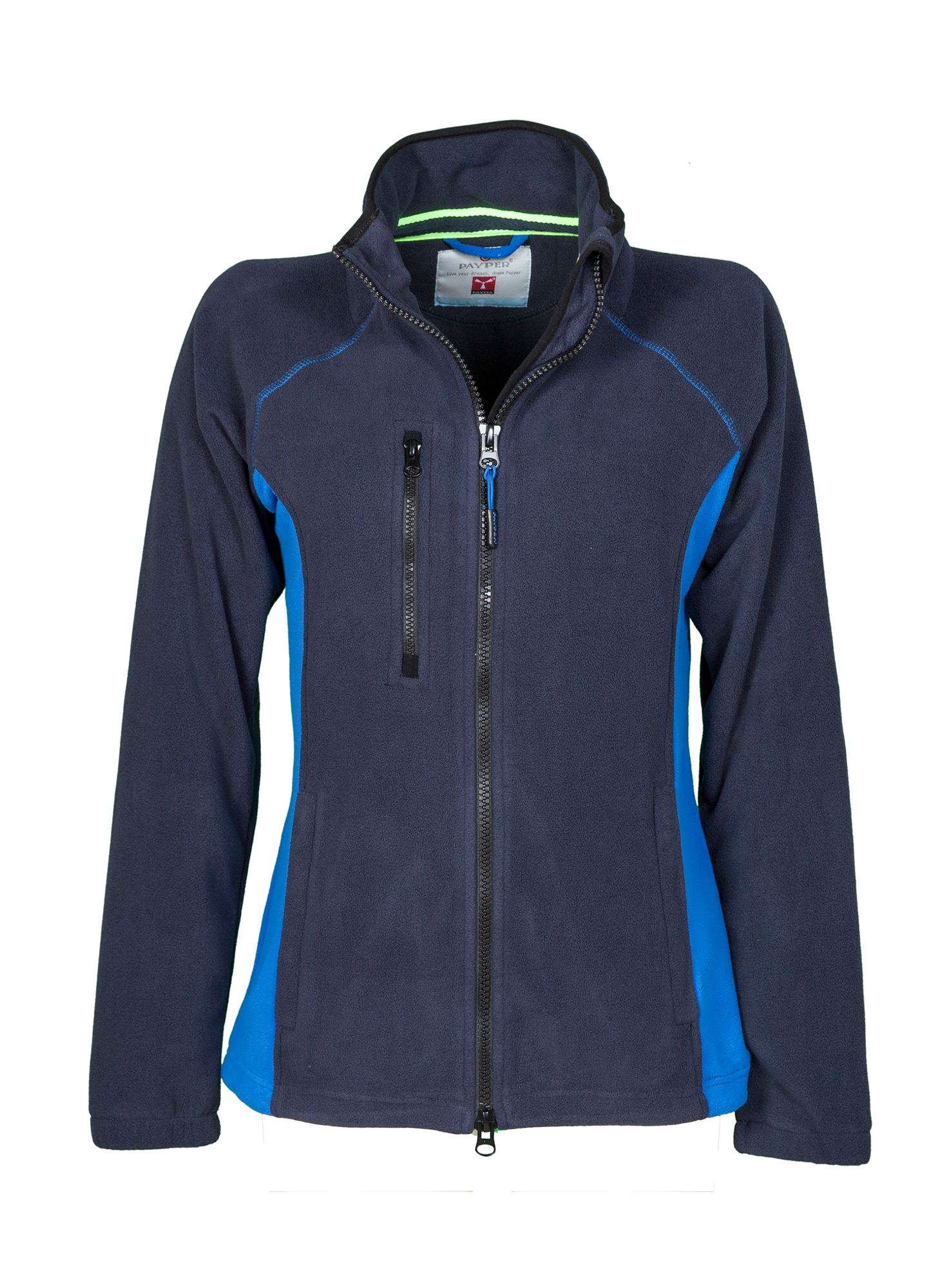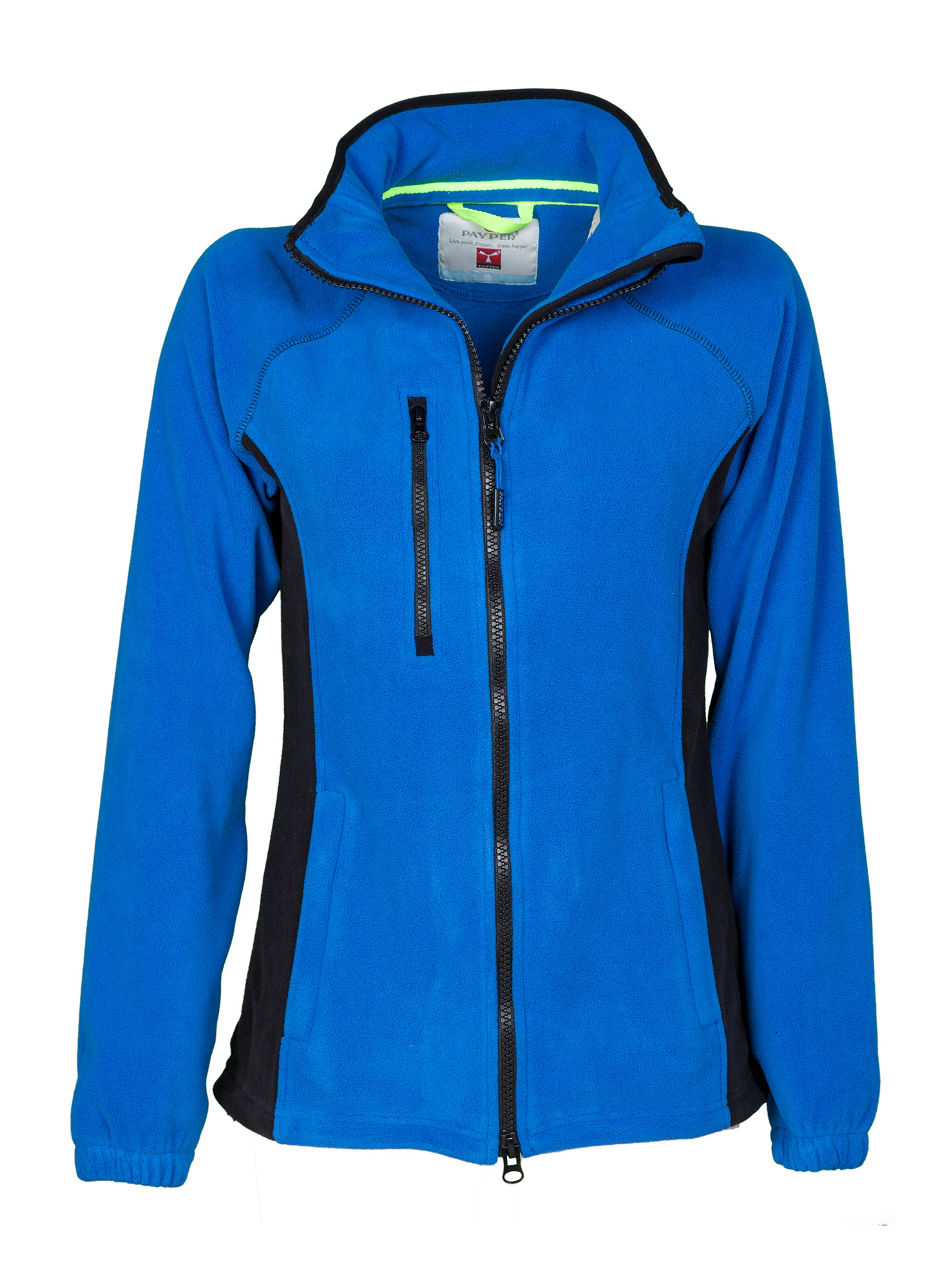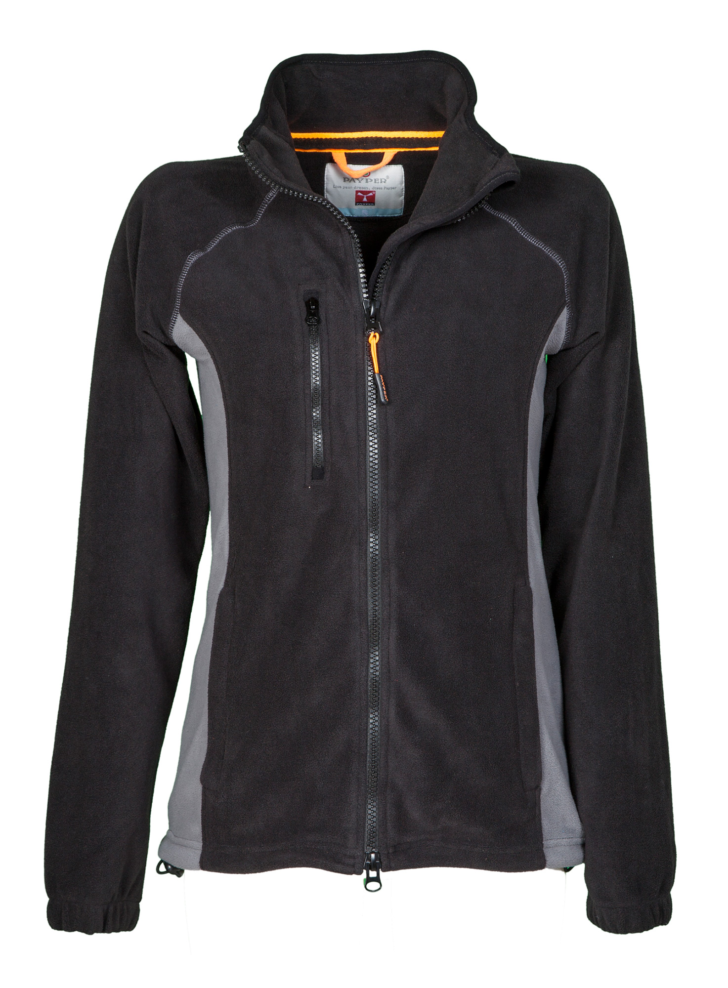 Micropile bicolore con zip intera di colore nero e manica raglan, coulisse regolabile a fondo giacca, elastici stringi polso, due tasche con zip nascosta e una tasca al petto con zip. Collo con bordatura in contrasto, cuciture rinforzate.