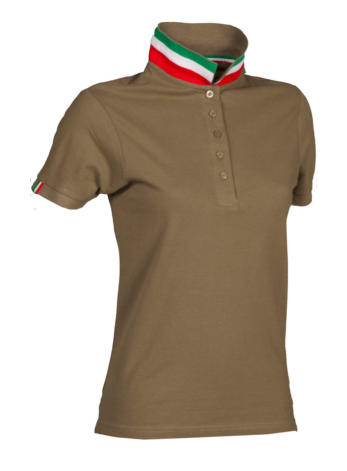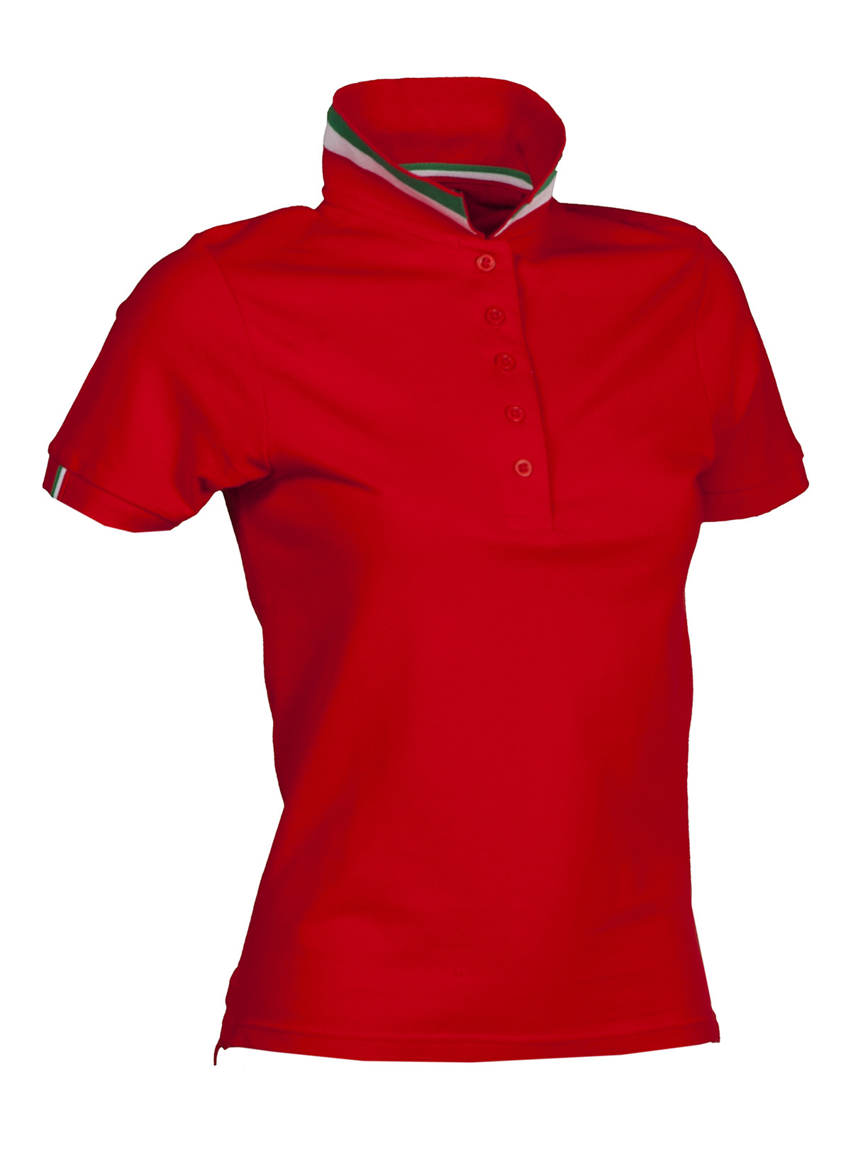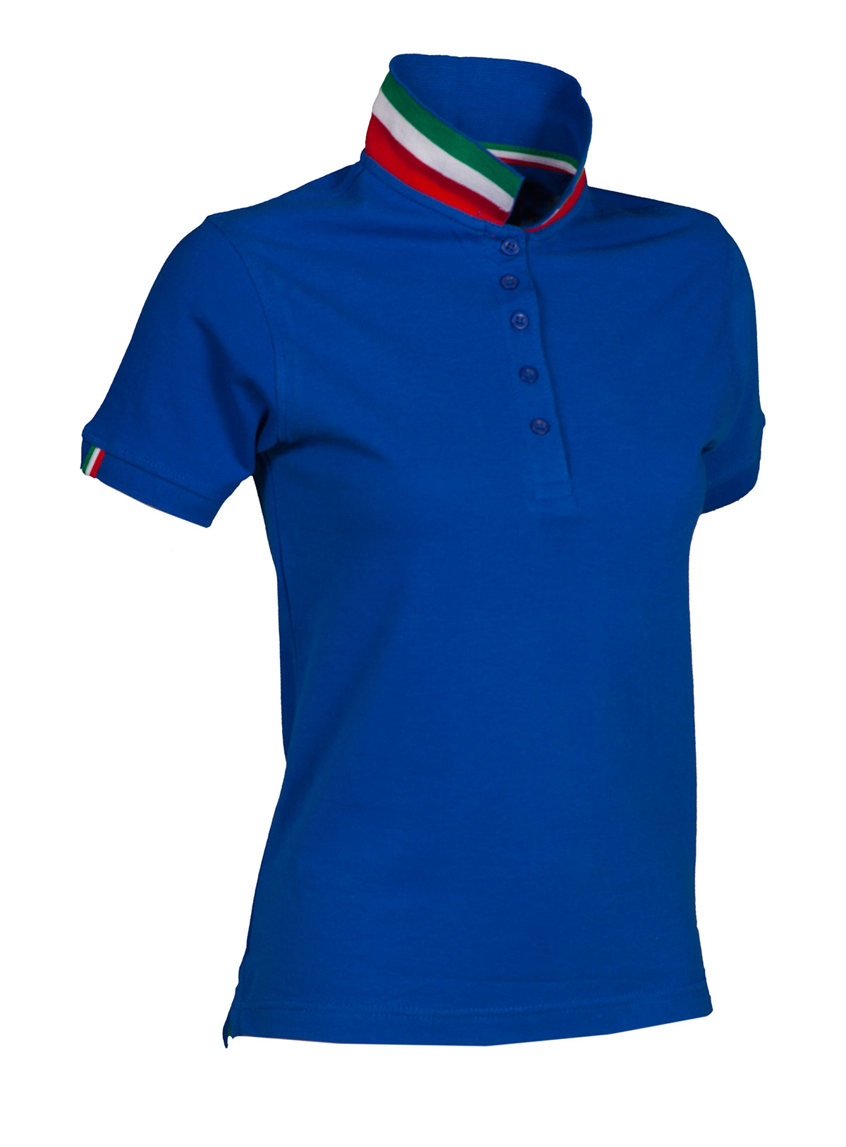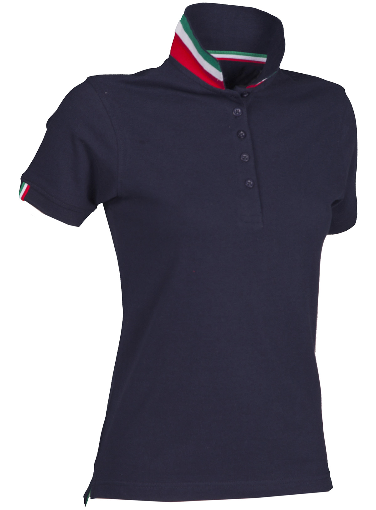 Polo sfiancata donna a manica corta a cinque bottoni in tinta ad effetto perlato, colletto da un lato in tinta, dall’altro lato a contrasto con colori bandiera visibile solo se alzato, bordo manica dx con fine inserto colori bandiera in contrasto, bordo manica a costine, spacchetti laterali colori bandiera, cuciture del collo coperte con nastro in jersey colori bandiera, nastro di rinforzo laterale.