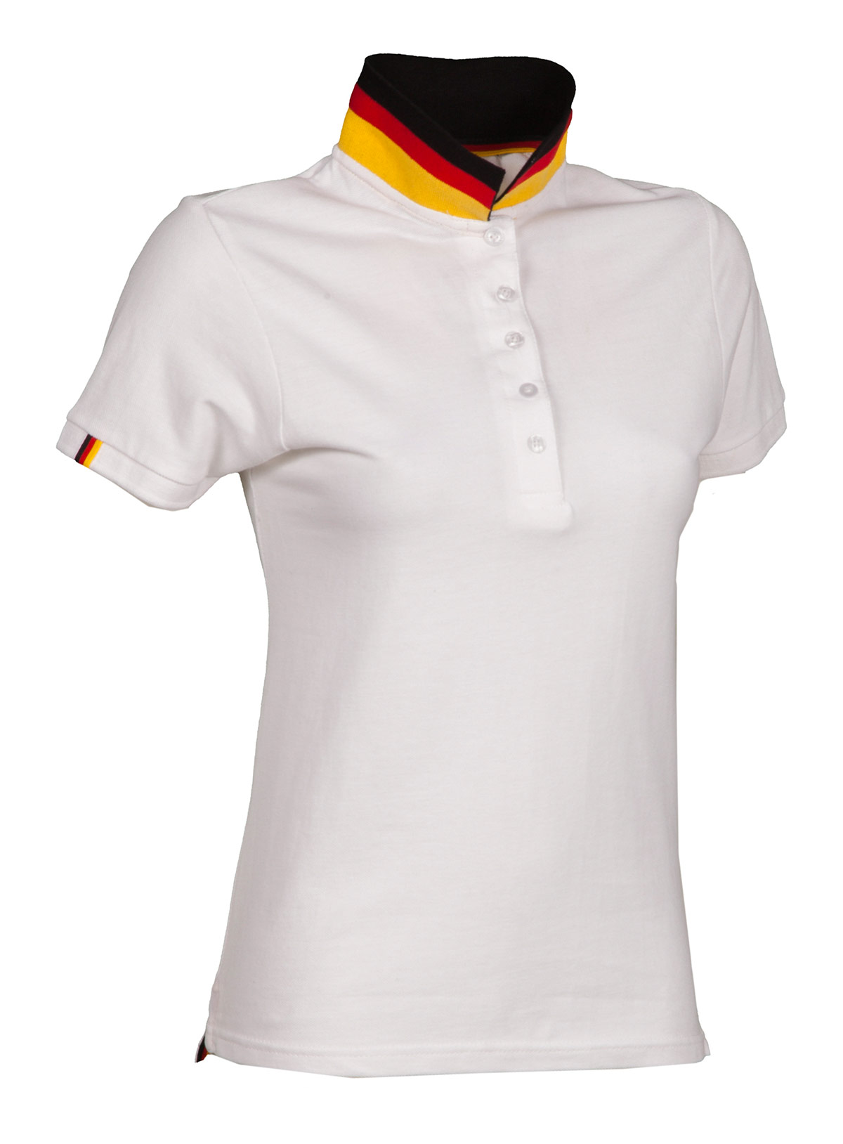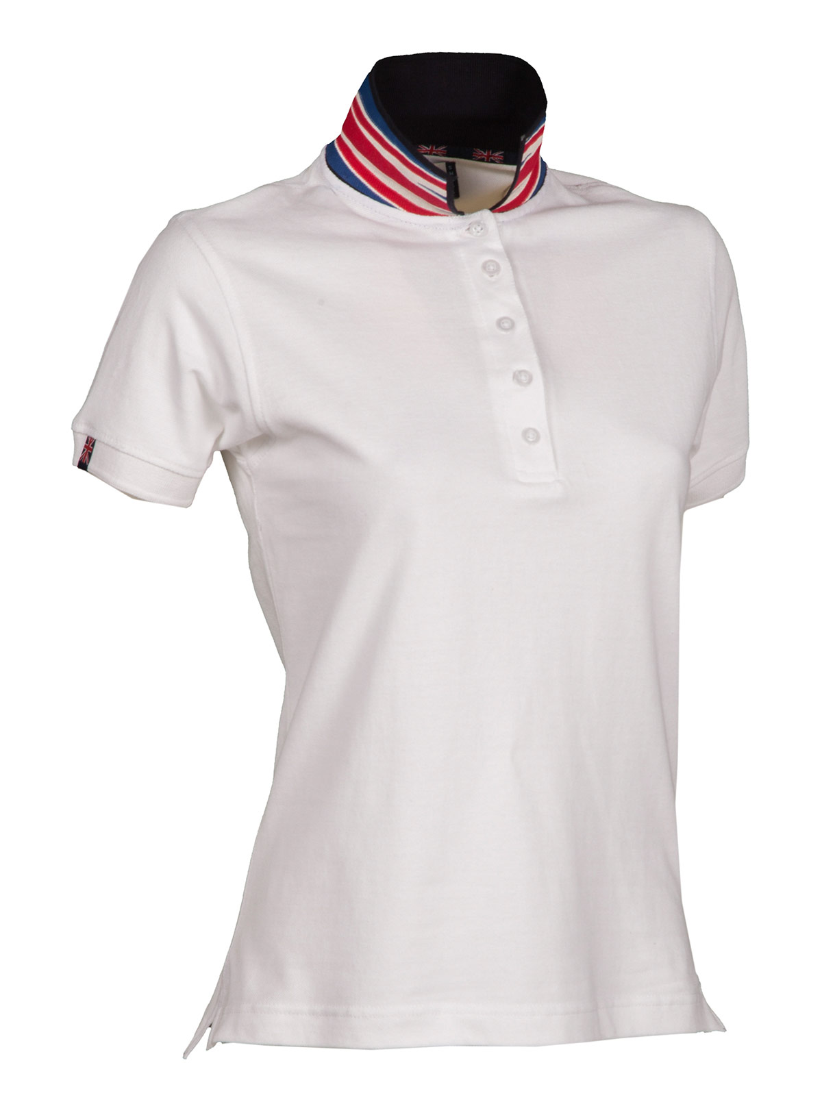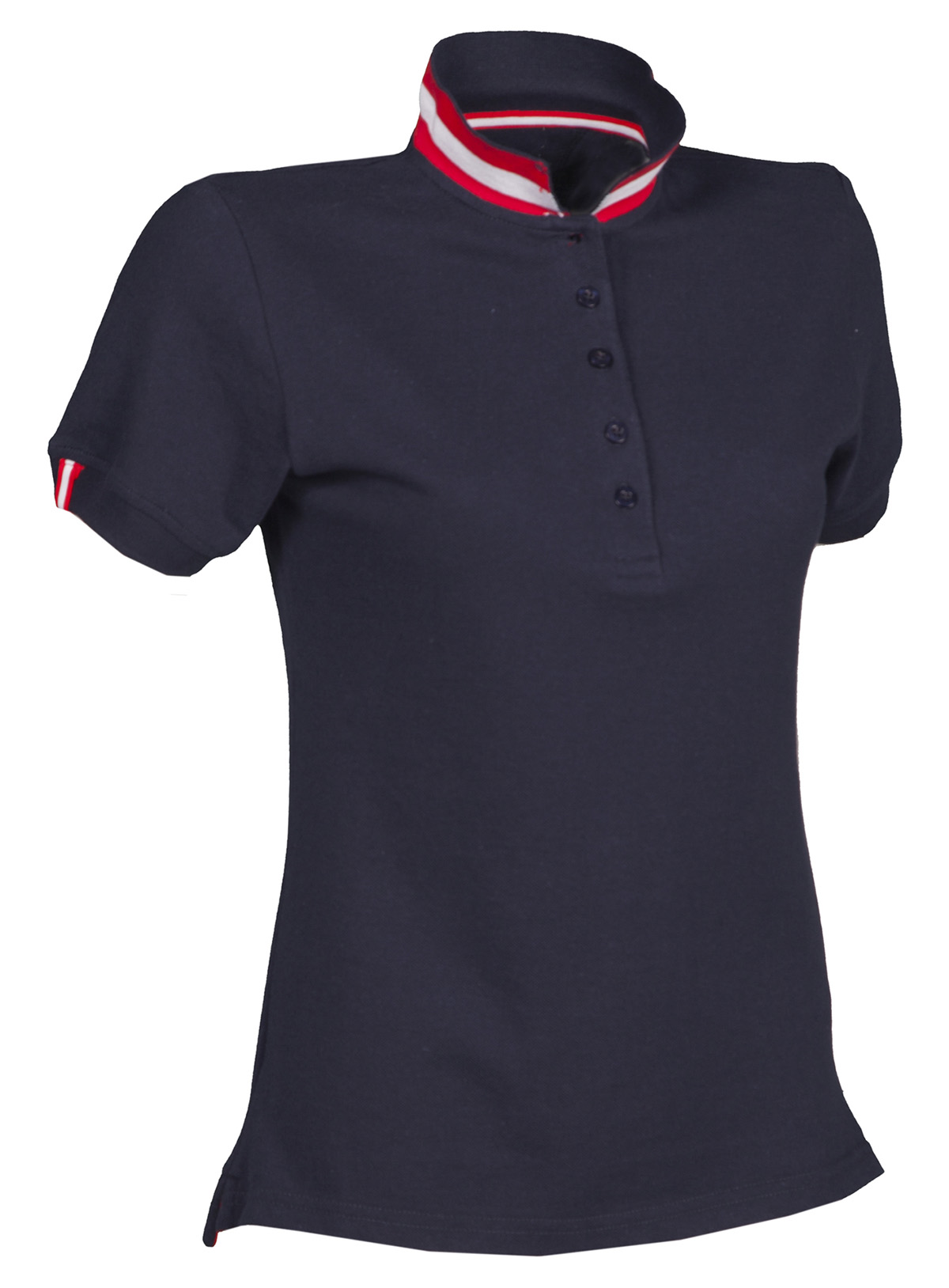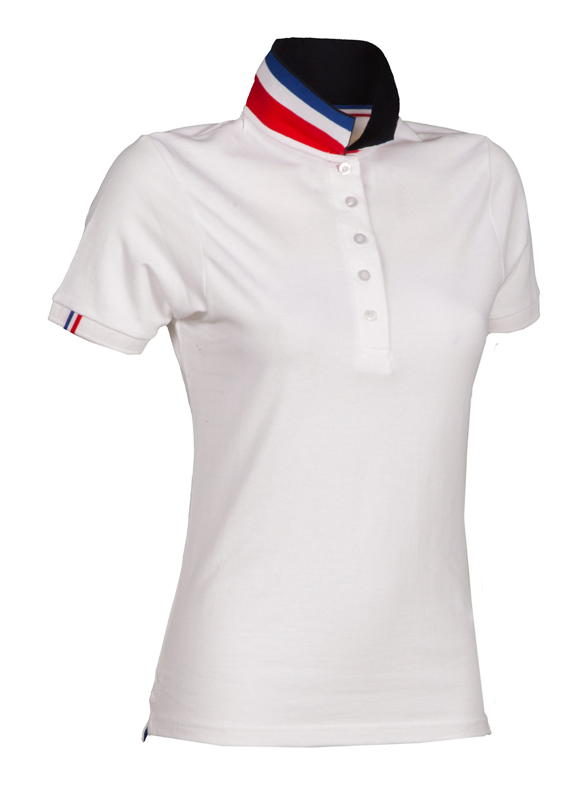 Polo sfiancata donna a manica corta a cinque bottoni in tinta ad effetto perlato, colletto da un lato in tinta, dall’altro lato a contrasto con colori bandiera visibile solo se alzato, bordo manica dx con fine inserto colori bandiera in contrasto, bordo manica a costine, spacchetti laterali colori bandiera, cuciture del collo coperte con nastro in jersey colori bandiera, nastro di rinforzo laterale.