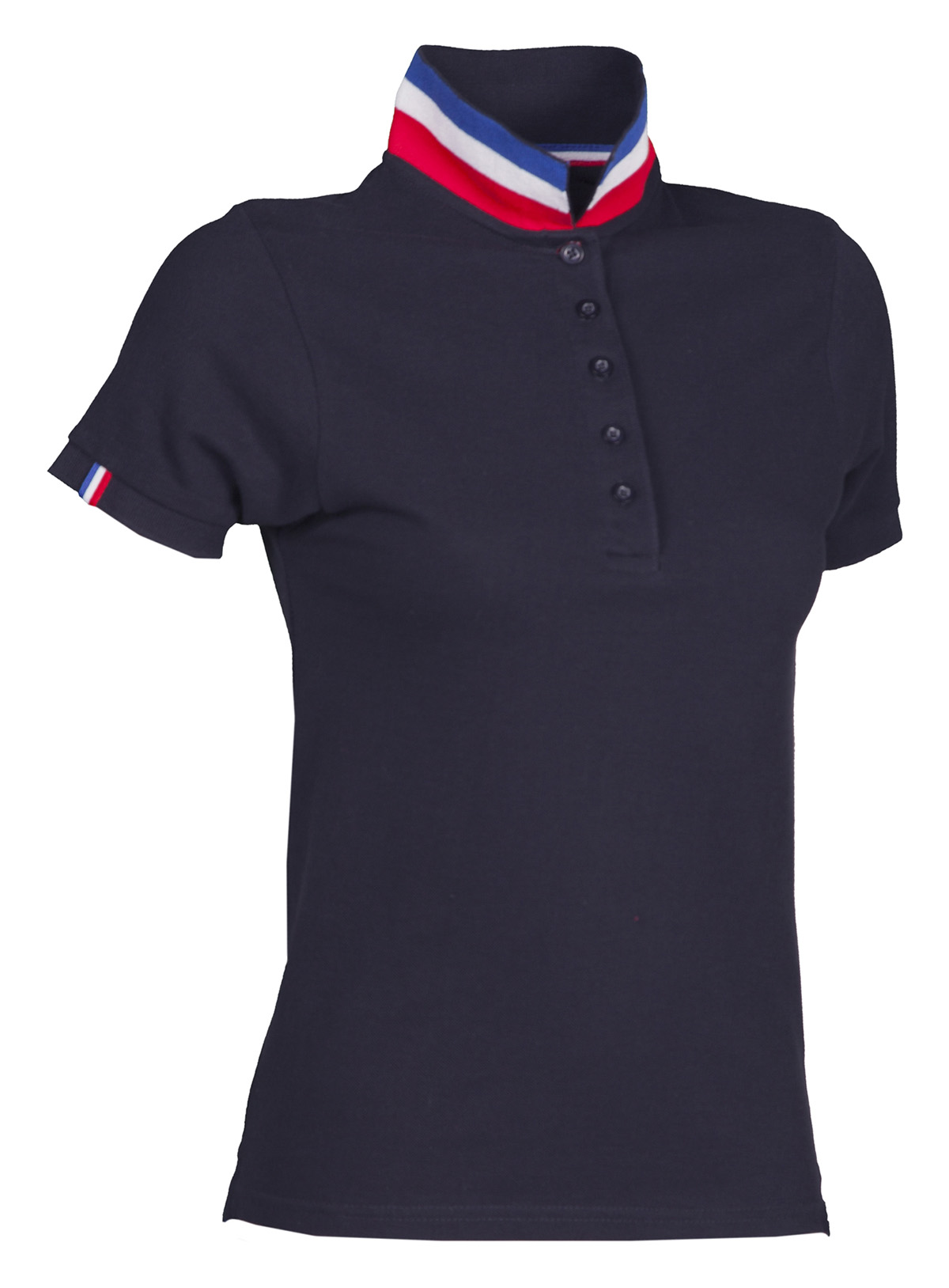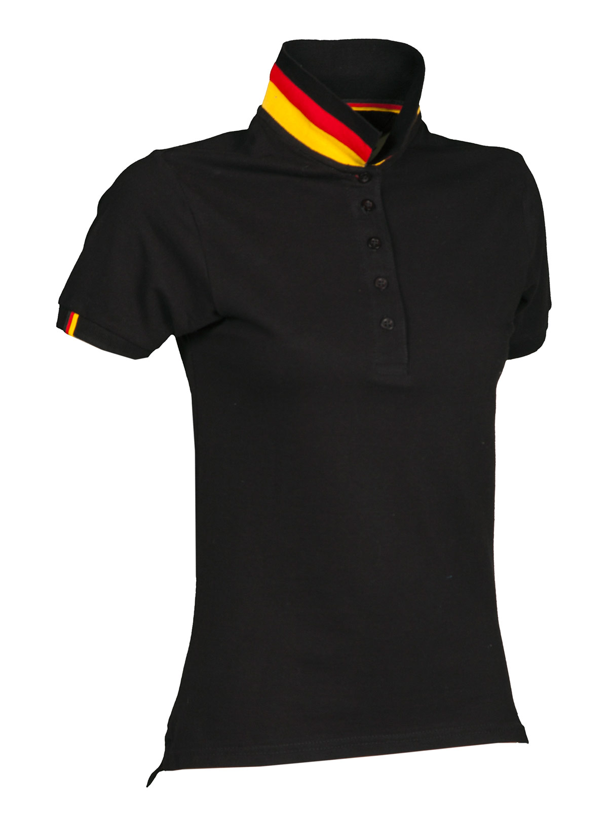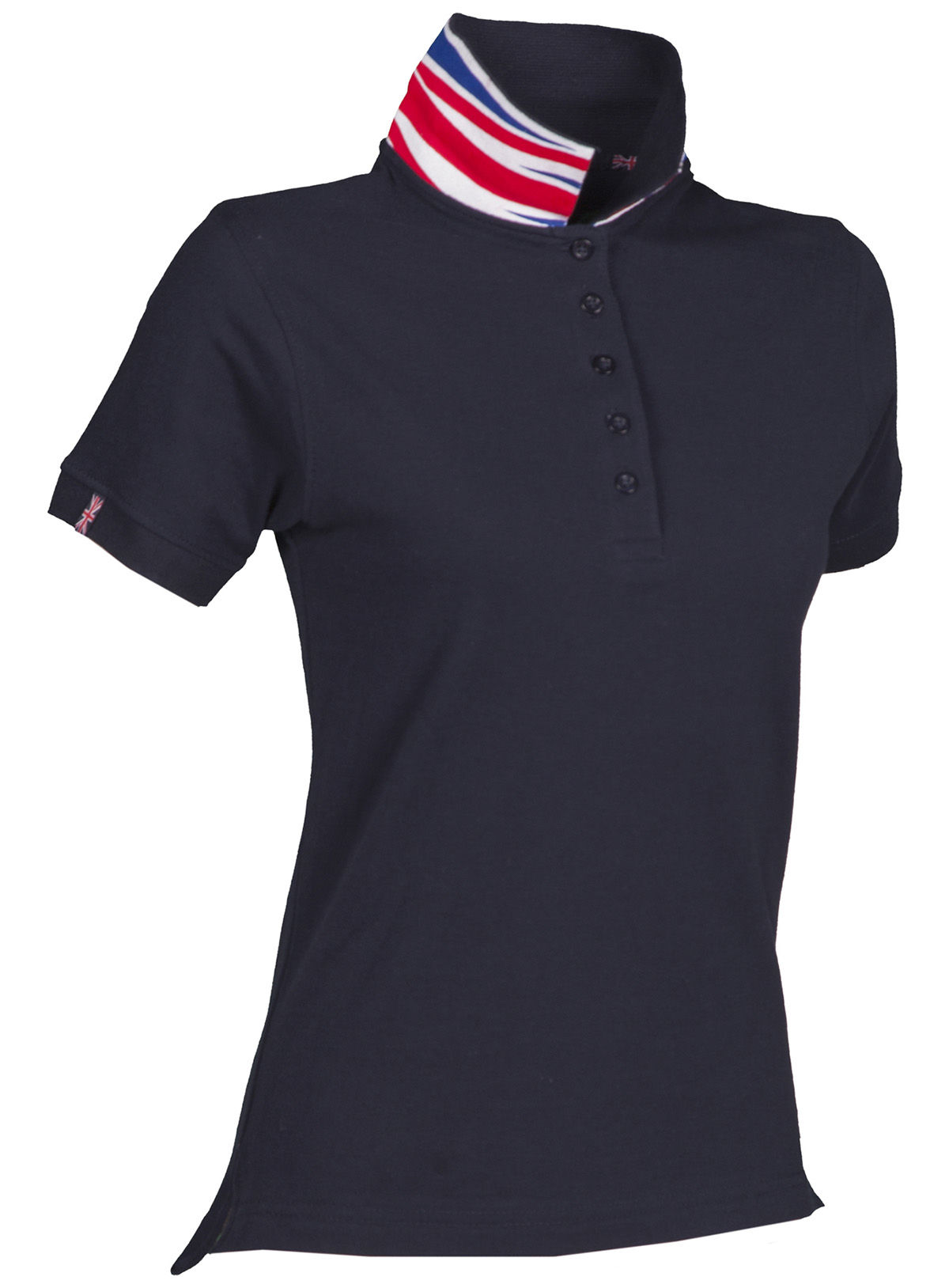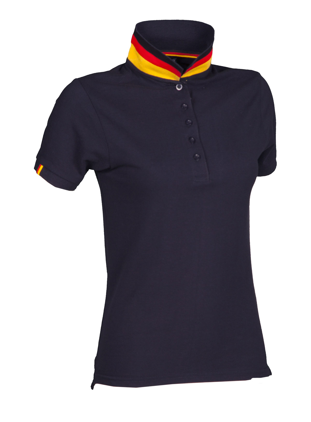 Polo sfiancata donna a manica corta a cinque bottoni in tinta ad effetto perlato, colletto da un lato in tinta, dall’altro lato a contrasto con colori bandiera visibile solo se alzato, bordo manica dx con fine inserto colori bandiera in contrasto, bordo manica a costine, spacchetti laterali colori bandiera, cuciture del collo coperte con nastro in jersey colori bandiera, nastro di rinforzo laterale.