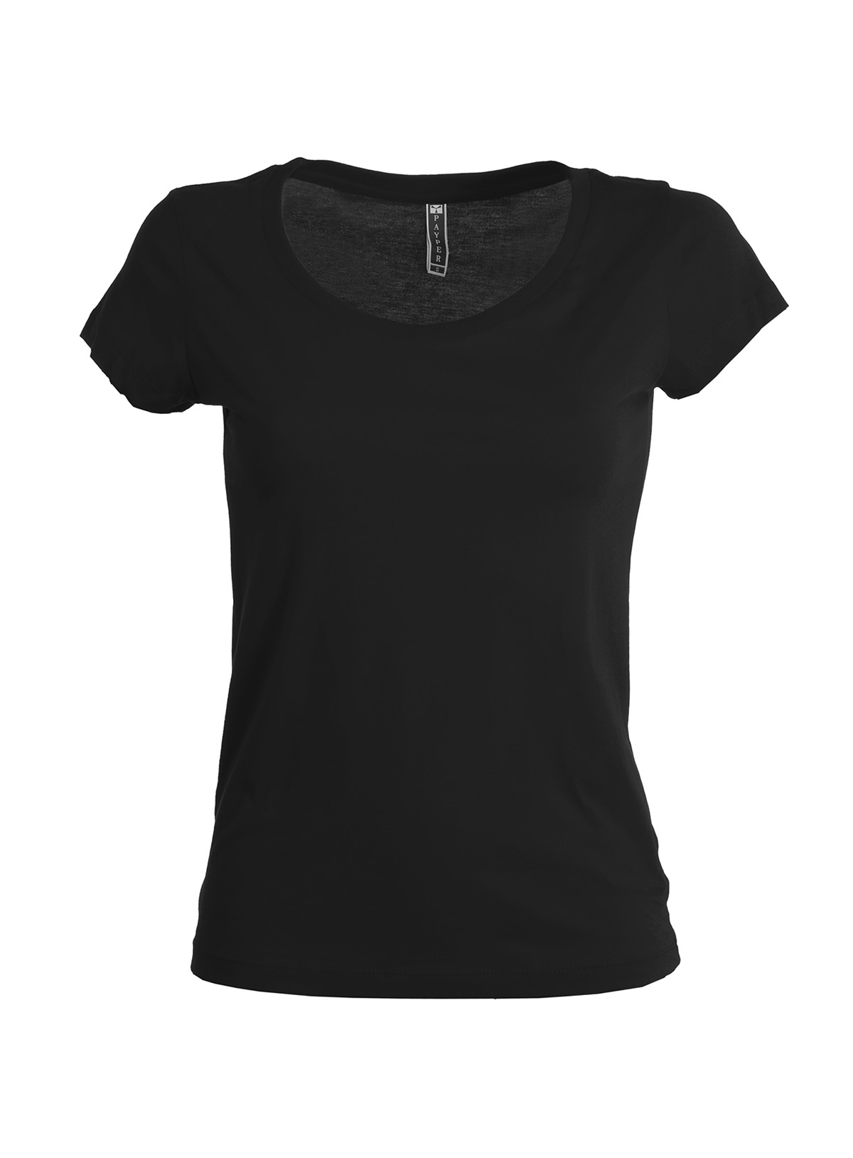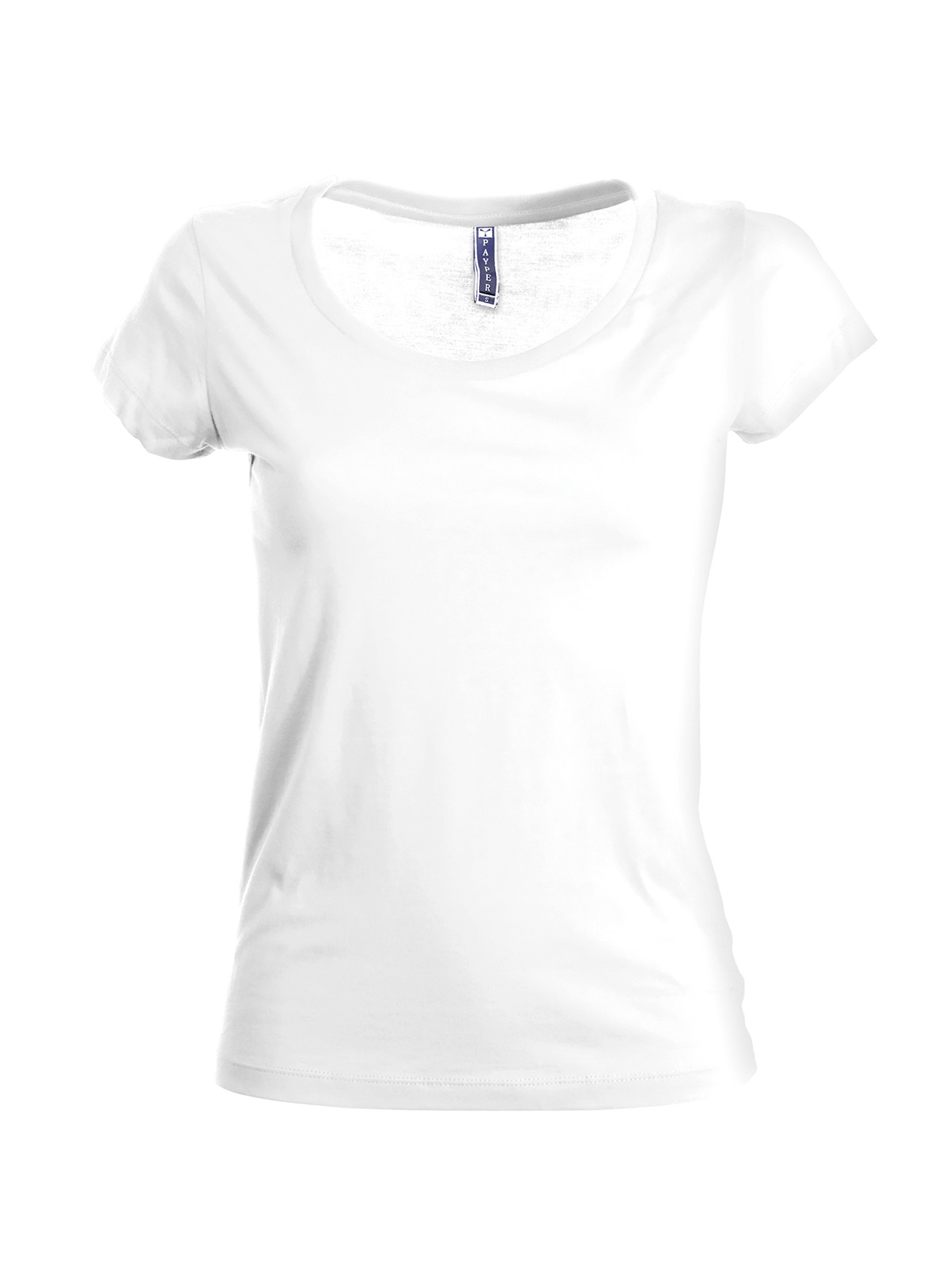 T-shirt manica corta sfiancata da donna con girocollo ampio, basso misto spandex da 1.2 cm, maniche corte, strette e cucitura laterale per una vestibilità più precisa, cuciture a due aghi su spalle e retro collo e nastratura in cotone.