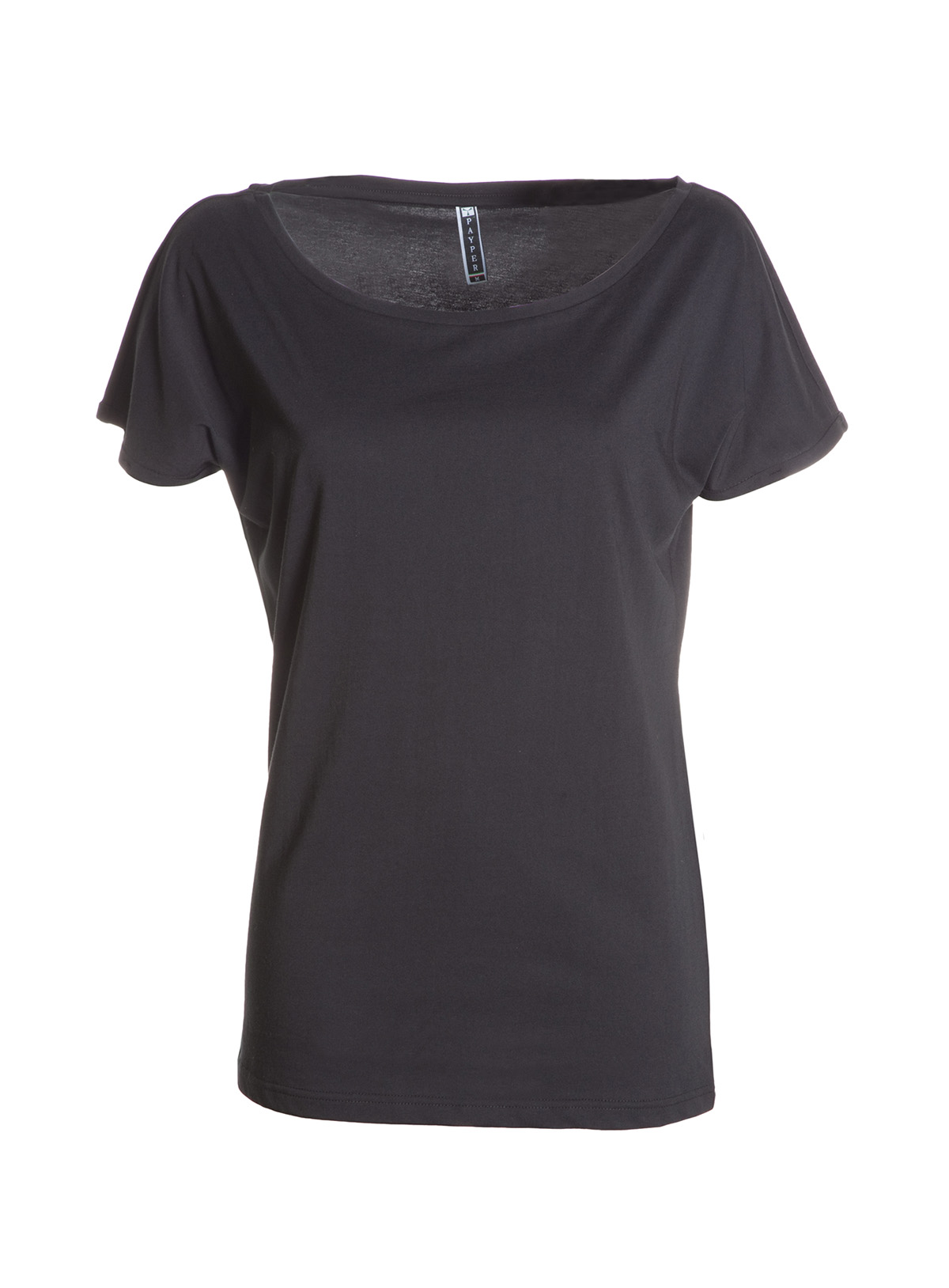 T-shirt manica corta sfiancata da donna con scollo a barchetta, colletto basso da 1cm, maniche corte e strette finite con fine risvolto, cucitura laterale per una vestibilità più precisa.