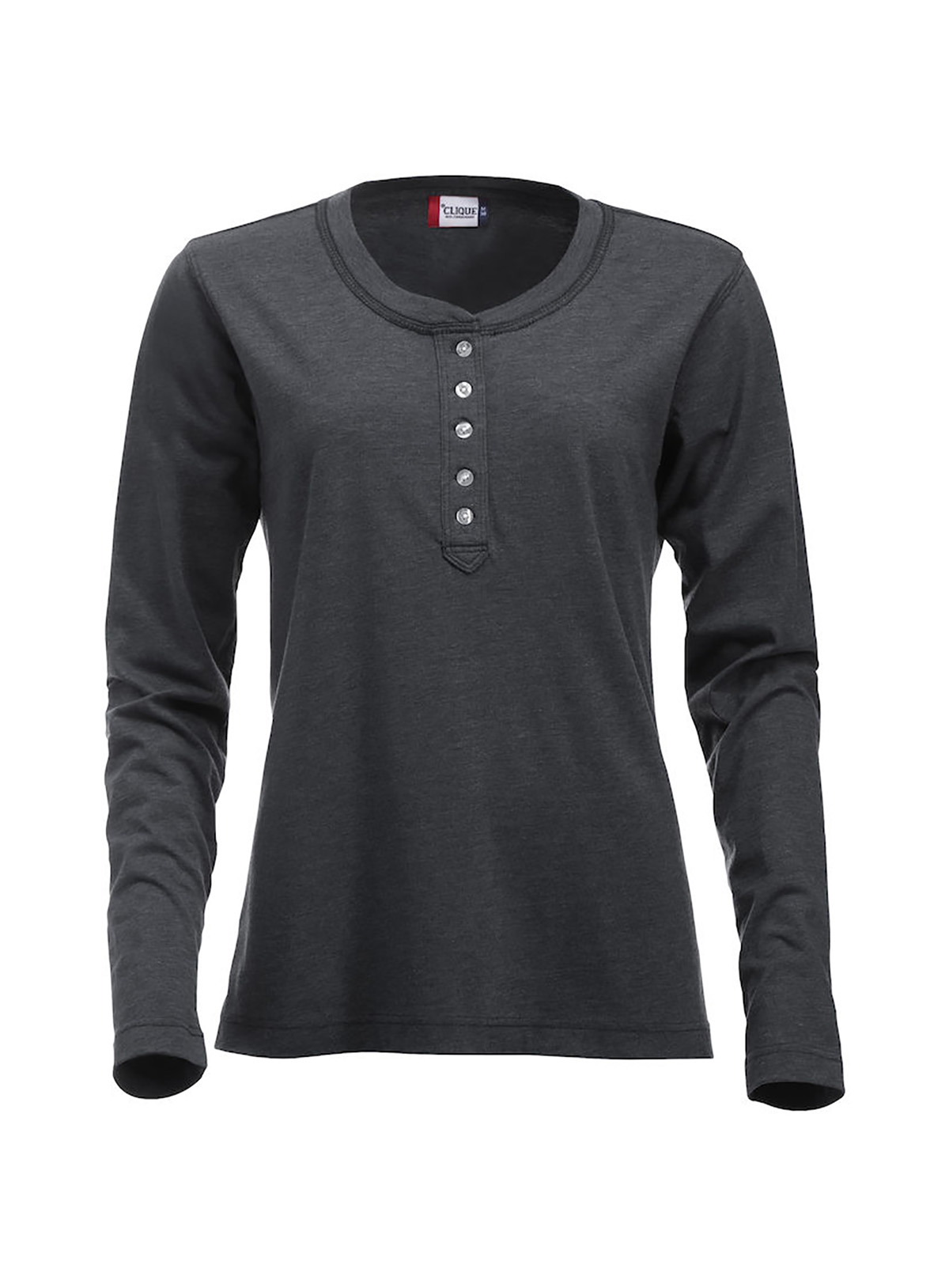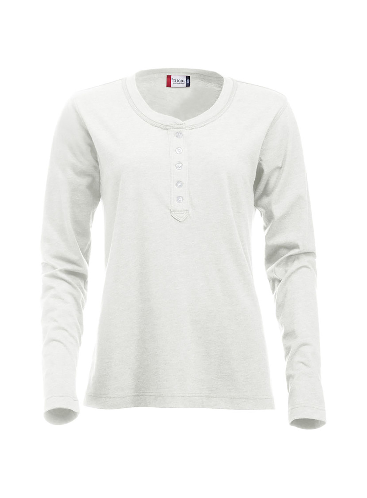 Maglia donna manica lunga in cotone fiammato con colletto college a 5 bottoni. Etichetta ricamata.